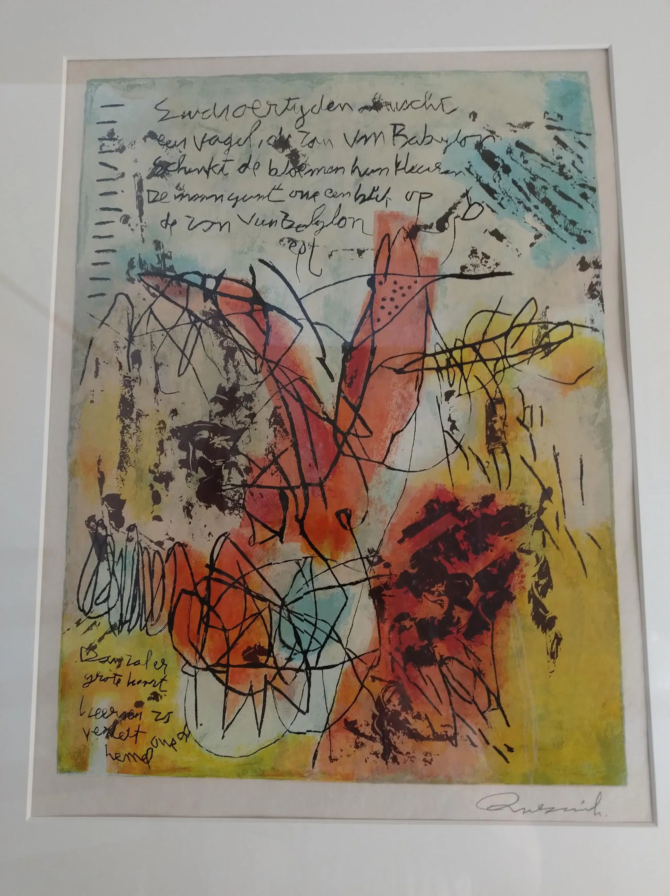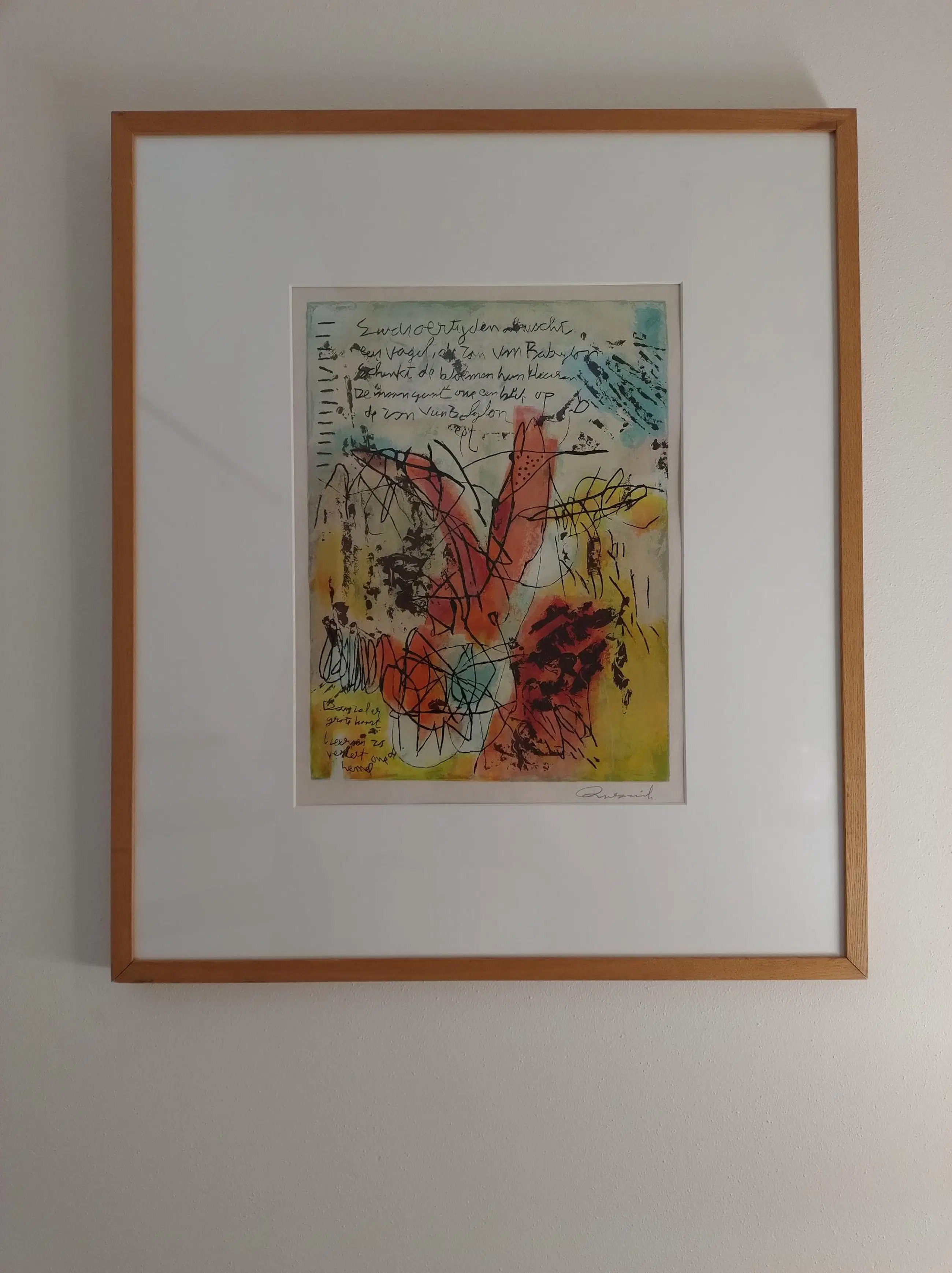 Mooie zeefdruk in houten lijst. Papier is heel iets gebobbeld. Oorspronkelijke galerieprijs €450,-