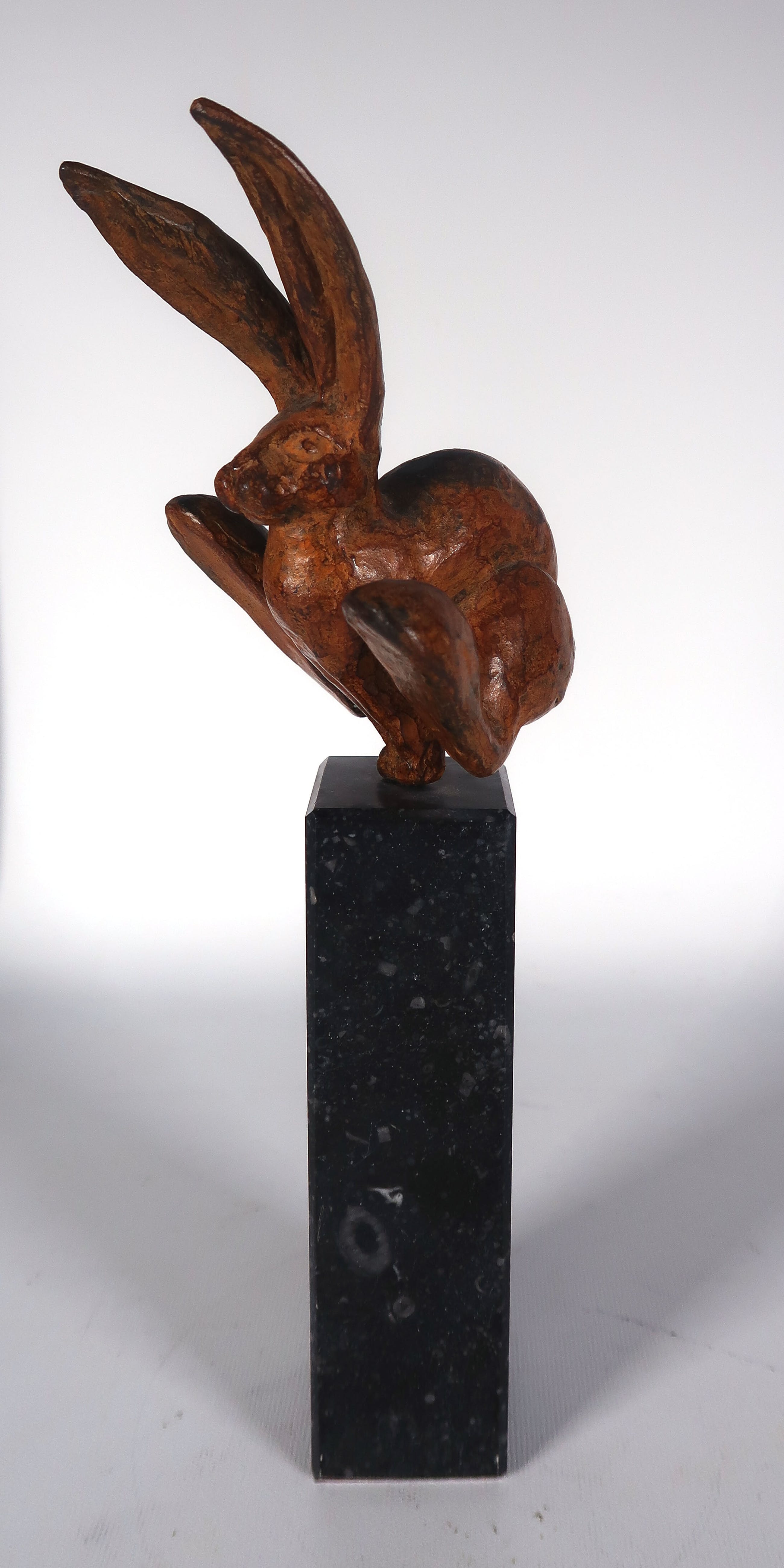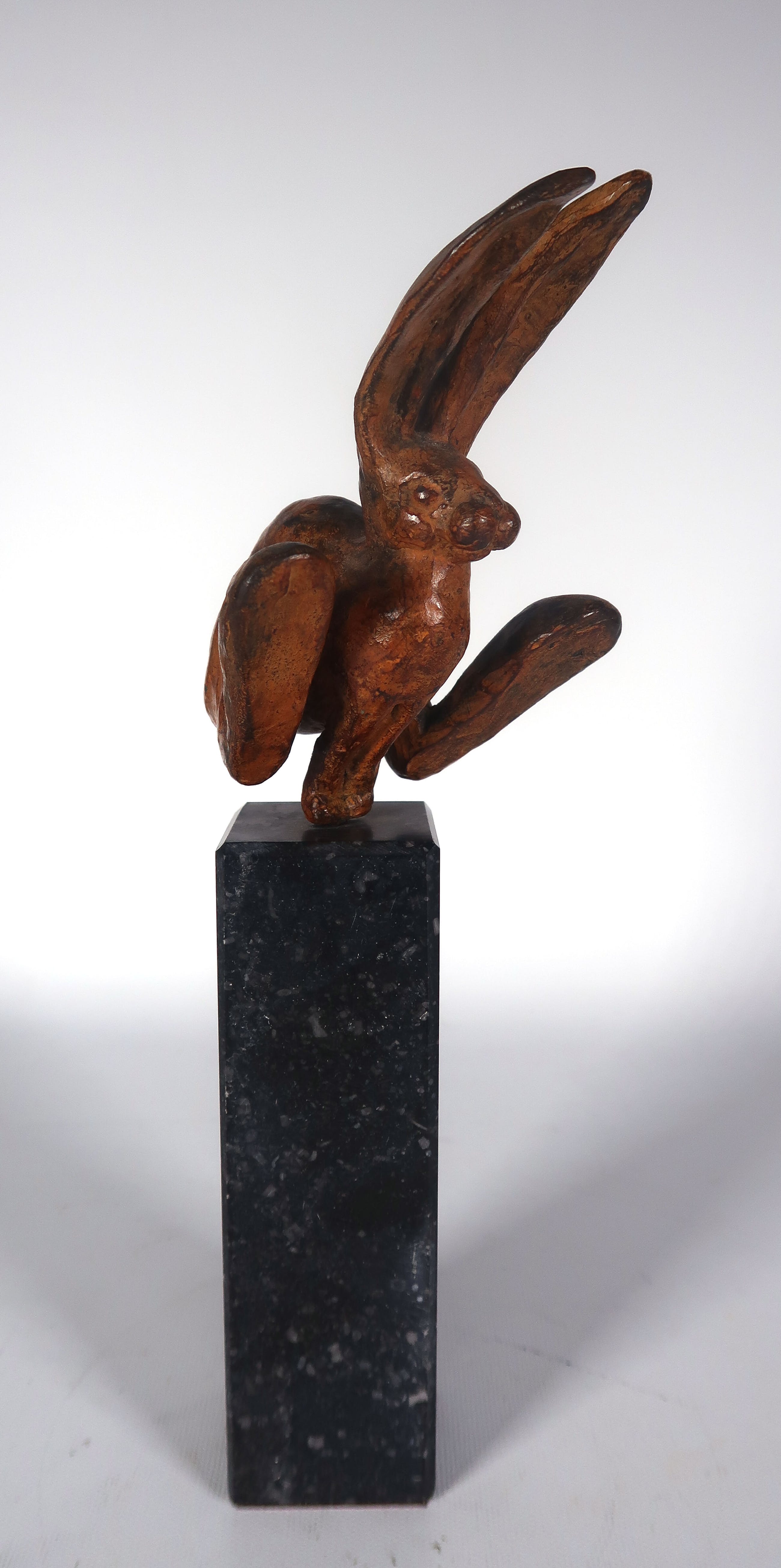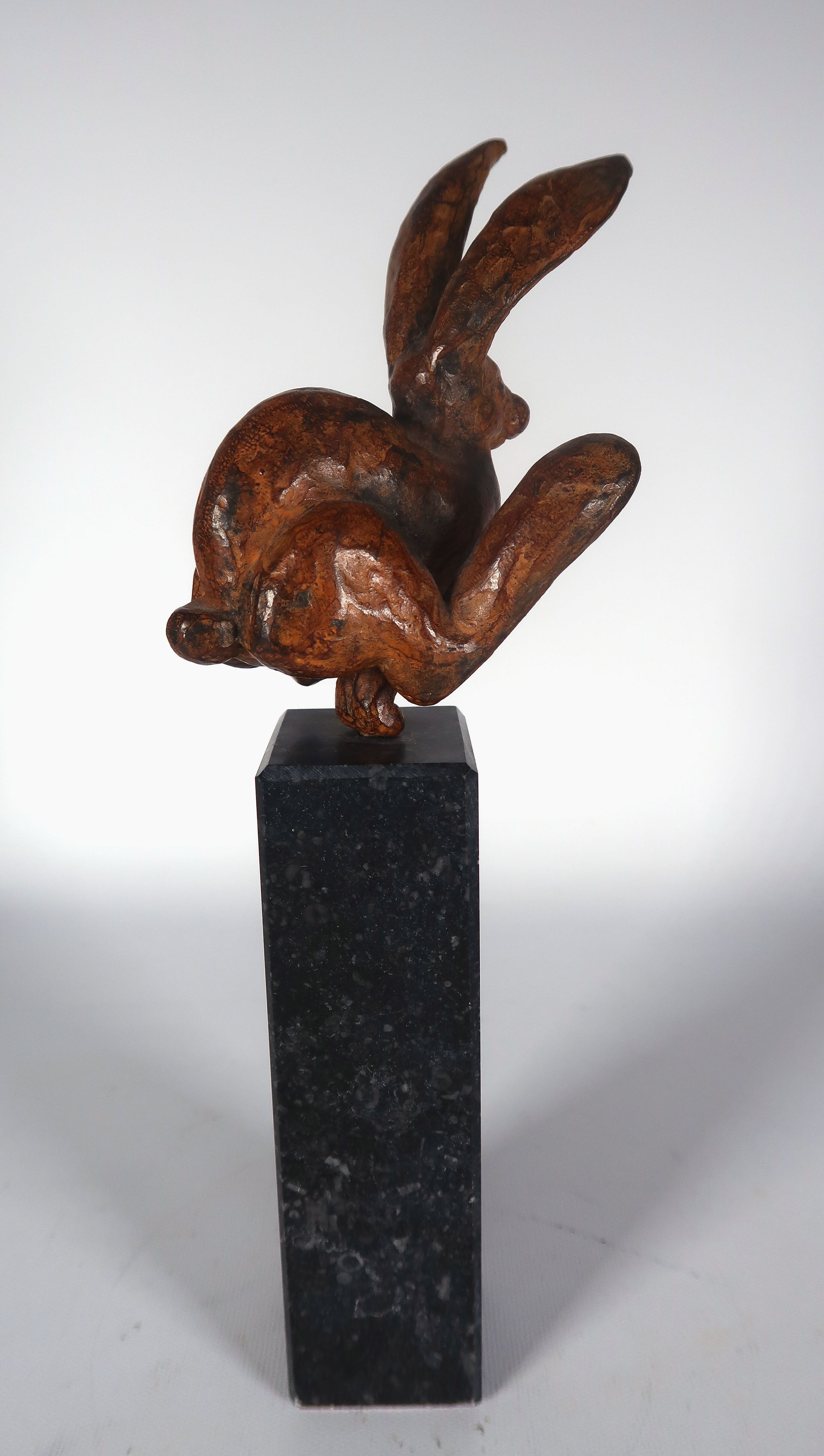 Aandoenlijke haas, uitgevoerd in gepatineerd brons op zwart granieten sokkel. De poot van de haas is voorzien van het monogram ''MK''.