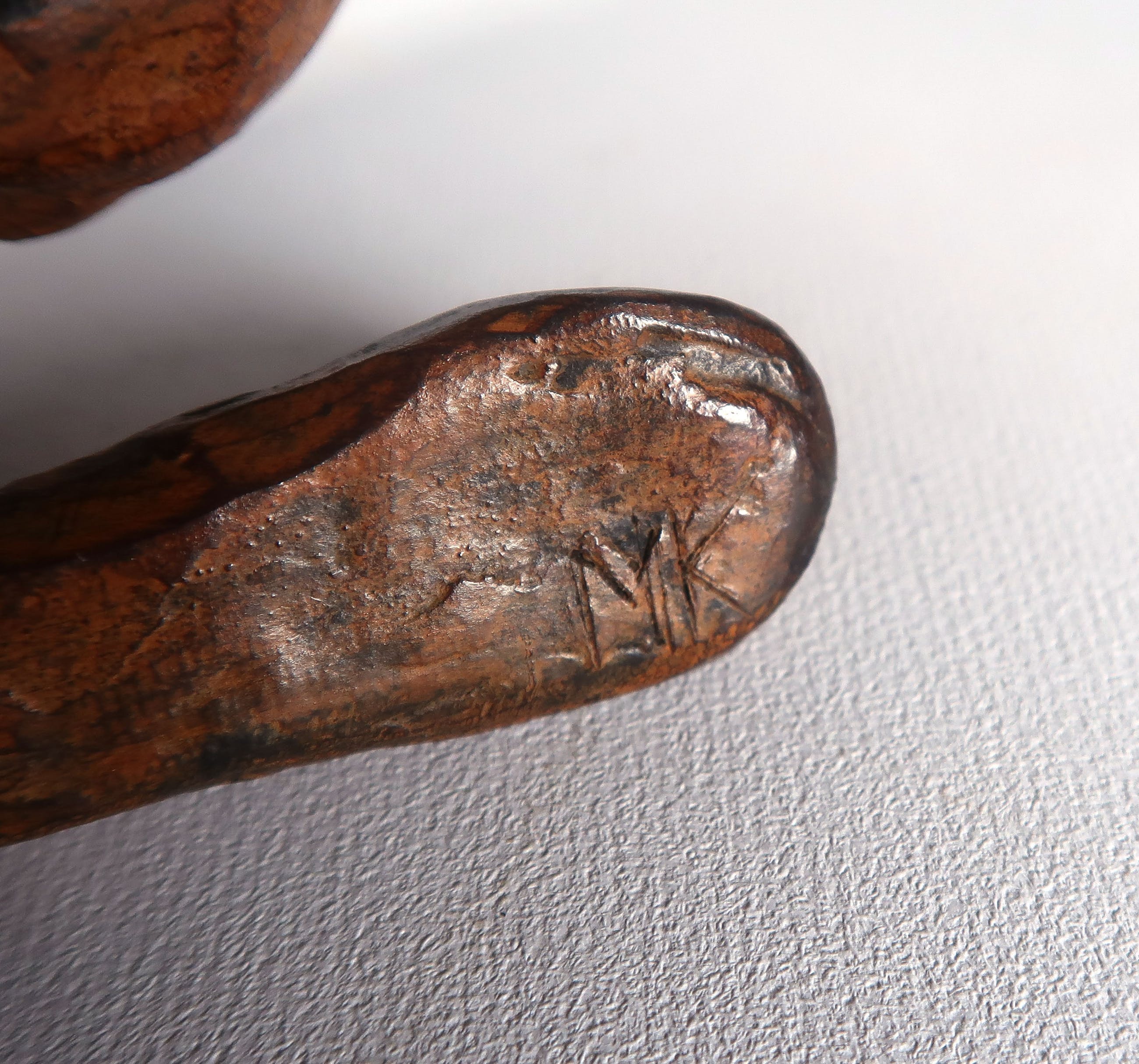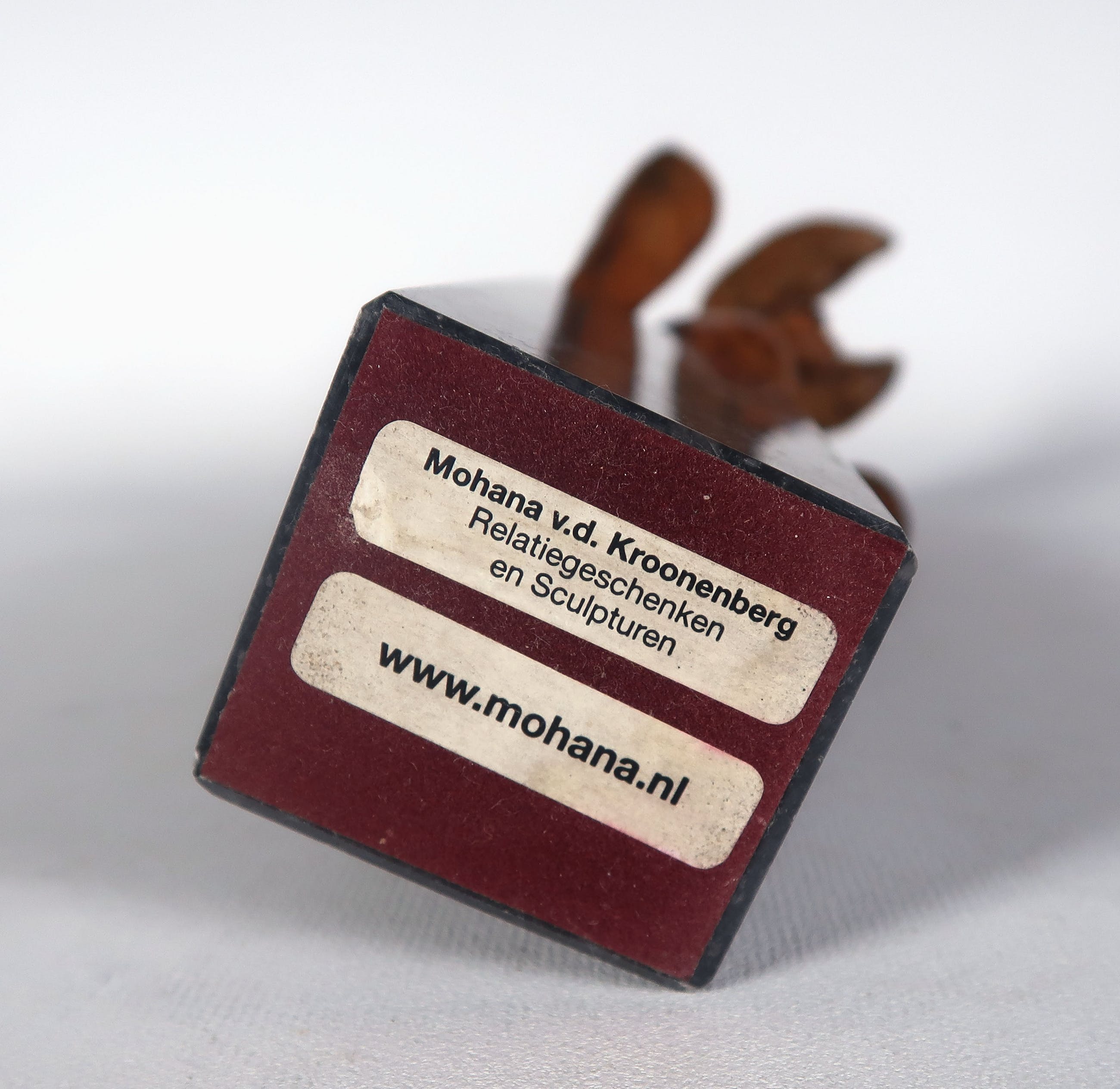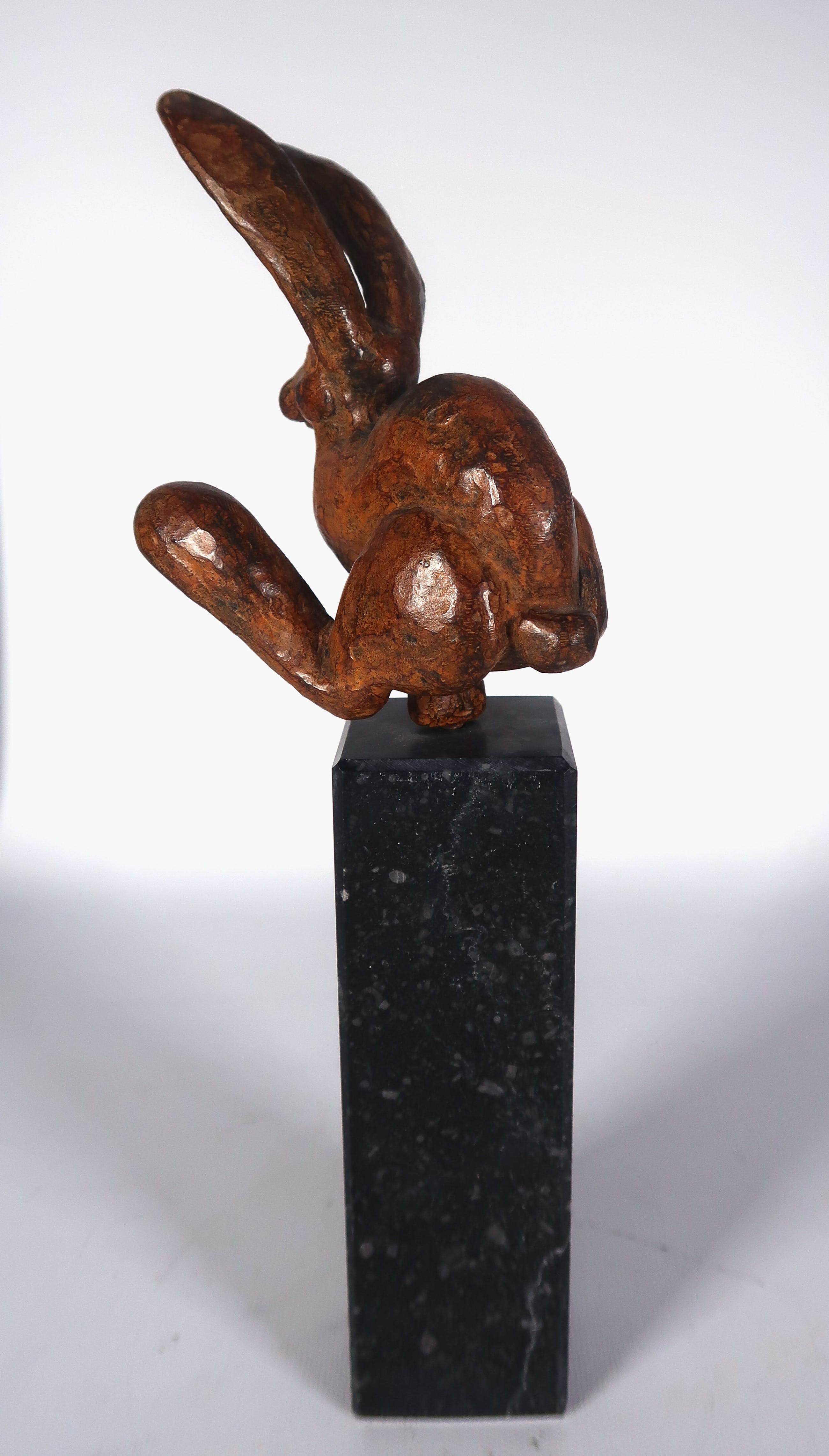 Aandoenlijke haas, uitgevoerd in gepatineerd brons op zwart granieten sokkel. De poot van de haas is voorzien van het monogram ''MK''.