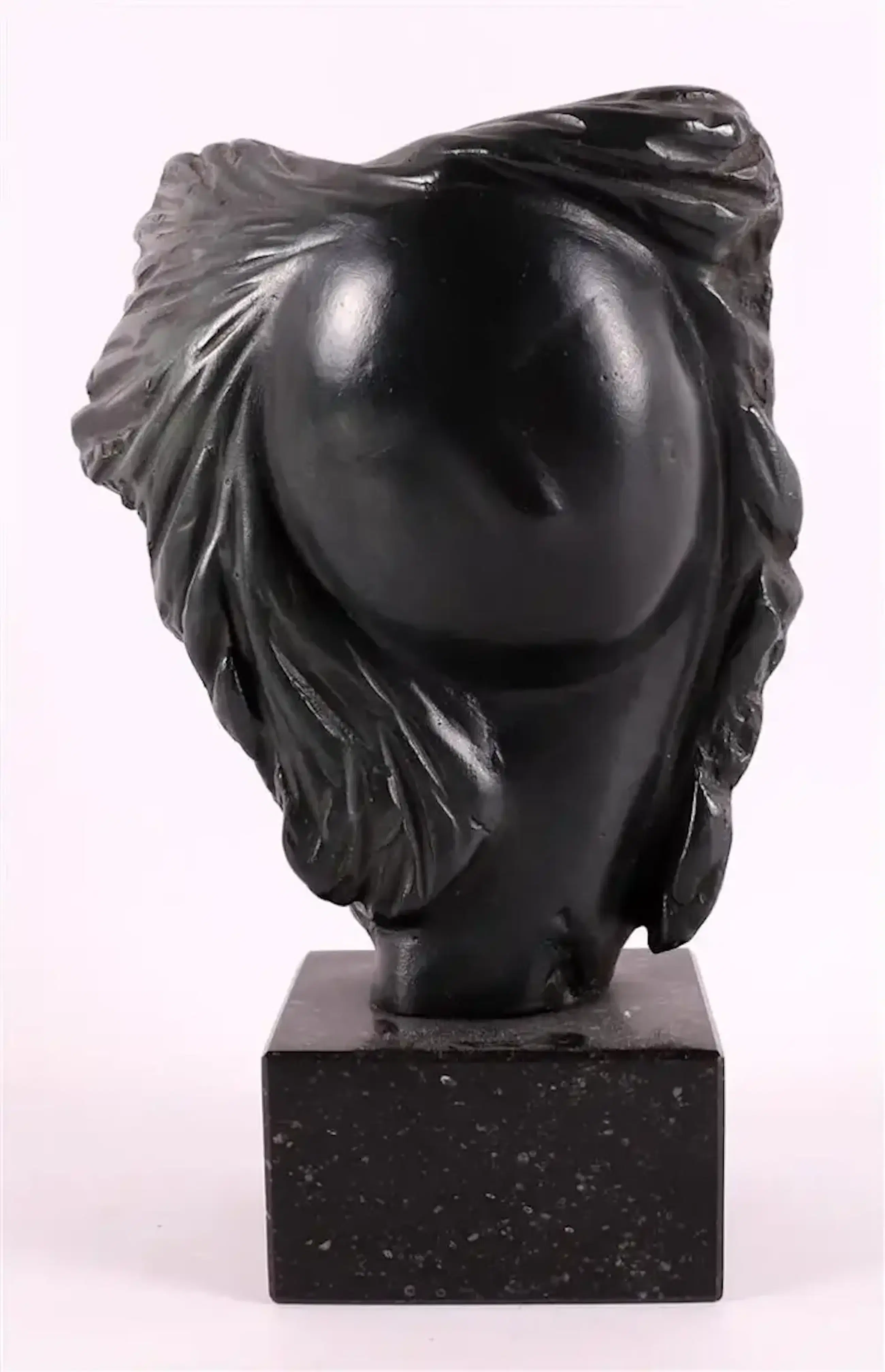 Bronzen sculptuur van Monica van Dael. Donker hoofd van een vrouw op natuurstenen basement. Hoogte beeld incl sokkel: H21cm x b13cm. Sokkel: H5x b8cm. Het beeld is onderaan voorzien van een monogram, van de kunstenares. De authenticiteit van het aangeboden werk wordt volledig gegarandeerd. Een certificaat van echtheid kan, op aanvraag, worden gemaild..