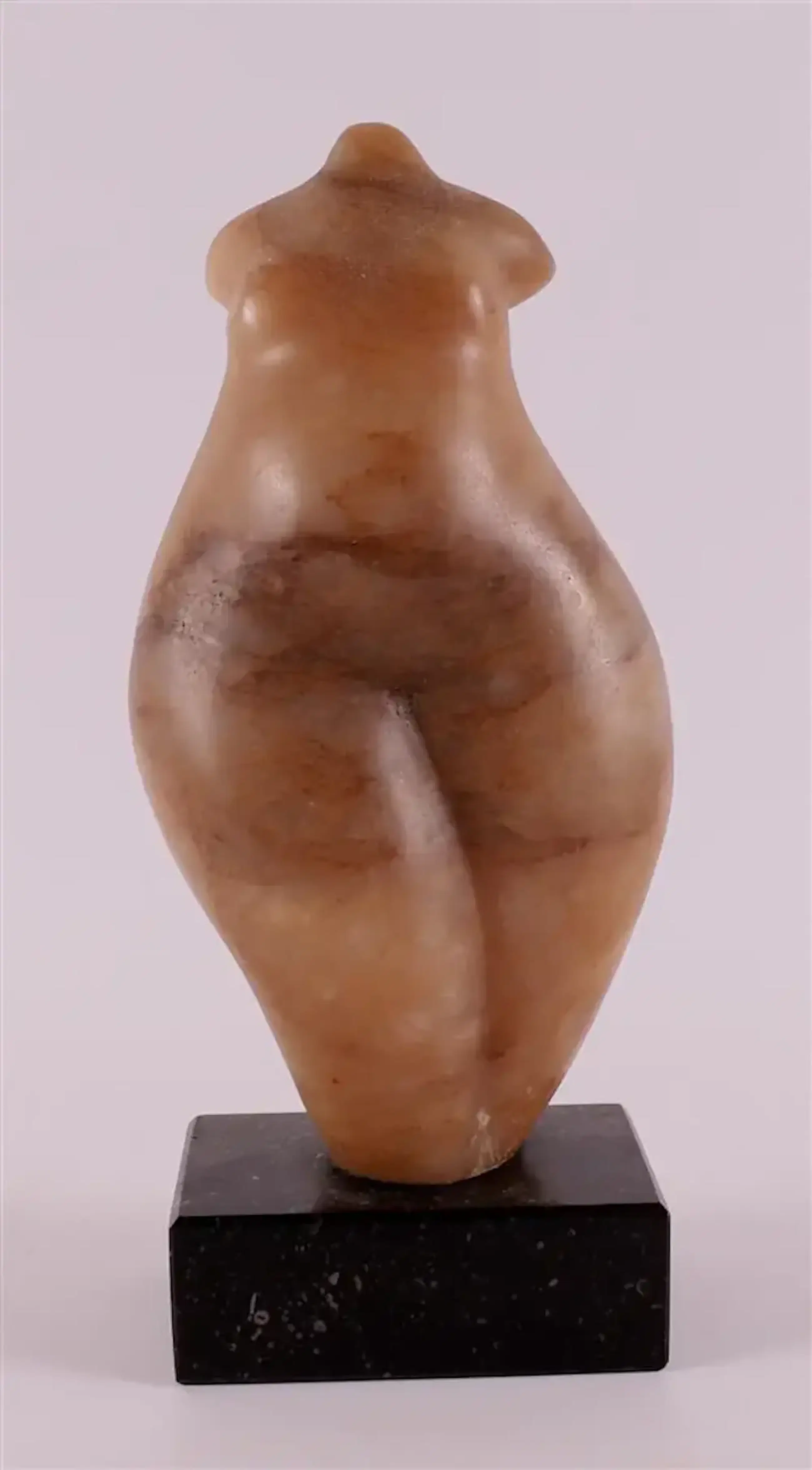 Beeld van Monica van Dael. Een albasten torso op natuurstenen basement. Hoogte beeld incl sokkel: H22cm x 20 x d10cm. Het beeld is onderaan voorzien van een monogram, van de kunstenares. De authenticiteit van het aangeboden werk wordt volledig gegarandeerd. Een certificaat van echtheid kan, op aanvraag, worden gemaild.
