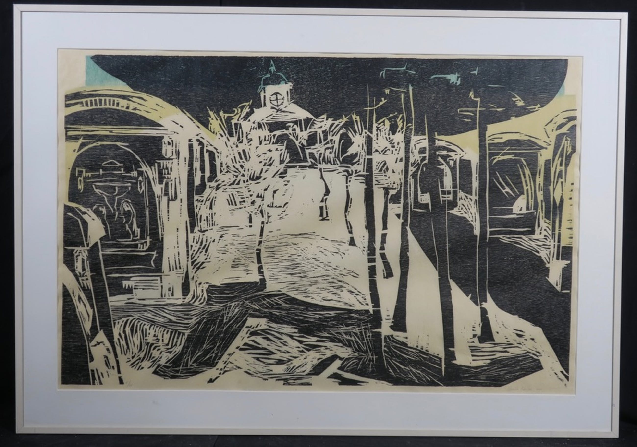 Conditie: In goede staat, maar het is licht en egaal vergeeld (haast onvermijdelijk bij dit fragiele papier) en met golving in het blad (zit niet strak genoeg ingelijst)