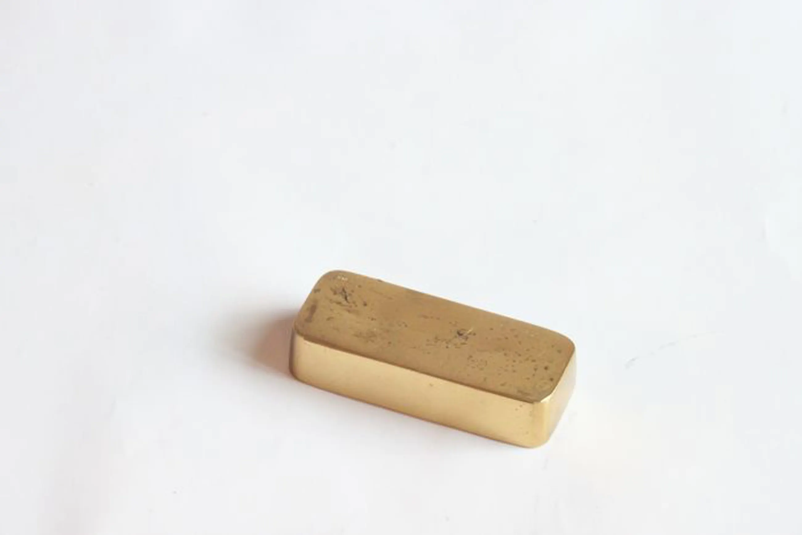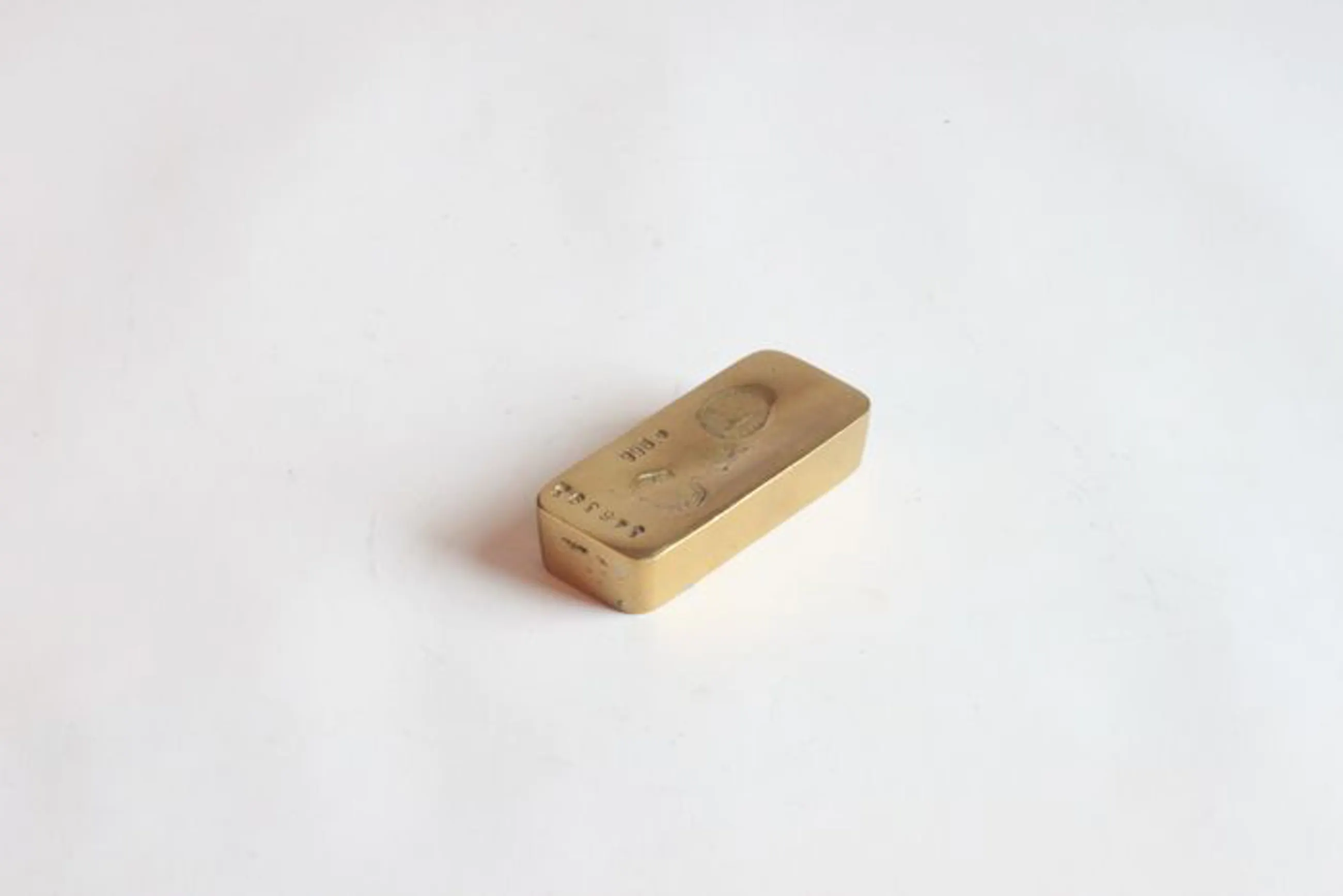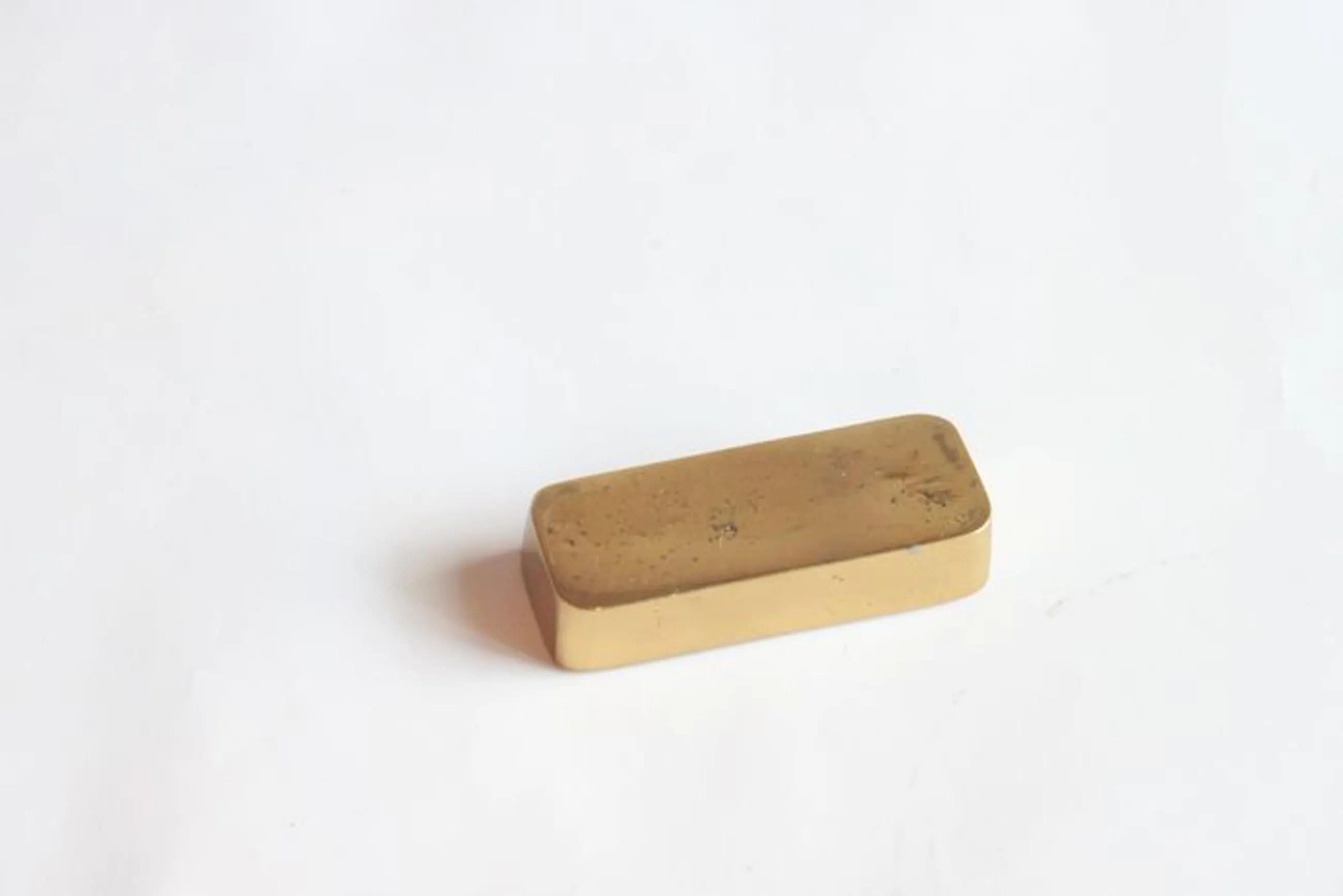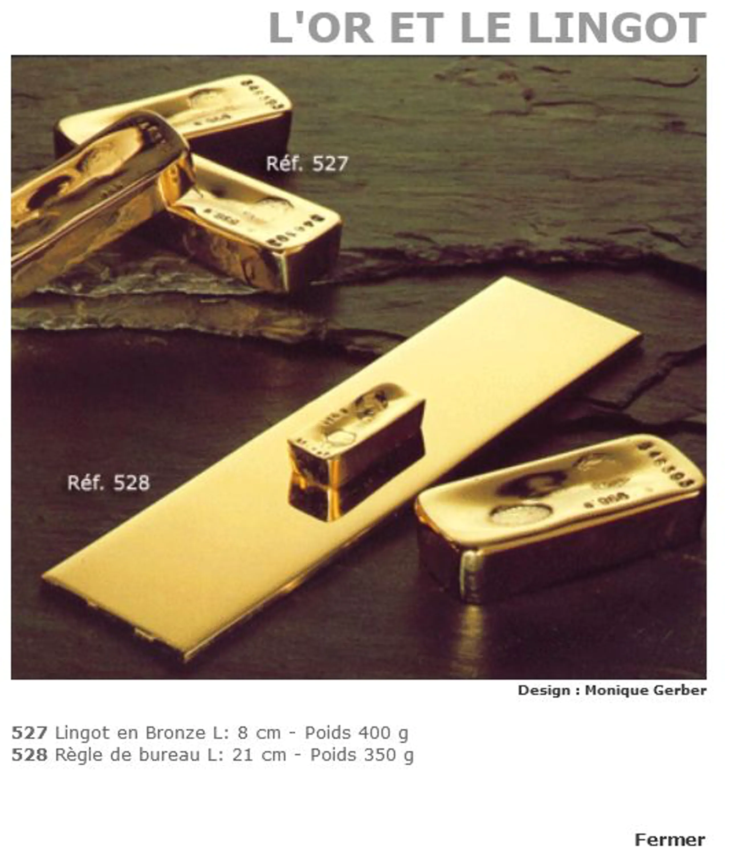 Bronzen bullion door Monique Gerber, L'art du bronze. Deze behoort tot de serie "L'or et le lingot" model 527. Nummers 346393 en 996.9 zoals te zien in de catalogus. Gemodelleerd naar een "Comptoir Lyon Allemand - S.Michel Essayeur" frans gouden bar. (zie Mont Saint Michel) silhouet op de bar.