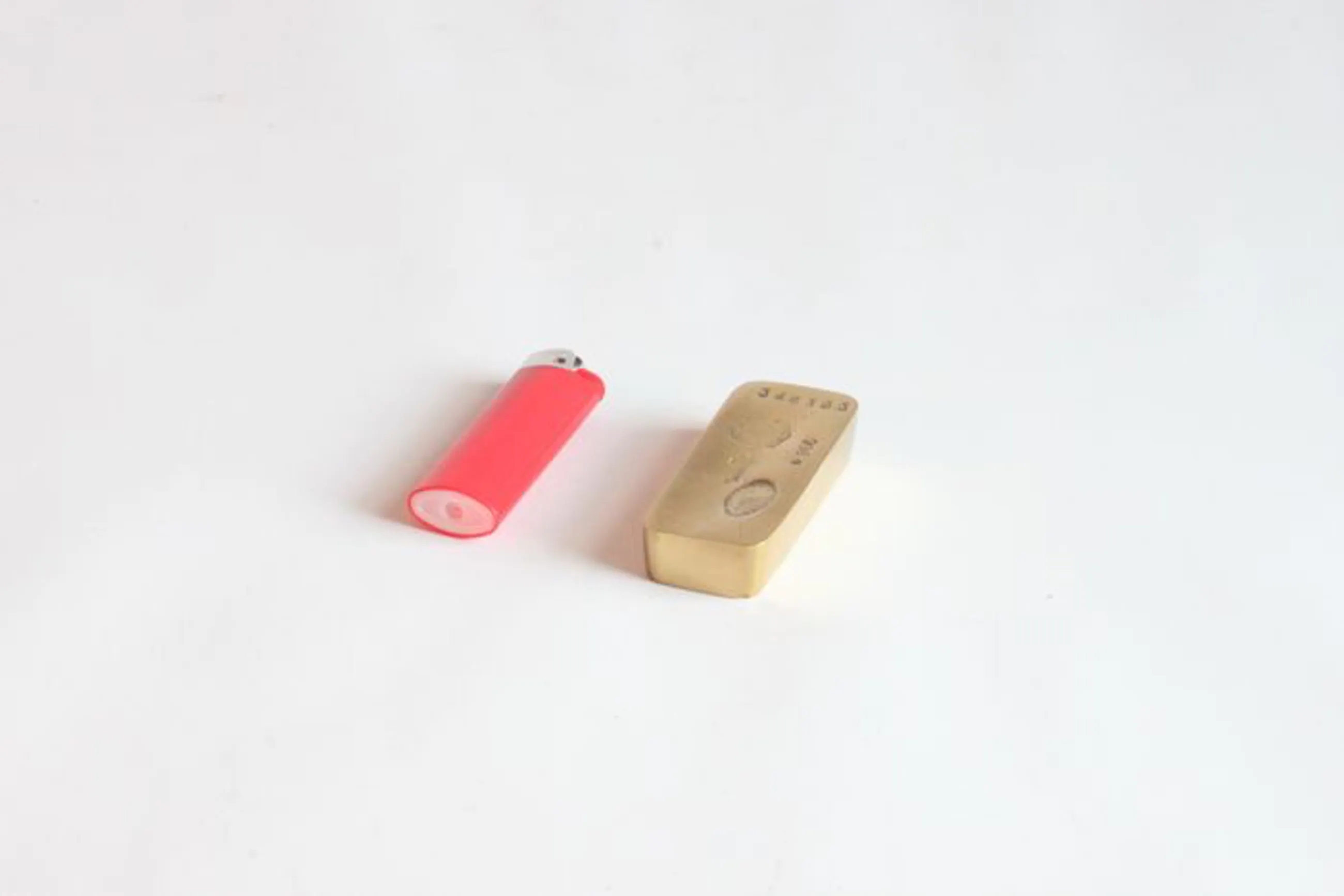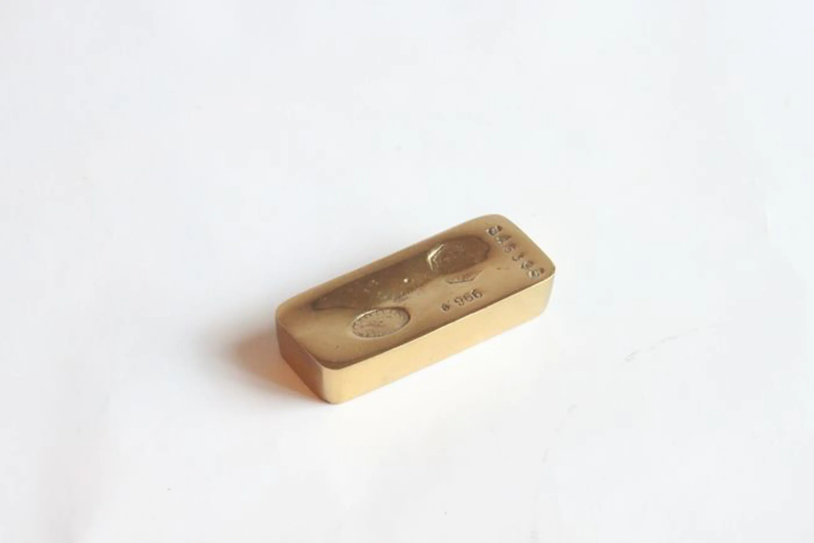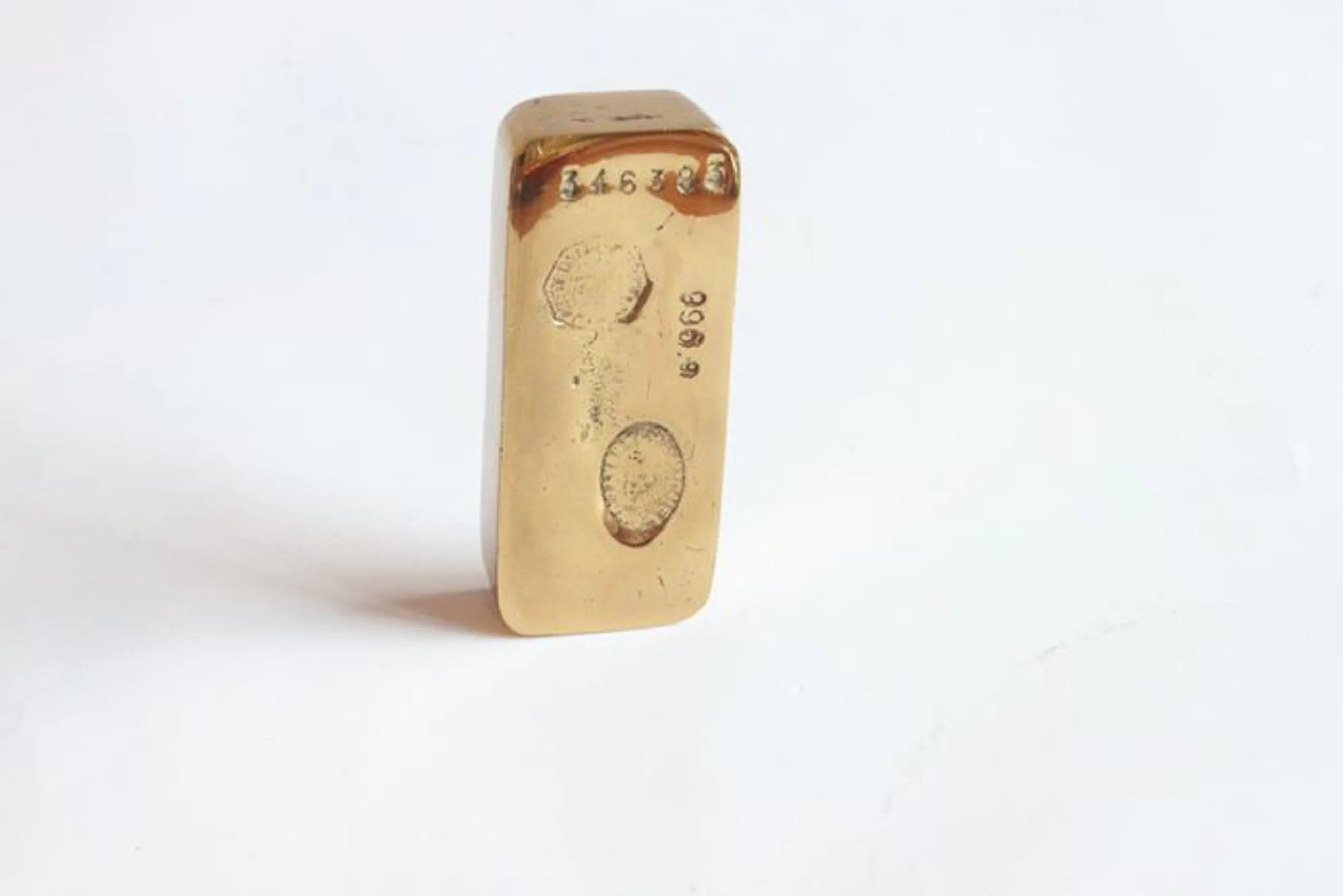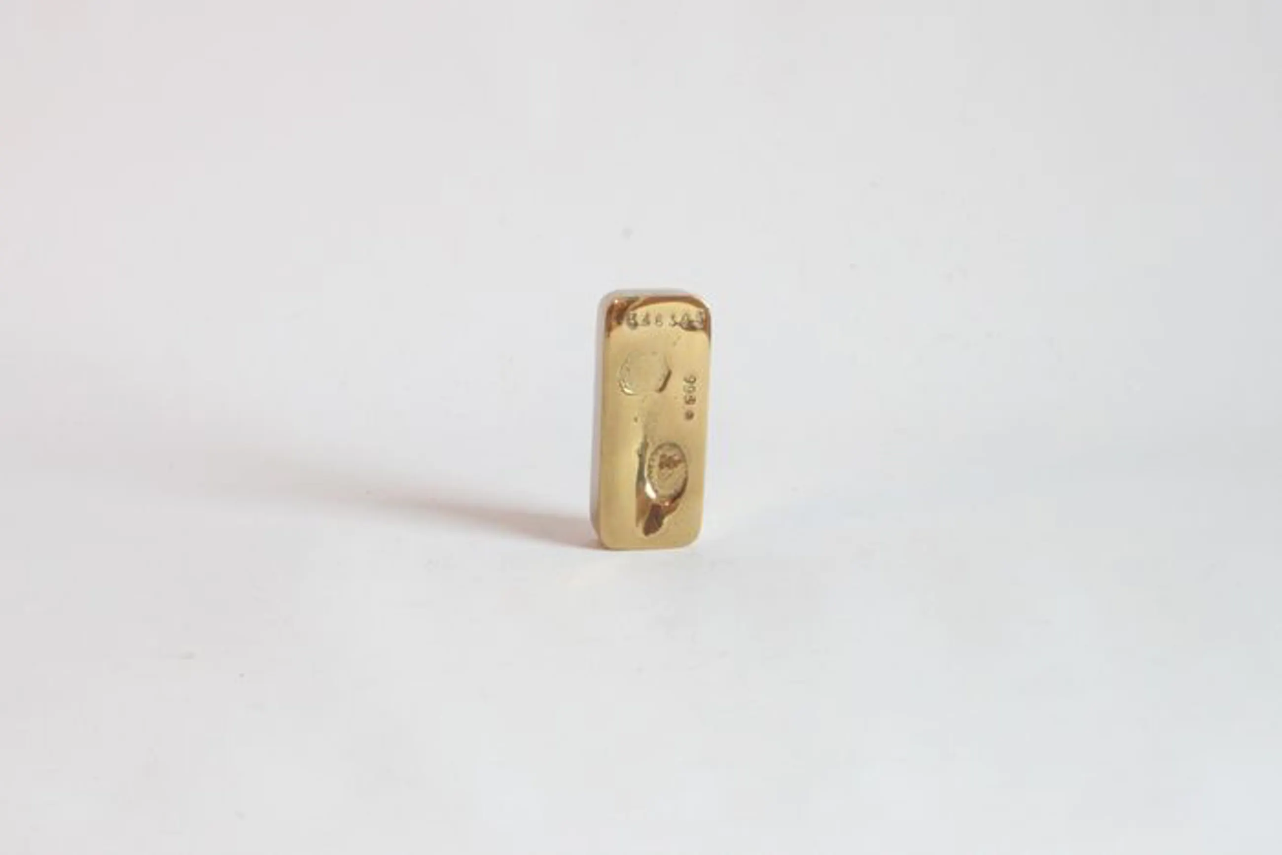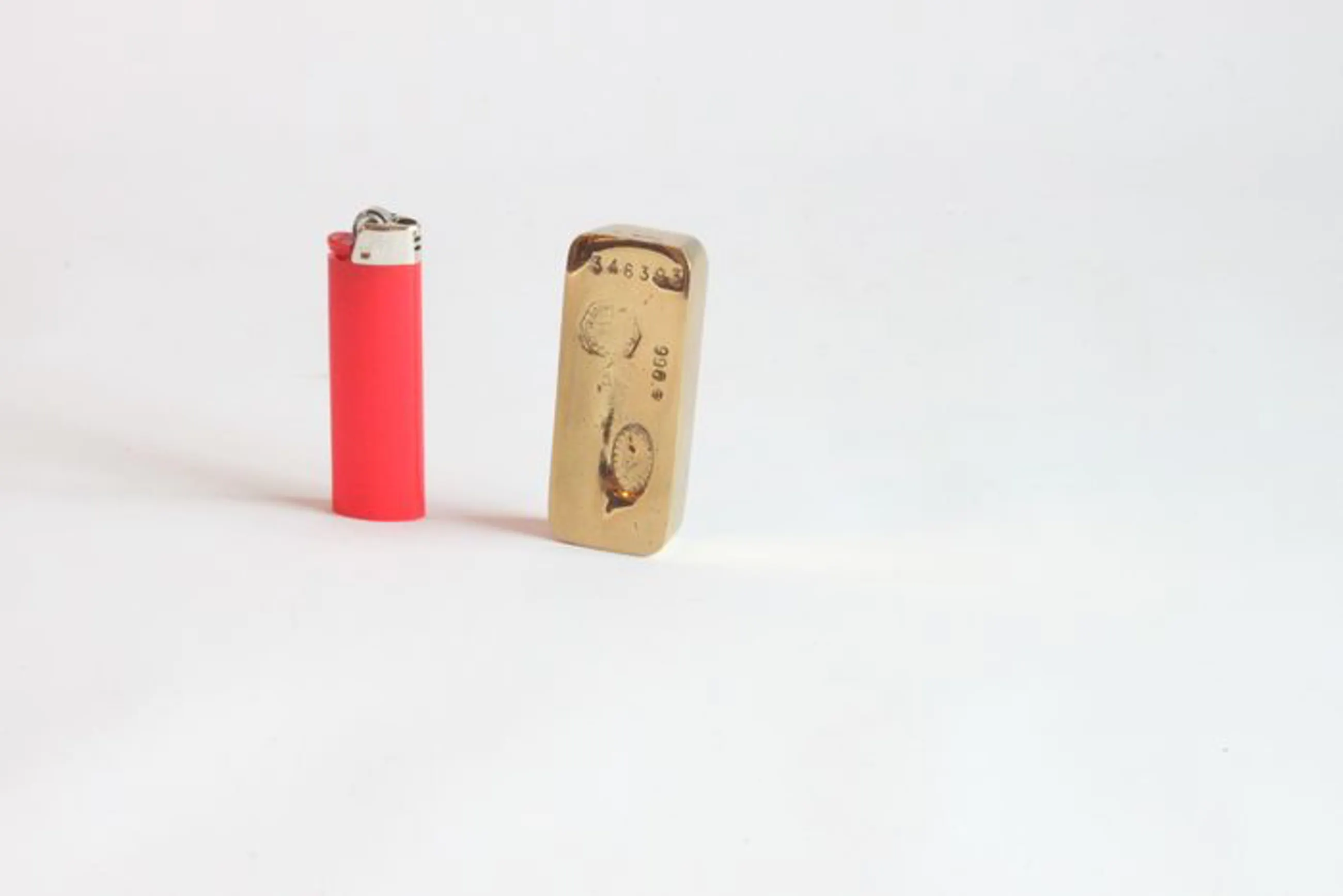 Bronzen bullion door Monique Gerber, L'art du bronze. Deze behoort tot de serie "L'or et le lingot" model 527. Nummers 346393 en 996.9 zoals te zien in de catalogus. Gemodelleerd naar een "Comptoir Lyon Allemand - S.Michel Essayeur" frans gouden bar. (zie Mont Saint Michel) silhouet op de bar.