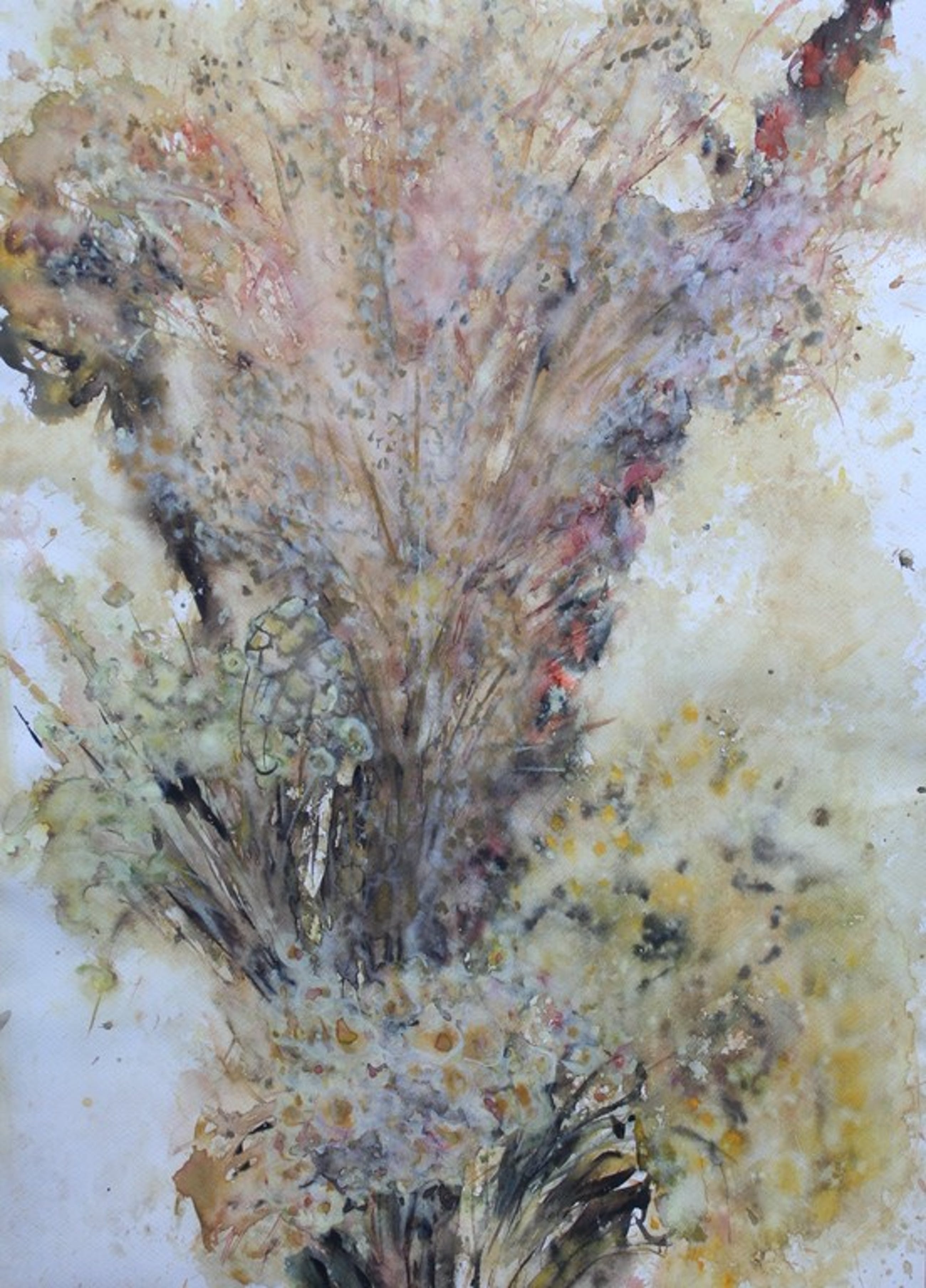 Grote aquarel op aquarelpapier van Monique Polak. Rondom zit een kader van een eerdere inlijsting, deze is 1,5 cm smal. Gesigneerd binnen het kader met monogram. De afmeting is 72 x 52 cm.