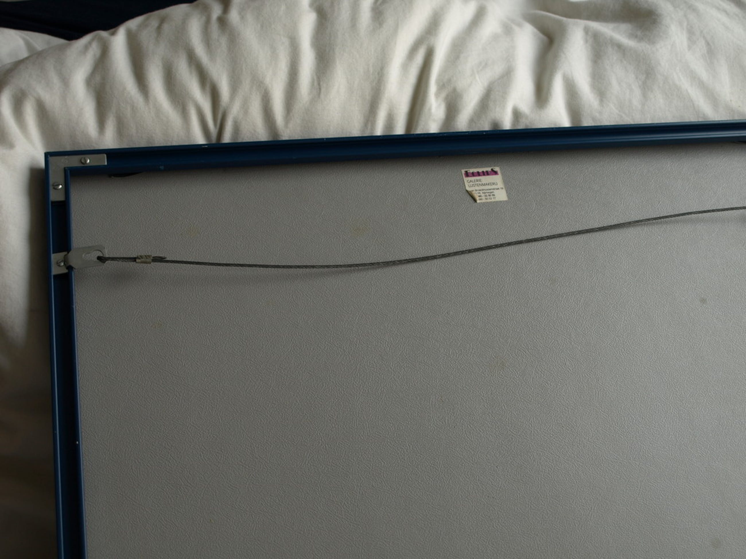 Ingelijst: In een blauwe metalen lijst met een blauw passe-partout en glasplaat.