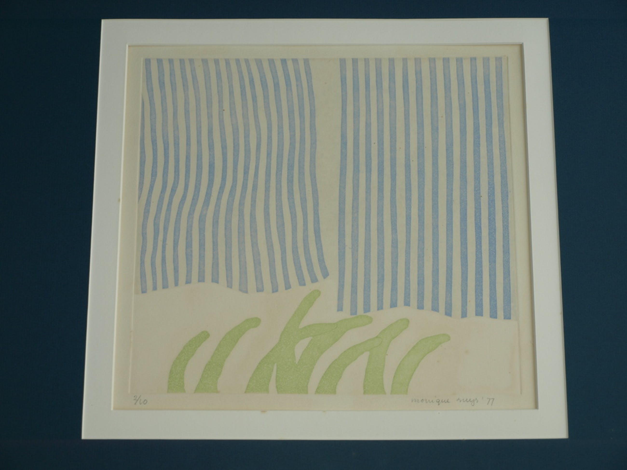 Een grote ingelijste zeefdruk uit 1977 van de Nederlandse kunstenares Monique Suys.