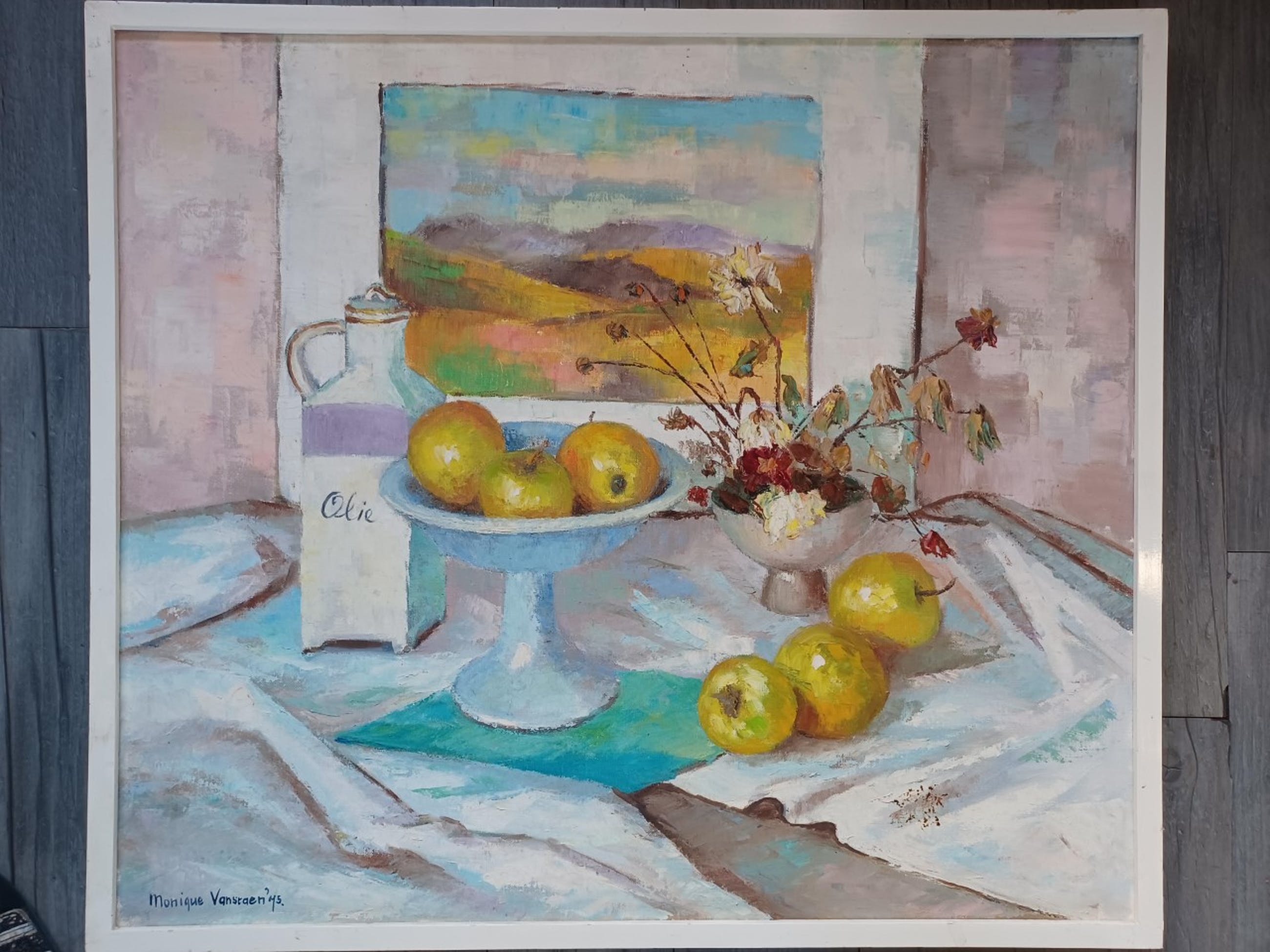 Zeer fraai stilleven dat in 1977 is aangekocht door de gemeente Soest. Monique Vanstaen is in 1931 geboren in Amsterdam. Ze werkte vanuit Hilversum dus veel van haar werken zullen daar in de buurt gemaakt zijn. Ze was zeer veelzijdig, ze schilderde met olieverf maar maakte ook hele mooie aquarellen. Ze schilderde stadsgezichten, landschappen, portretten, stillevens en ook taferelen uit het alledaagse leven.