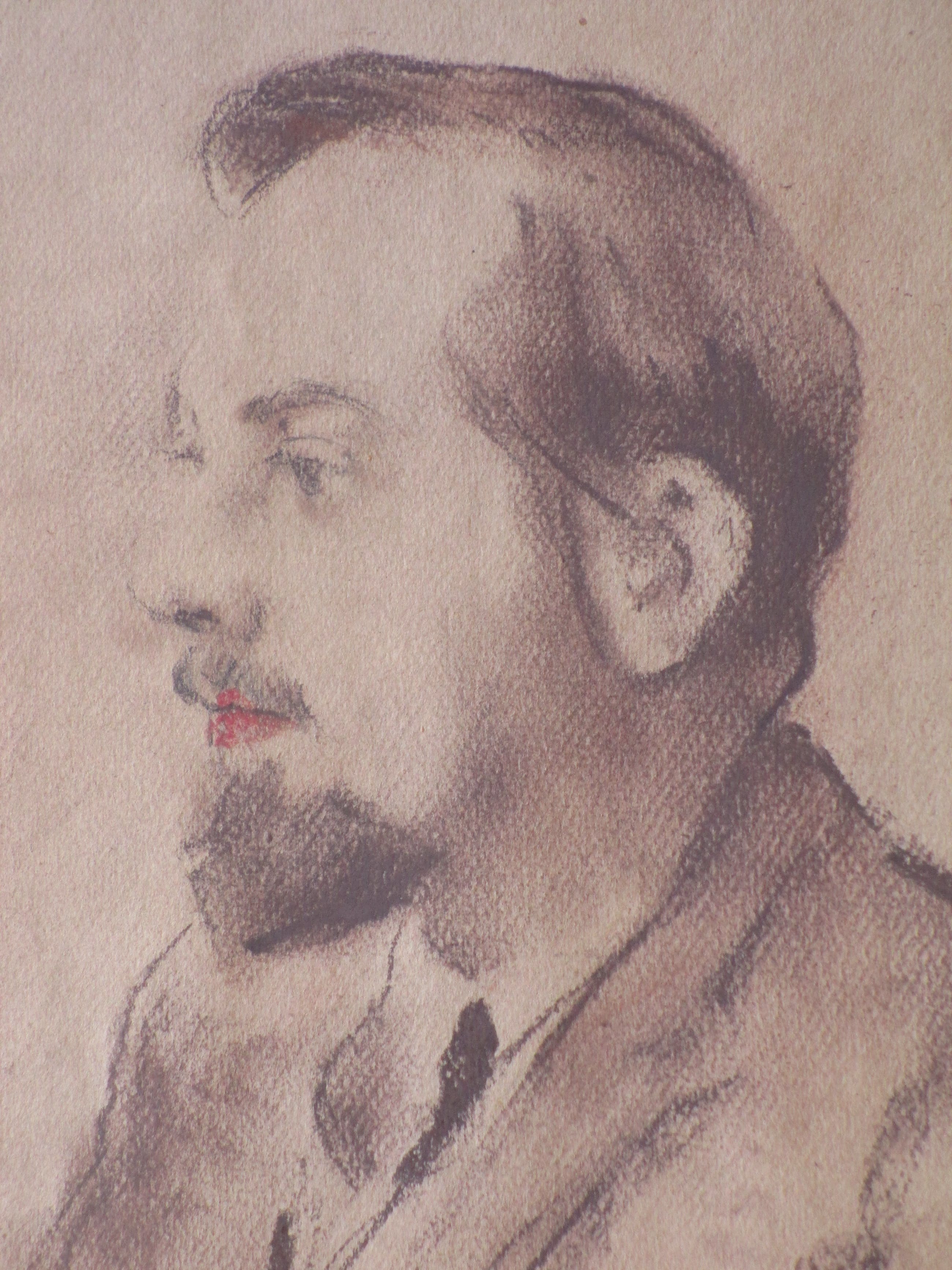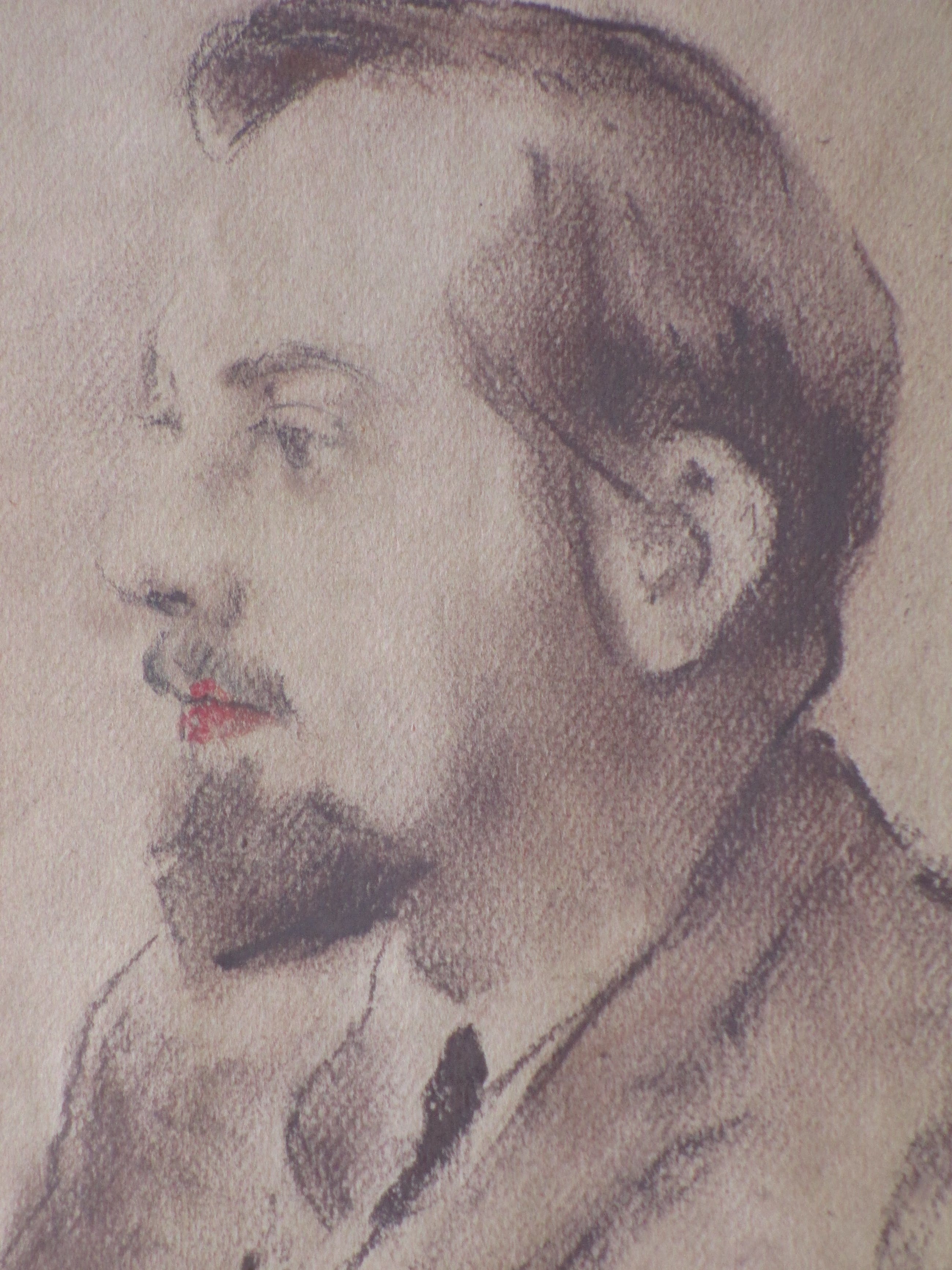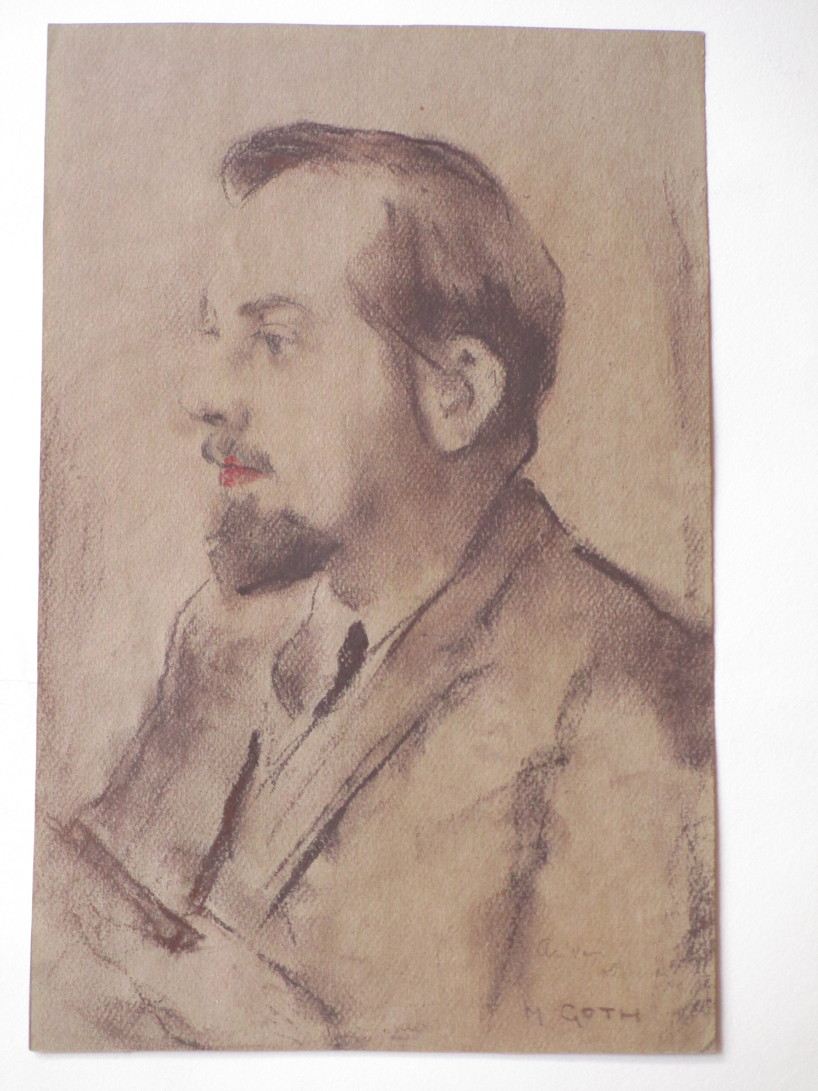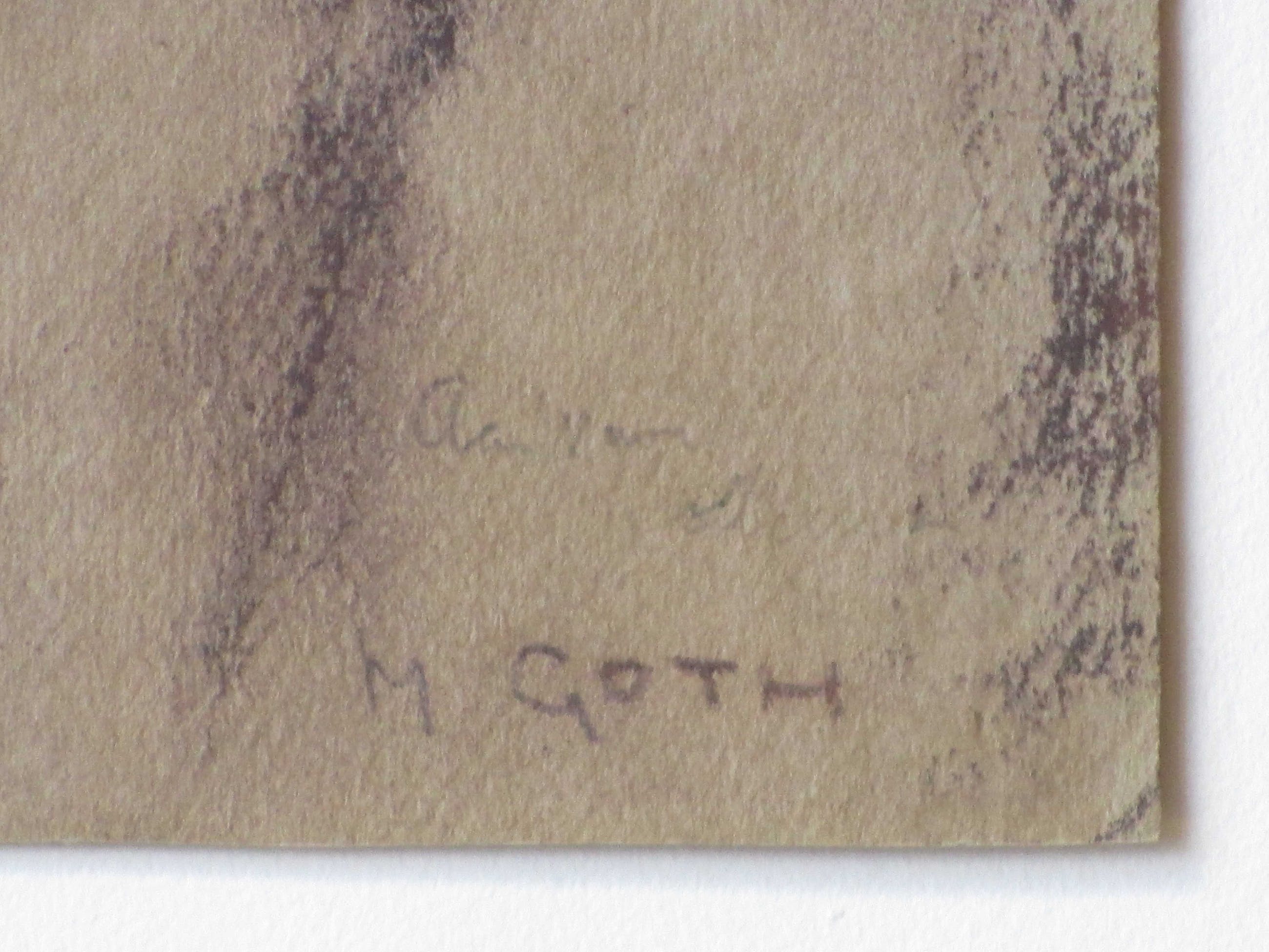Tekening door Moricz Goth Voorstelling van een portret, mogelijk een zelfportret (veel gelijkenis met oude foto's en eerdere voorbeelden) Losbladig, beeldmaat 34x22 Gesigneerd in potlood r.o.: 'M Goth' Onduidelijke annotatie in potlood r.o.: ' Aan Mevr Esth.....?' Authenticiteit volledig gegarandeerd