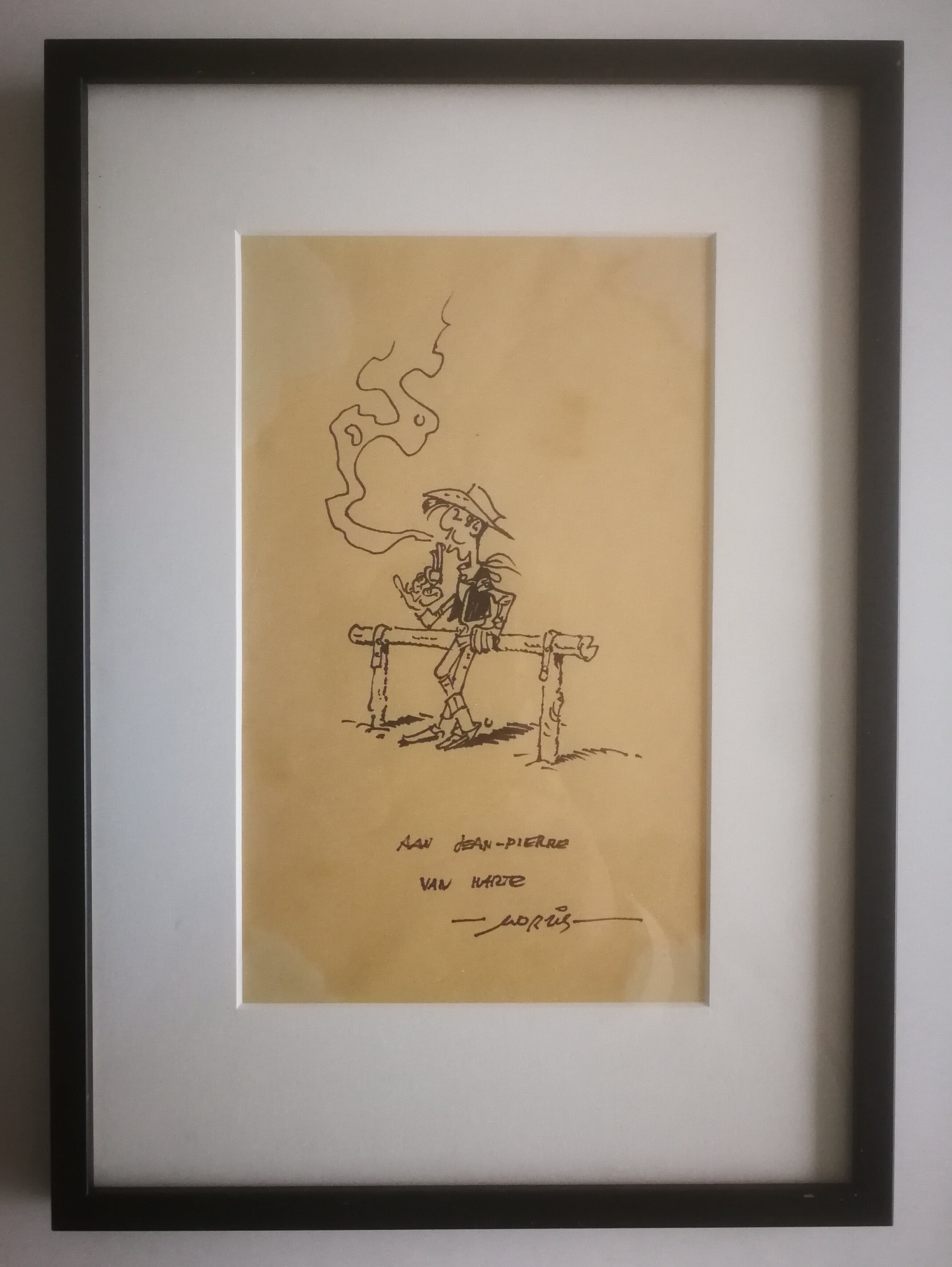 Vrolijke karakteristieke tekening. Gesigneerd. Met opdracht. Algemeen goede staat. Enige verkleuring. Kleine vlekjes. Niet storend. Achter glas beoordeeld. Zie foto's voor eigen oordeel.