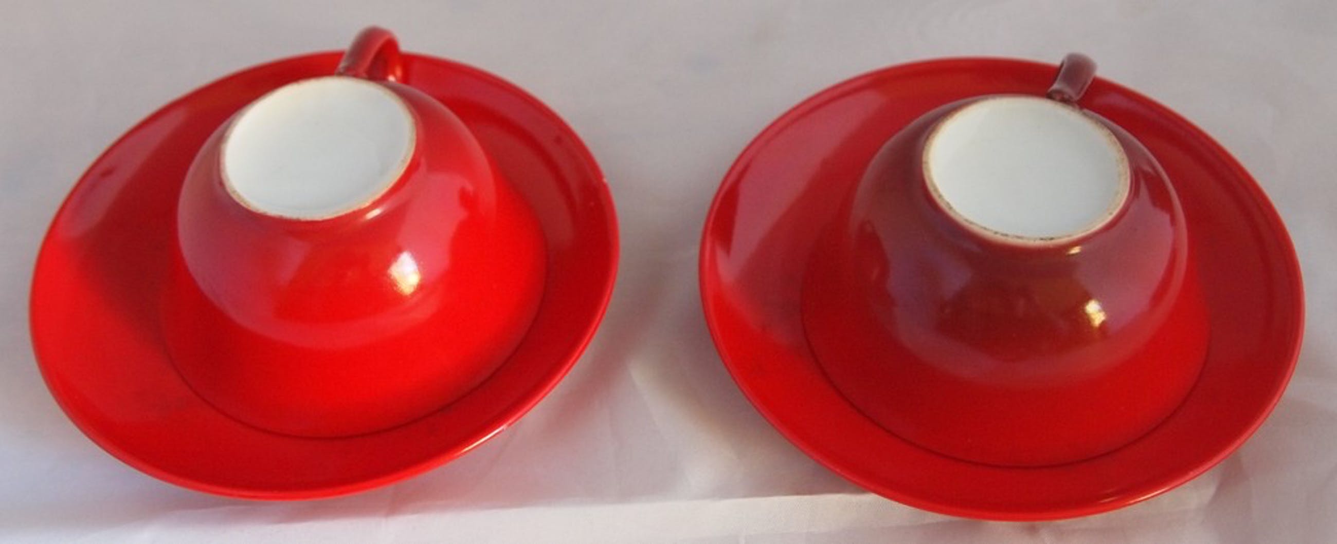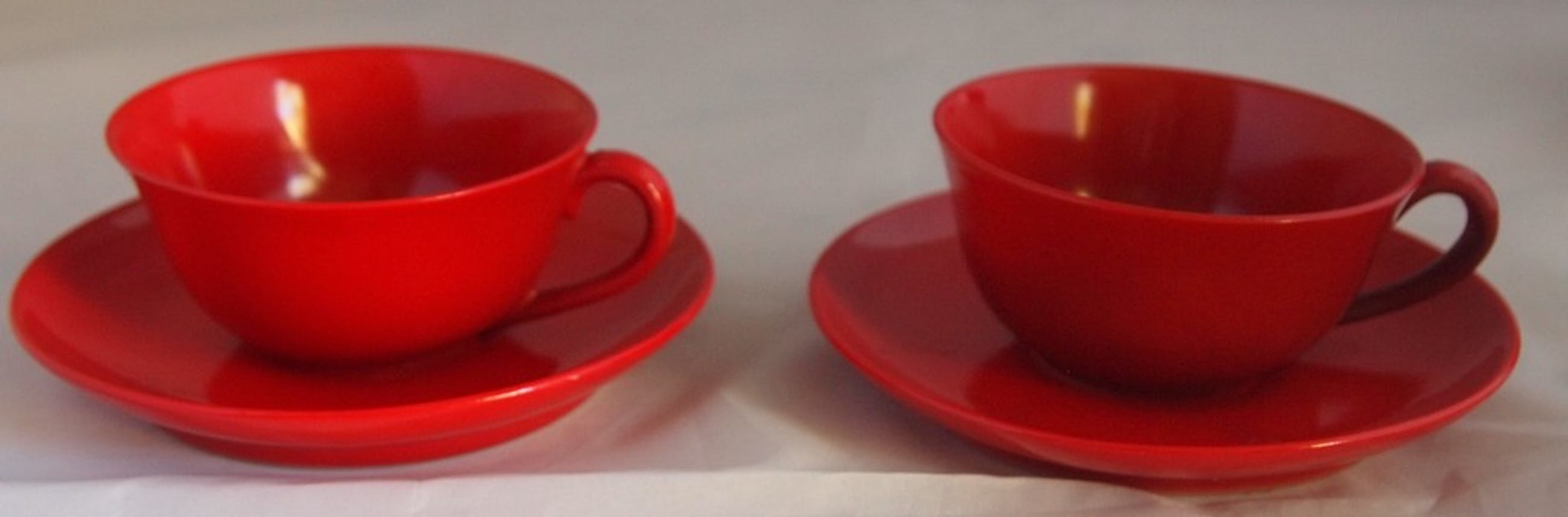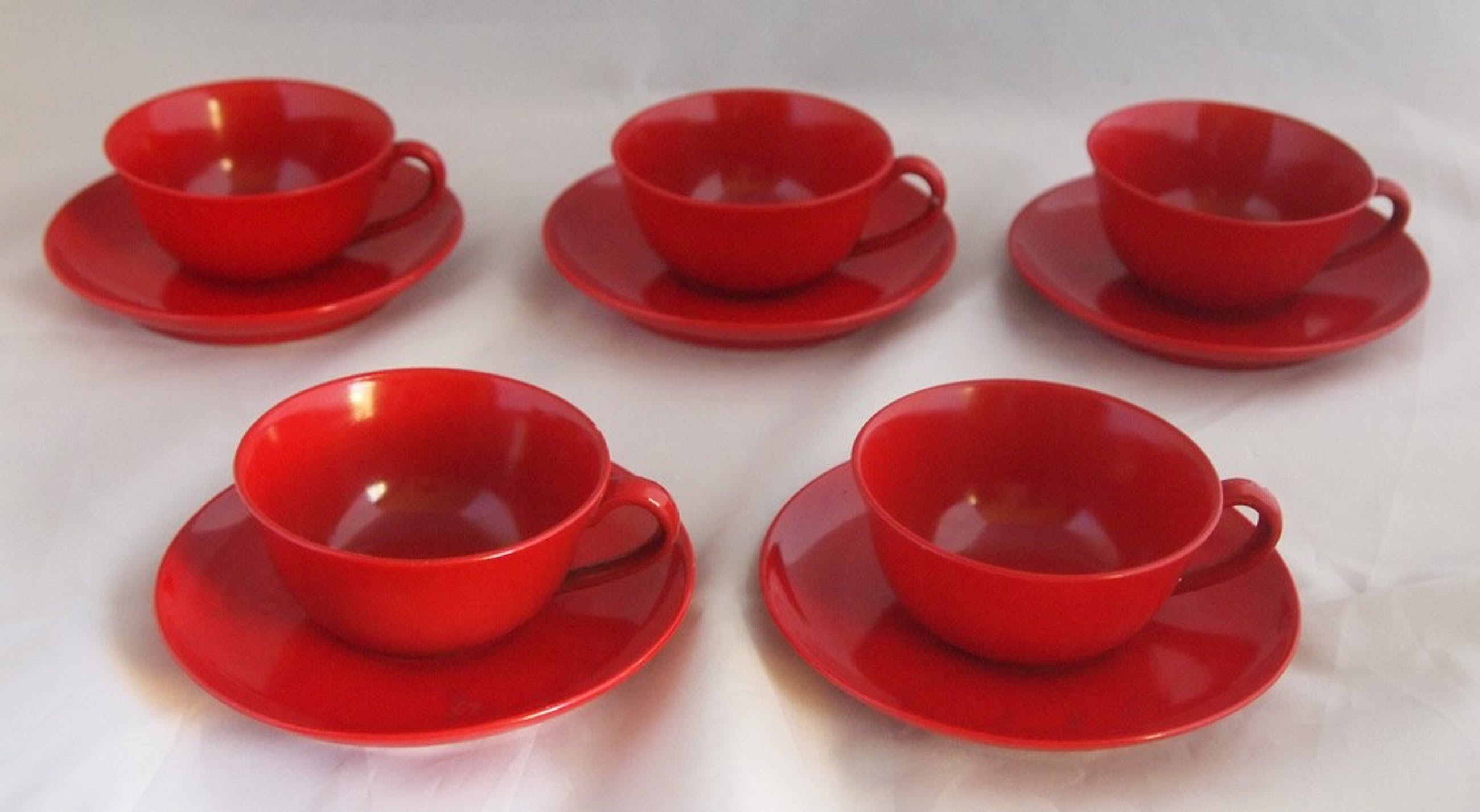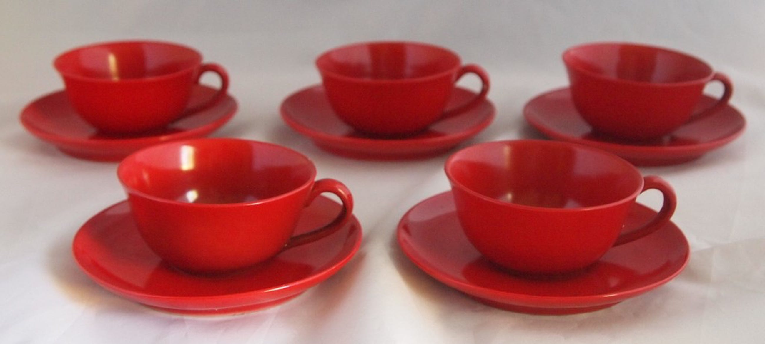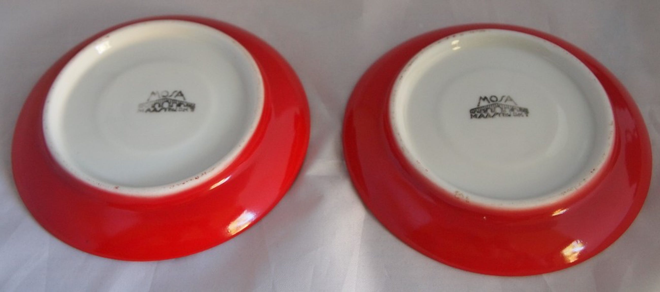 Vijf vuurrode porseleinen thee kop- en schotels van MOSA uit Maastricht. Geproduceerde in de jaren '30-'40. In prima conditie, een aantal flintertjes van de rode decoratie bij een drietal kopjes, verder geen beschadigingen. De schotels zijn aan de onderzijde gemerkt.