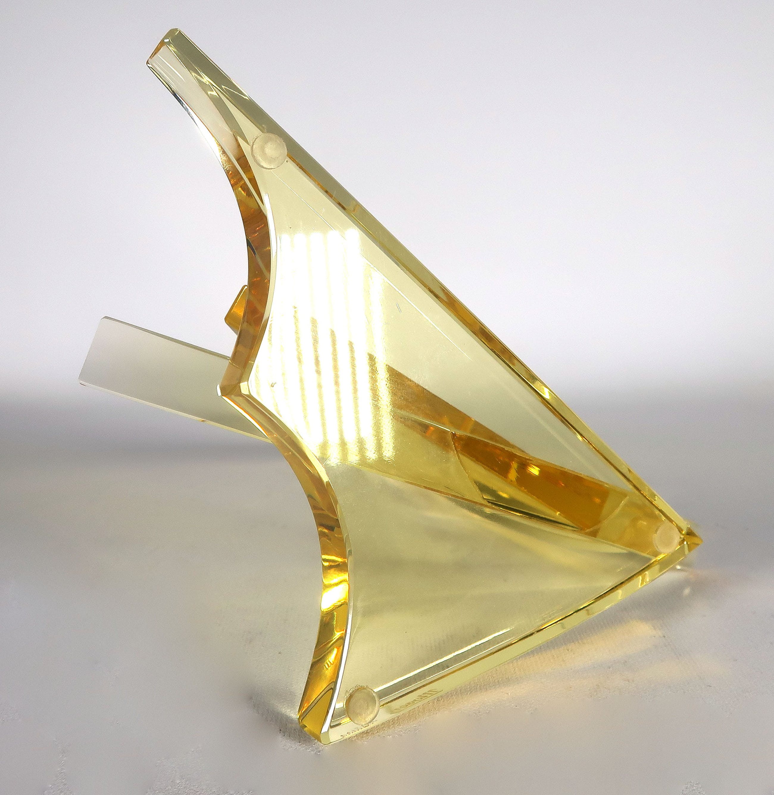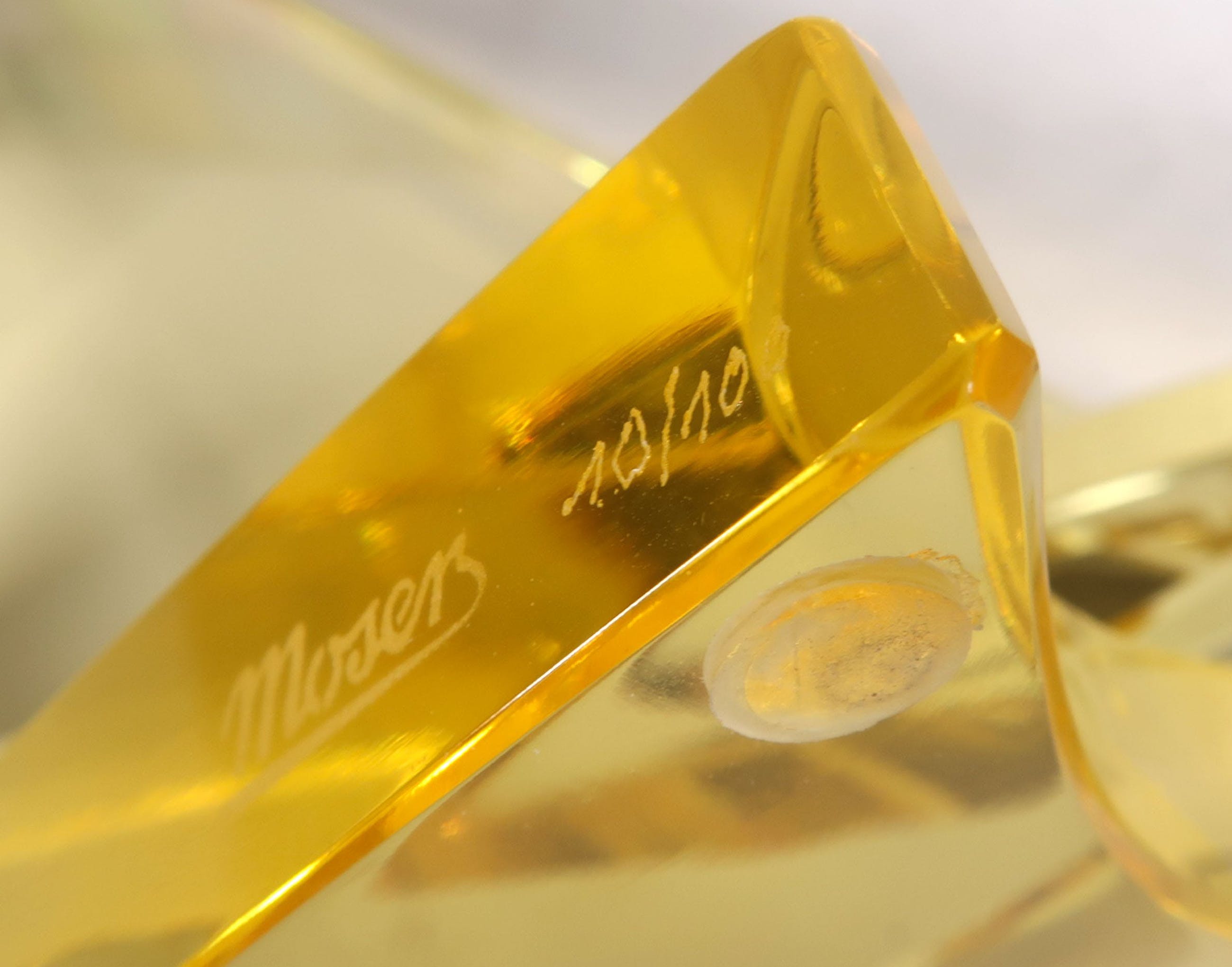 In geel glas uitgevoerde zeilboot. Het item is voorzien van een Moser-sticker, gravure en oplagenummer (10/100)
