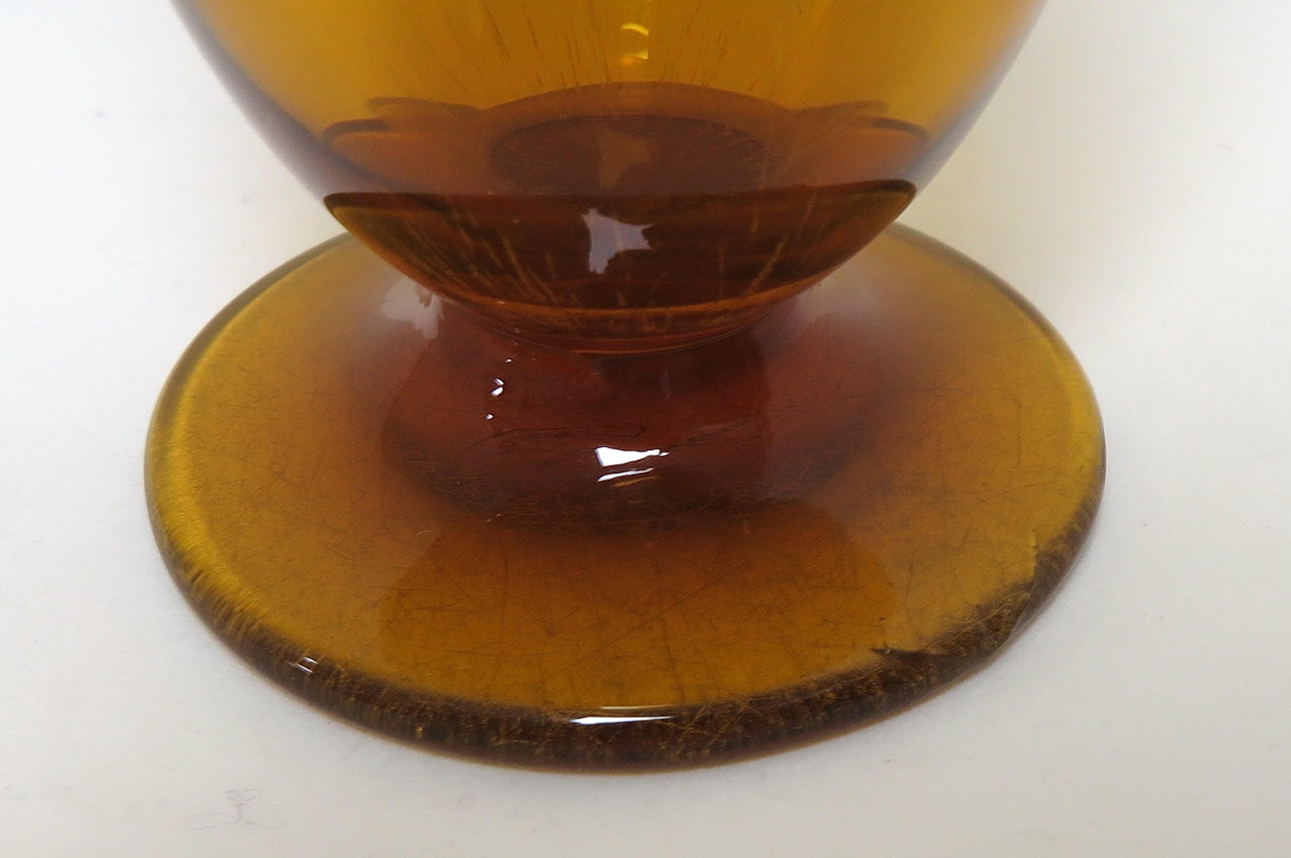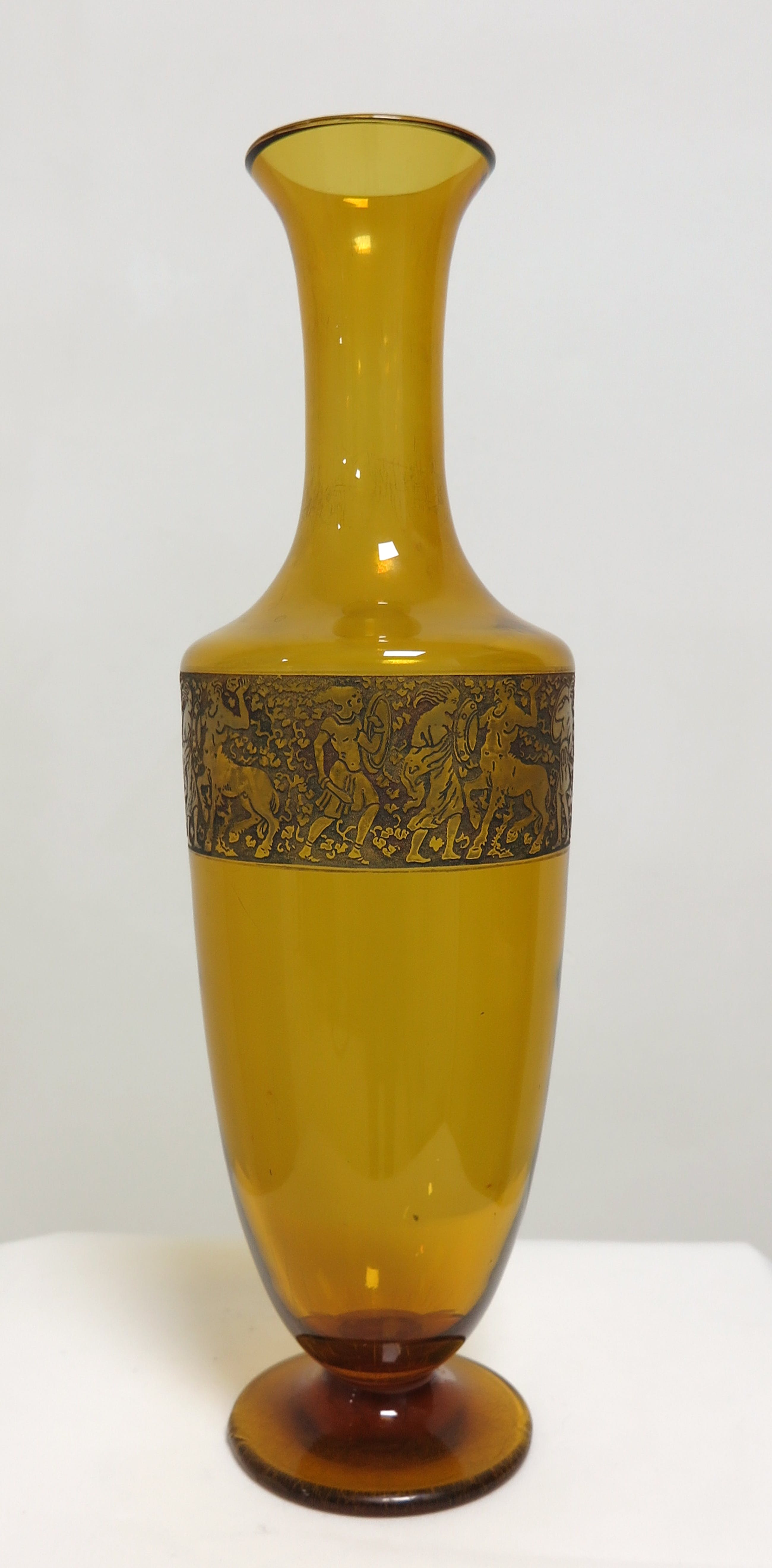 Amberkleurige amfoorvormige vaas met een geëtste band van vechtende Amazones en centaurs. De band was oorspronkelijk verguld, het verguldsel is zo goed als weggesleten.