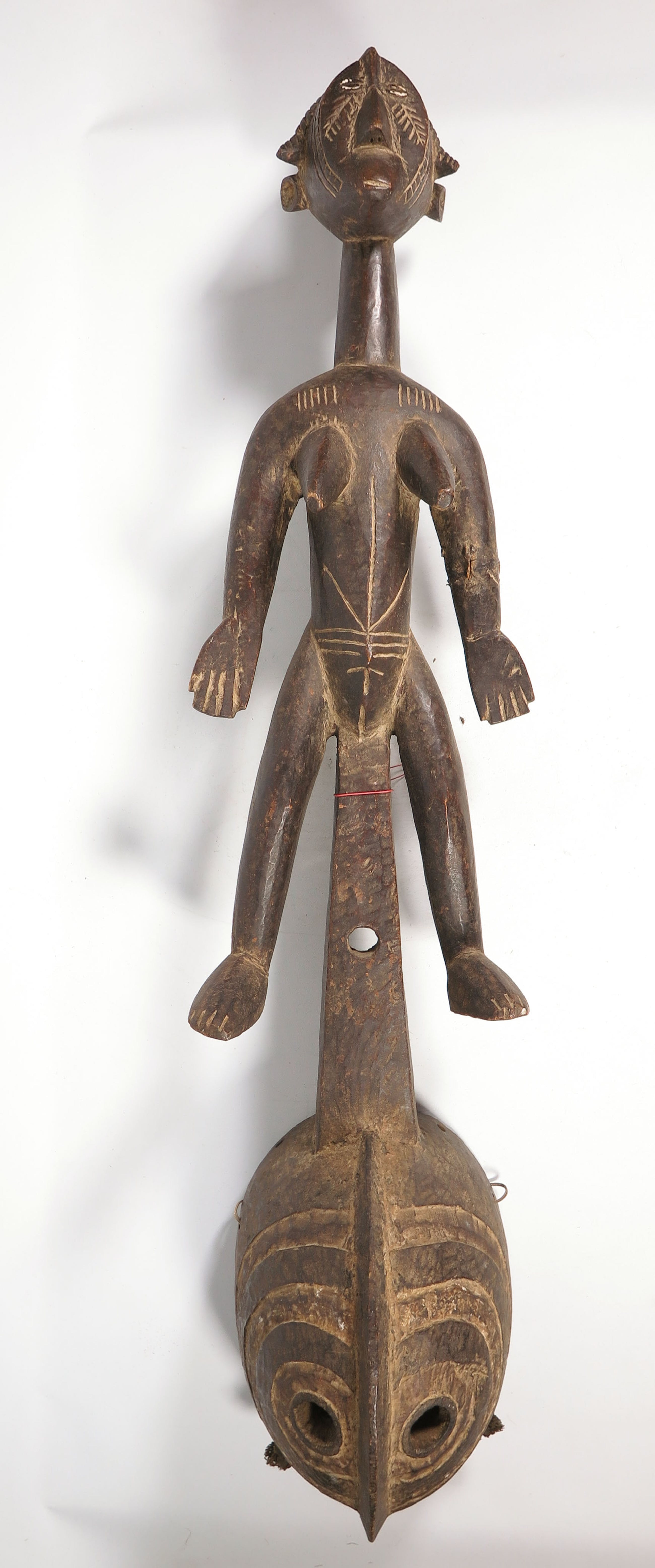 Houten gestoken Mossi masker bekroond met staande voorouder.