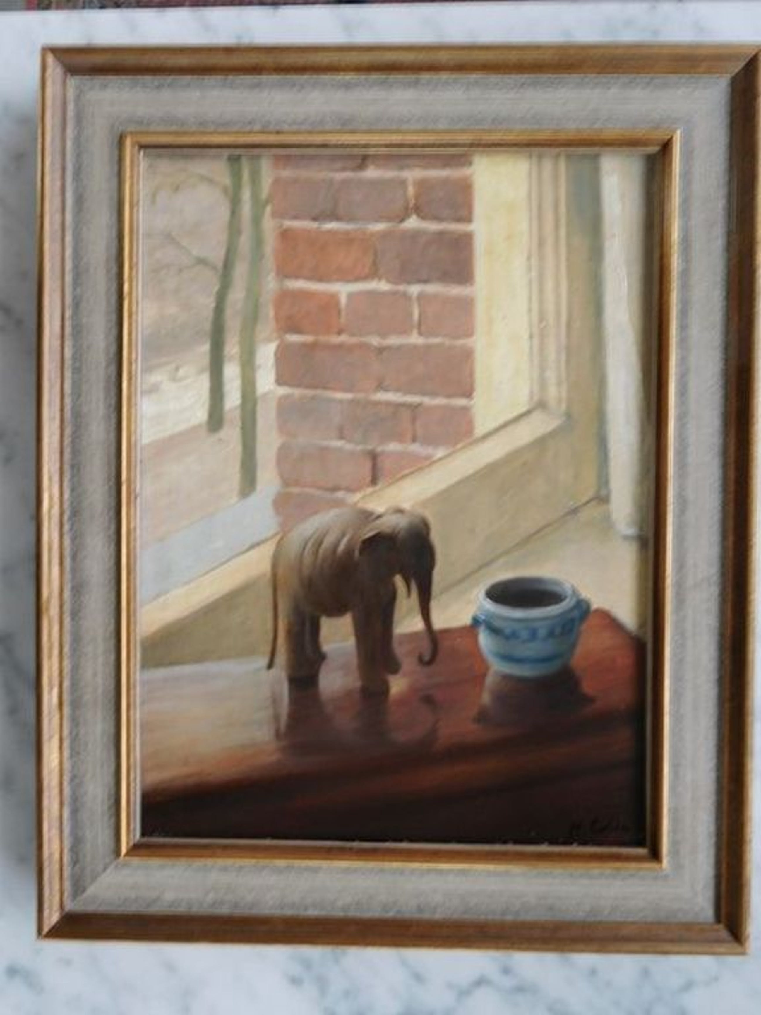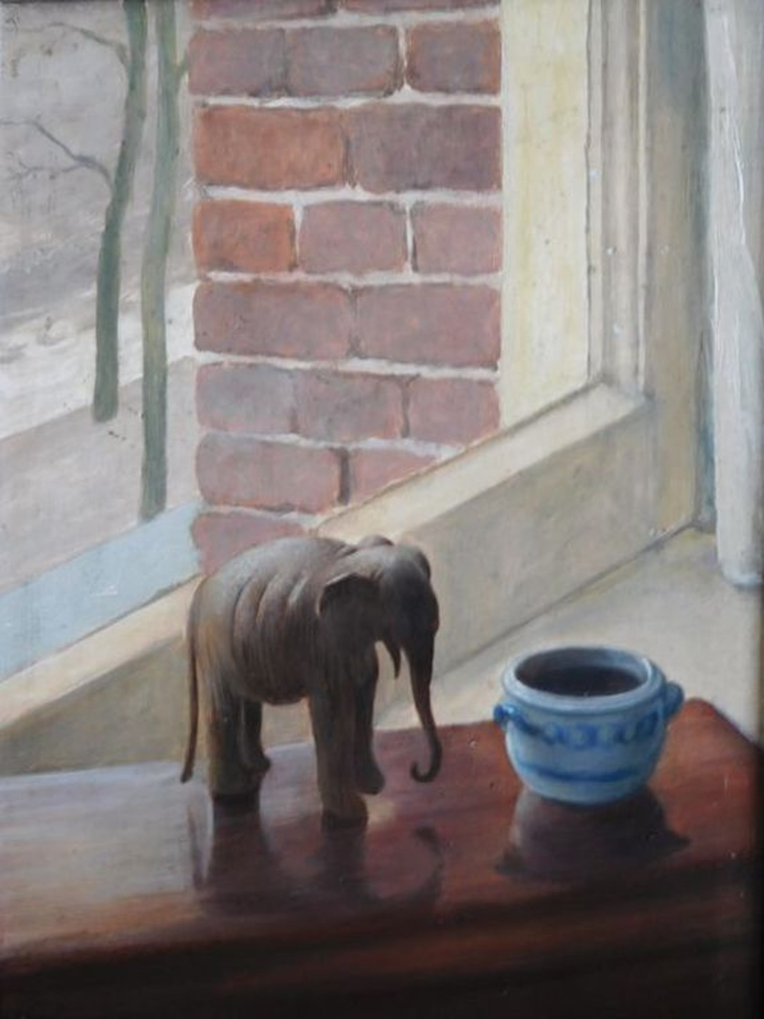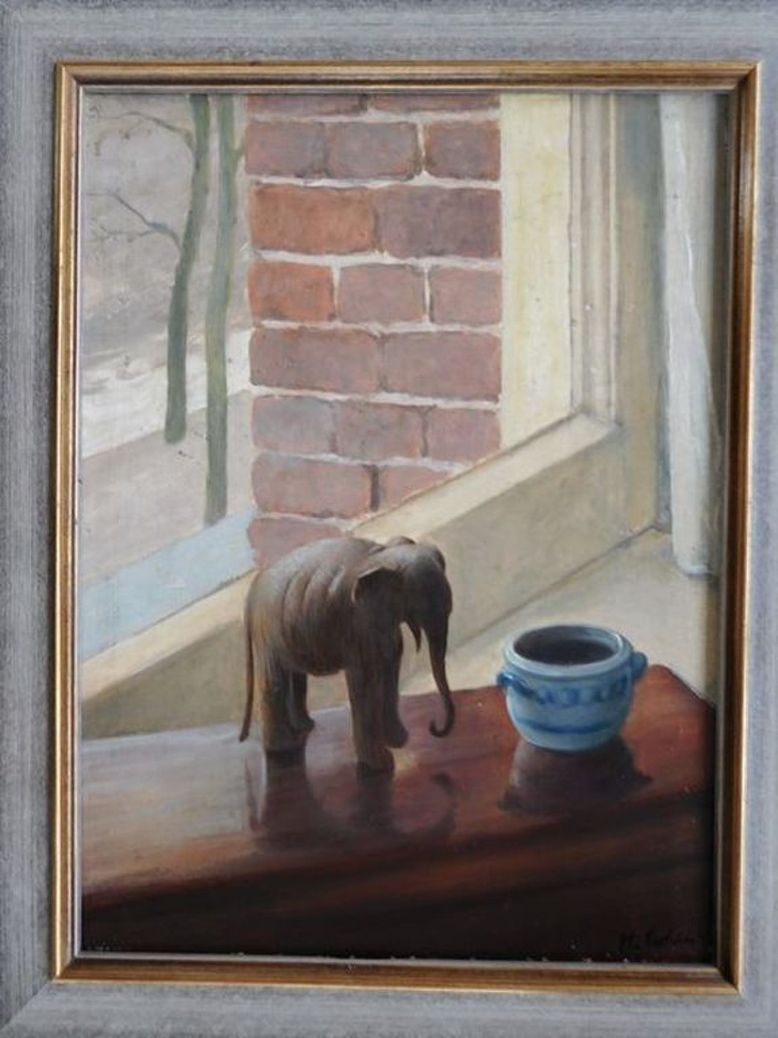Olieverf op paneel van Mozes (Moos) Cohen 1901-1942. Aparte Compositie van een stilleven met een olifantje en een Keulse pot bij een doorkijk uit een raam op een besneeuwde straat. Het werk meet 21 cm breed x 30 cm hoog. Het is ingelijst in een passende lijst van 27 x 35 cm.