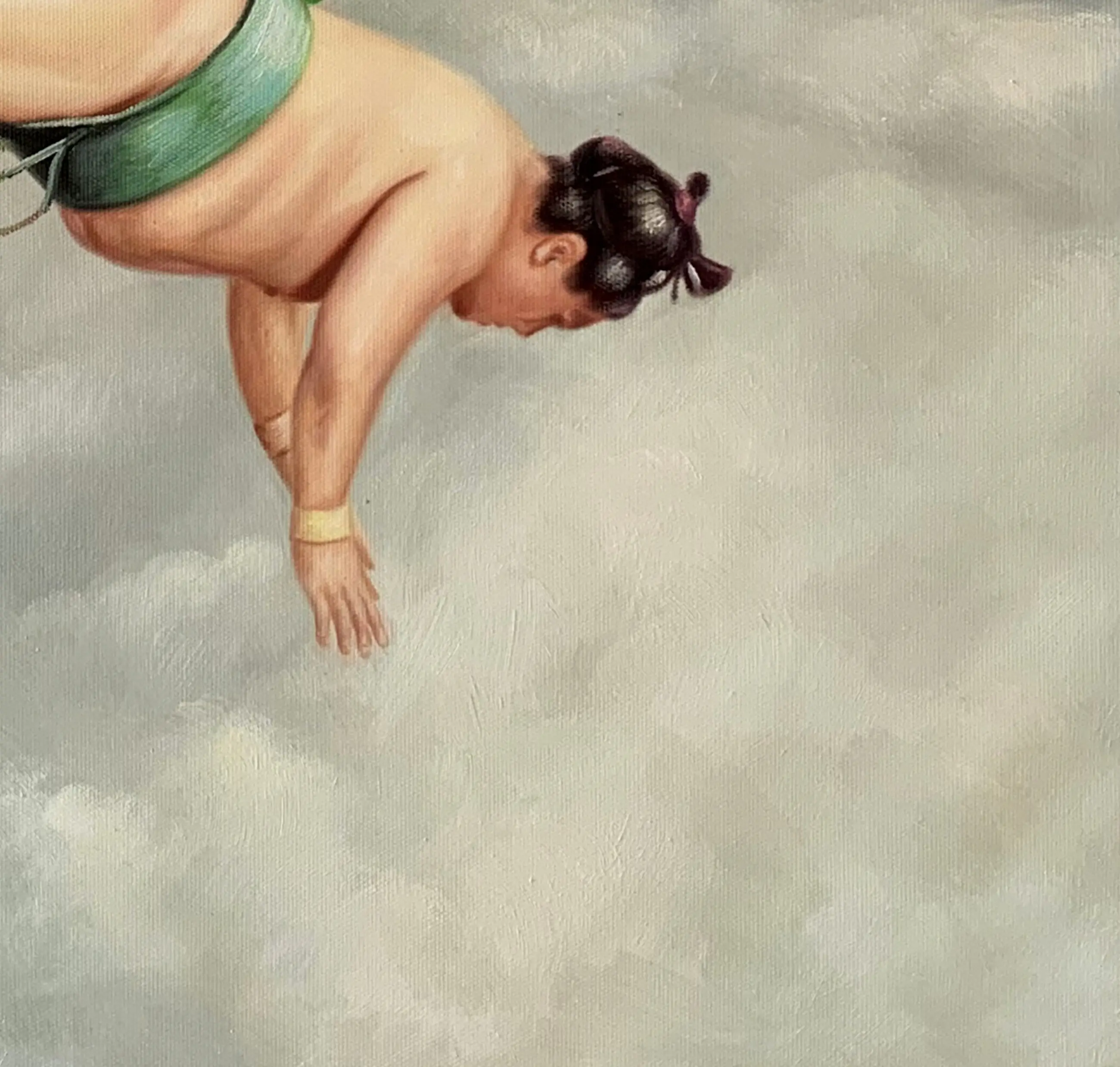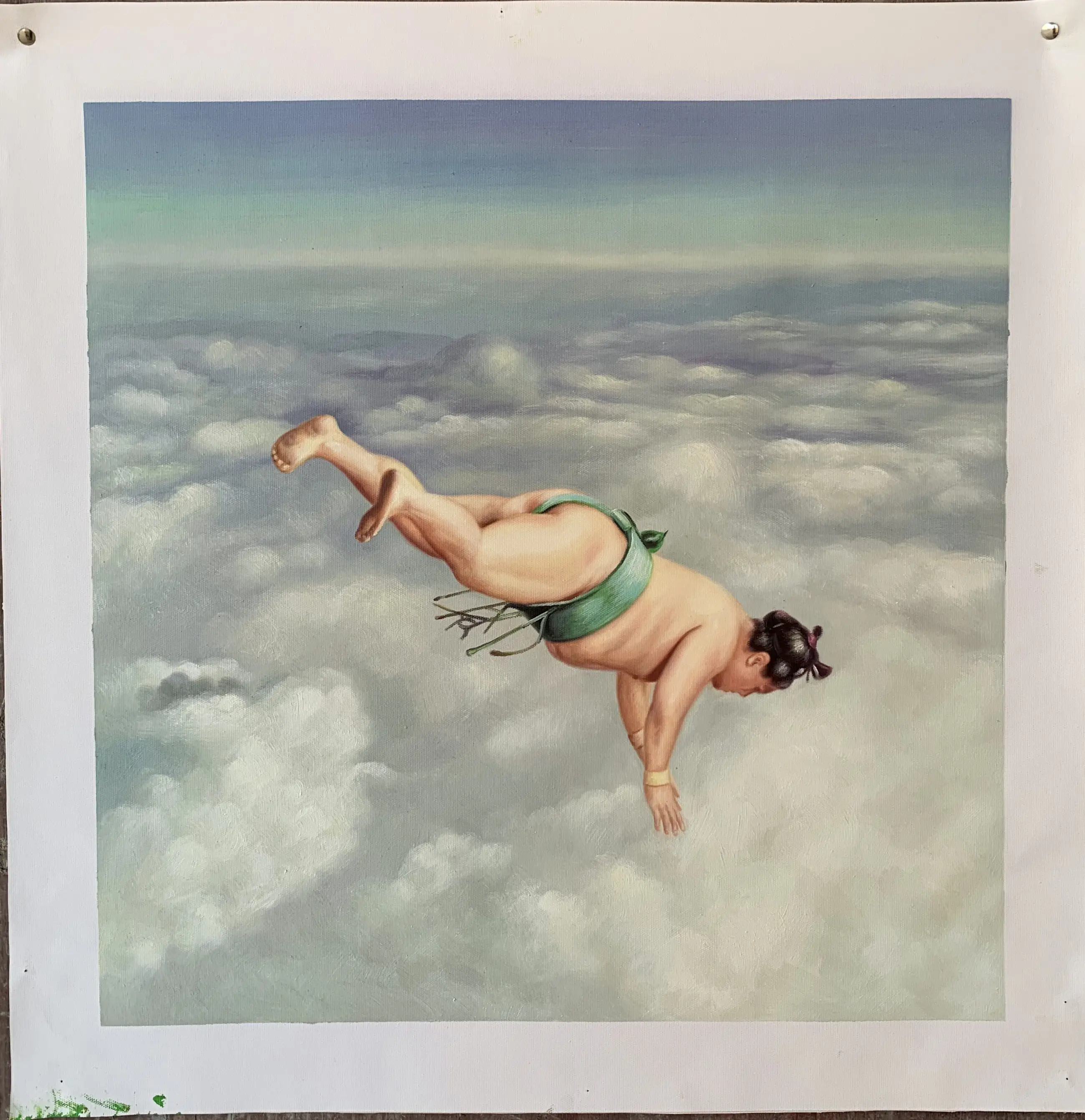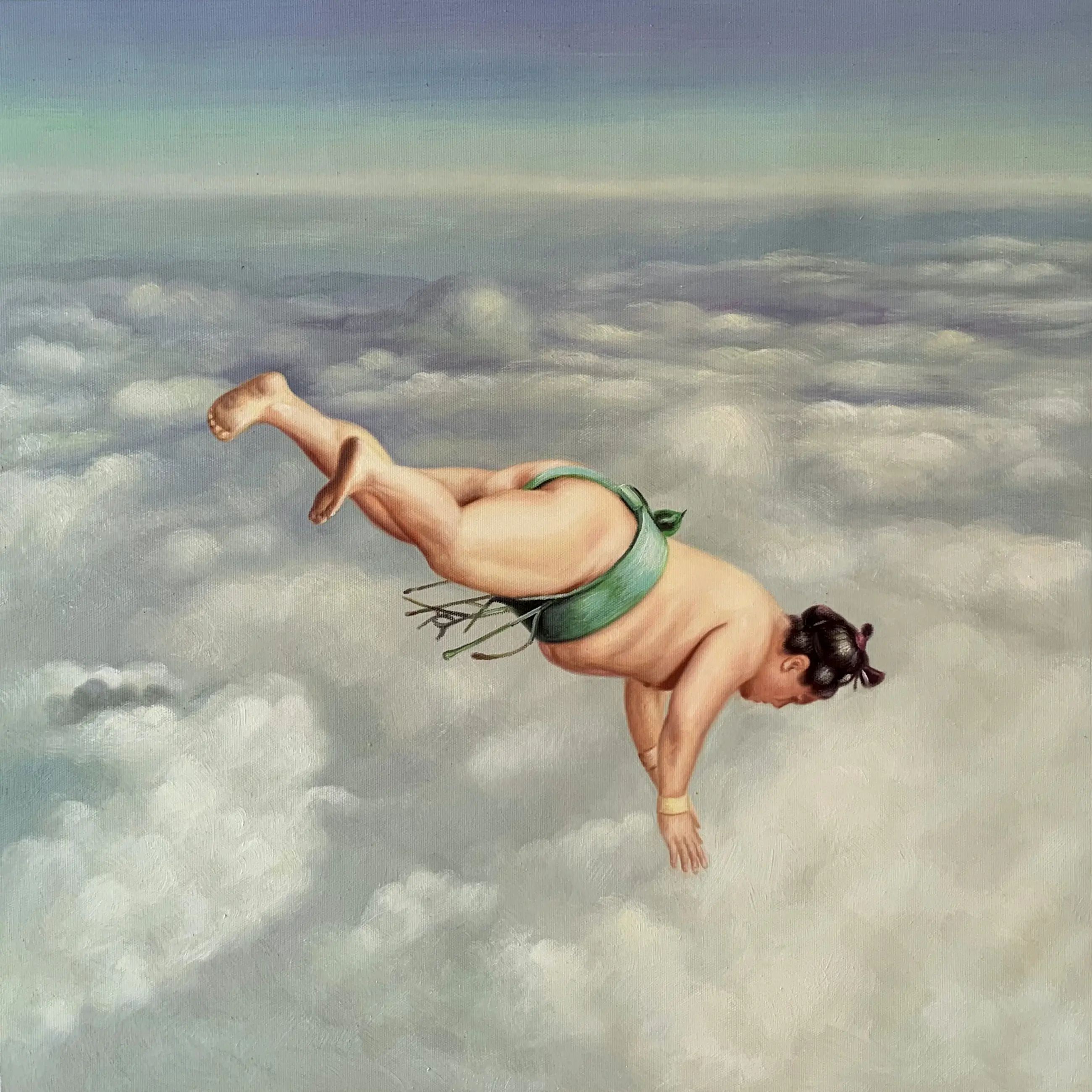 Ik heb dit kunstwerk gemaakt om de lichtheid en durf vast te leggen van de sumoworstelaar die de zwaartekracht tart in een oneindige hemel. Dit contrast tussen aardse kracht en hemelse zachtheid symboliseert vrijheid en ontsnapping. Hang dit kunstwerk in je huis en het krijgt een vrolijke en surrealistische energie die je uitnodigt om te dromen voorbij de opgelegde grenzen.