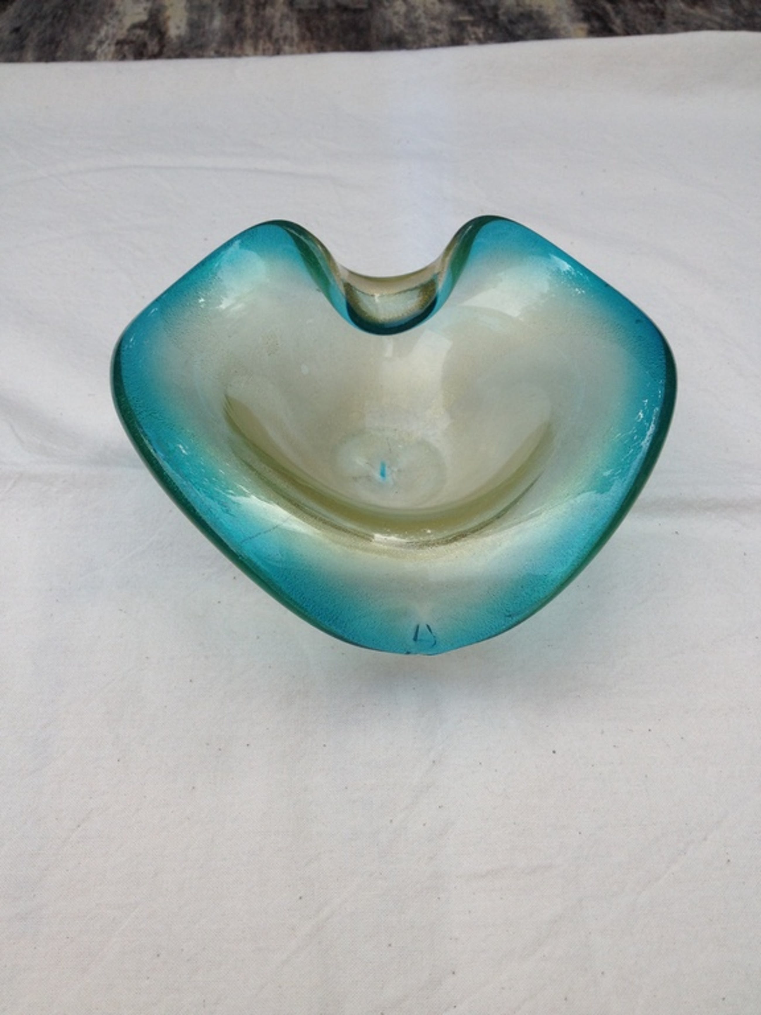 Murano Barovier & Toso Turqoise asbak met goud folie, typisch jaren '50-'60 ontwerp. In goede gebruikte conditie, geen grote beschadigingen. Niet gemerkt.