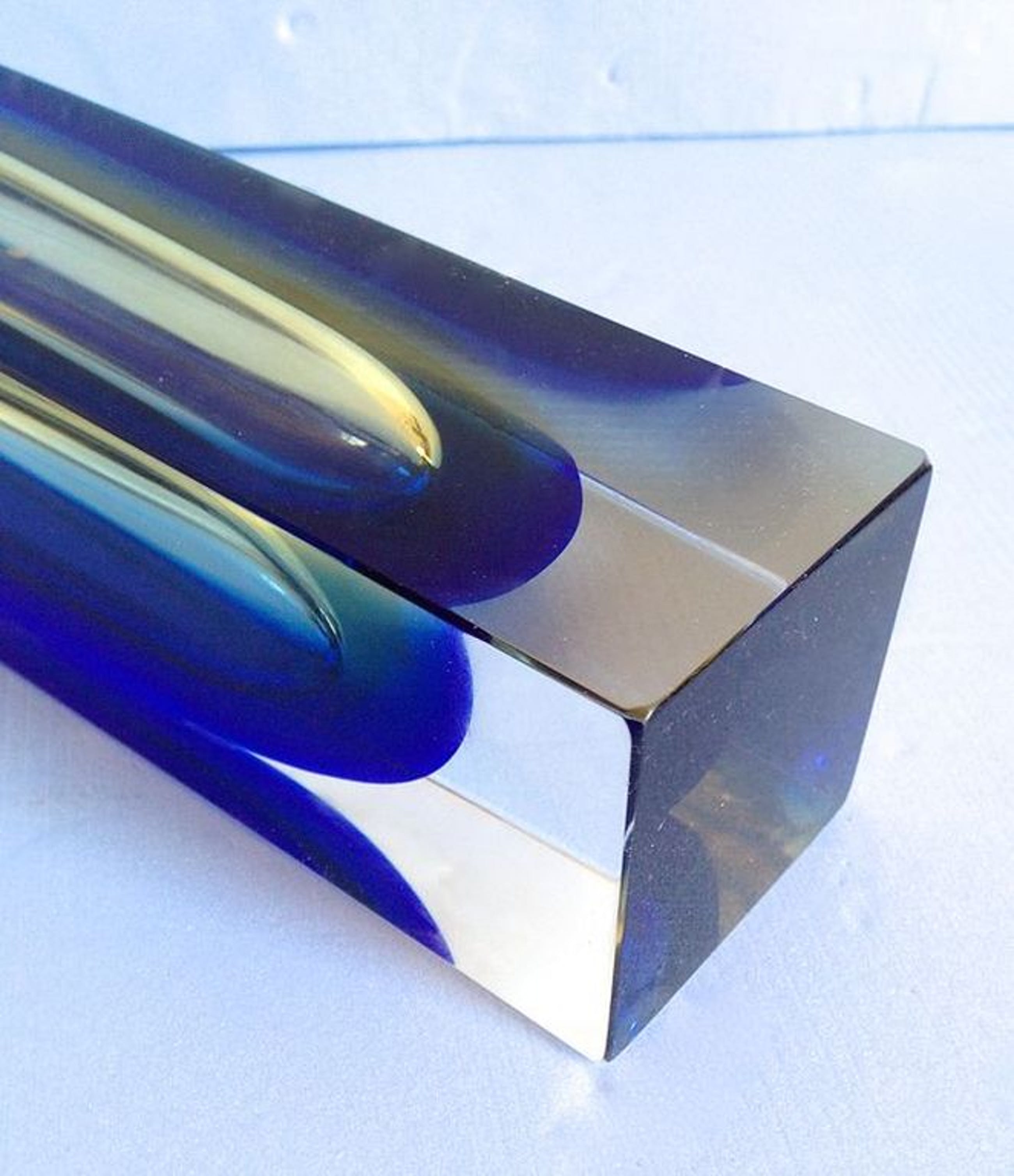 Uitgevoerd in Sommerso-techniek. Kobalt blauw met amberkleurige tonen.