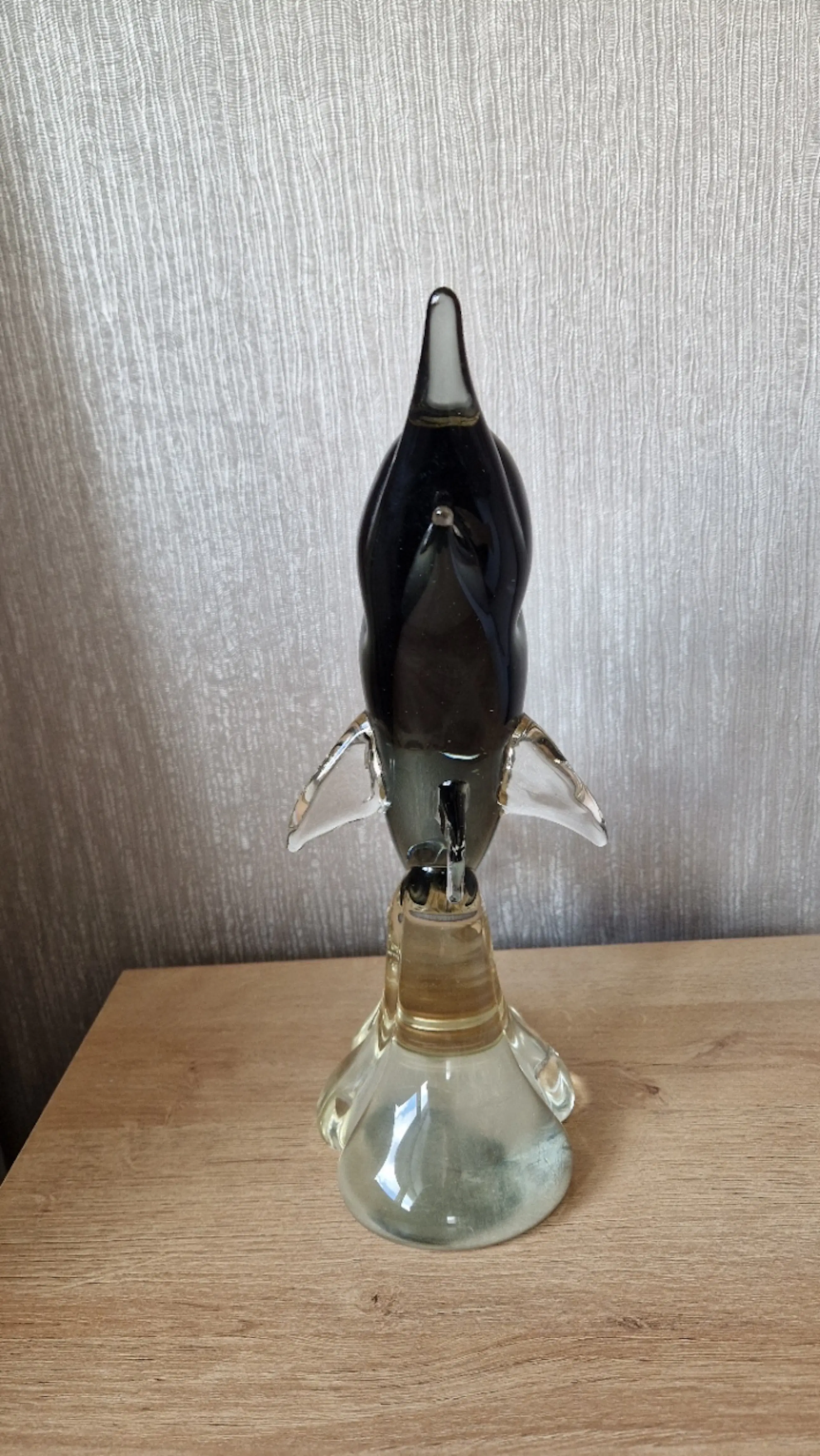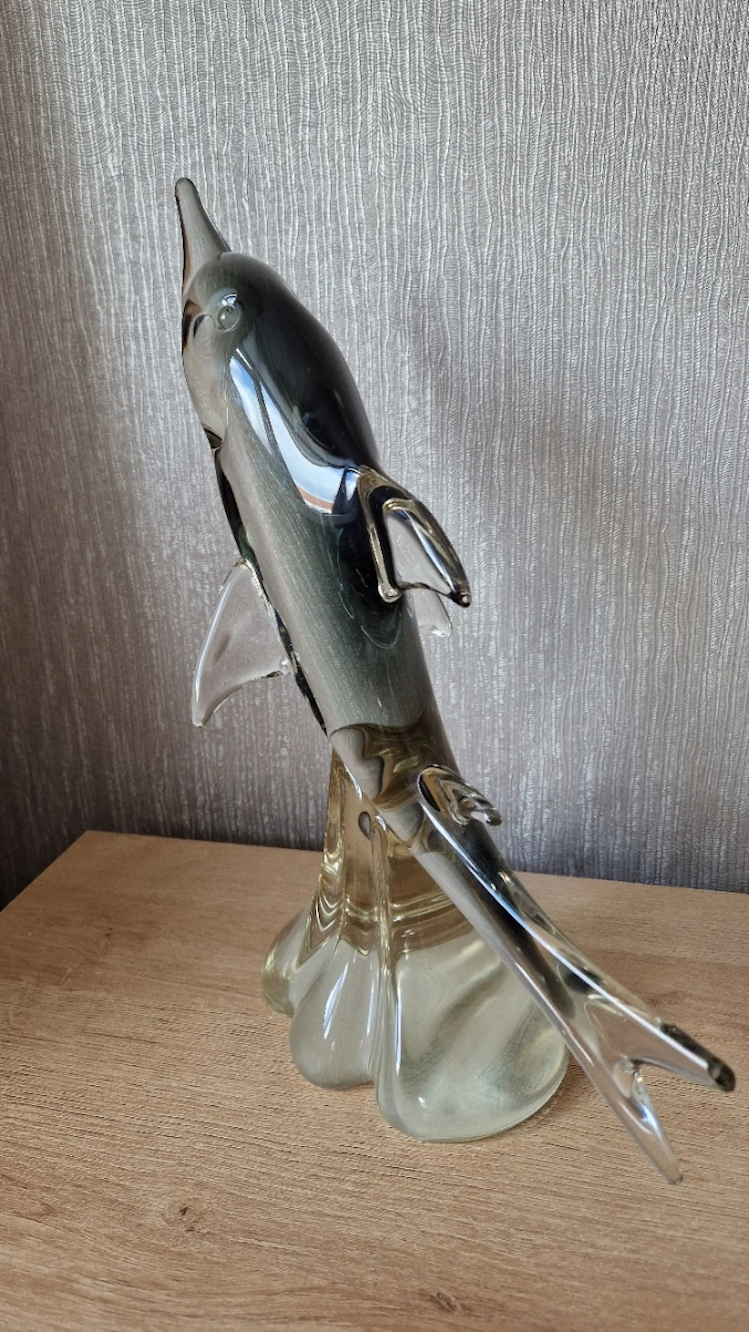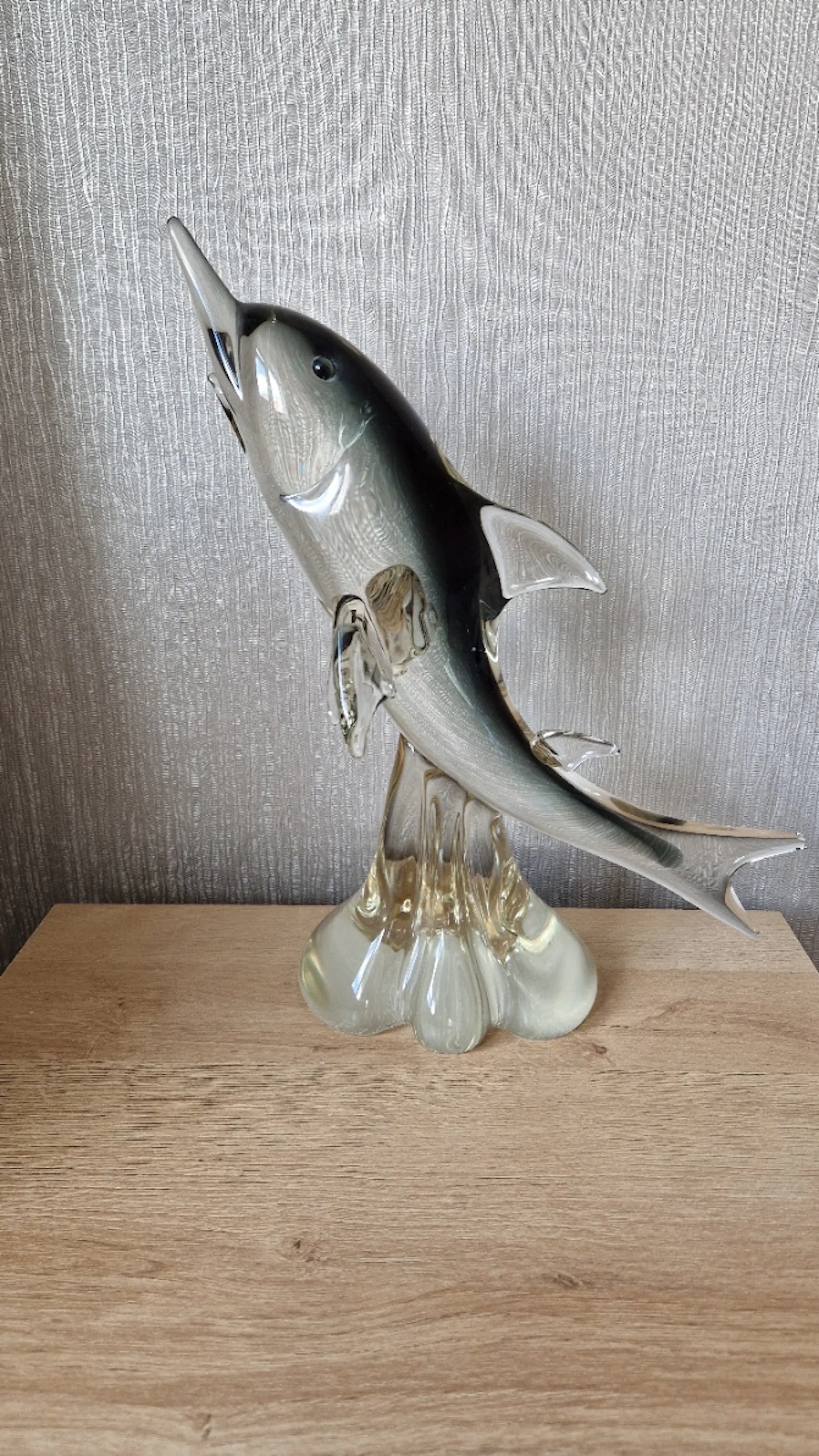 Een prachtig handgemaakt Murano glasbeeld van een elegante zwaardvis (marlijn). Dit decoratieve kunstobject is vervaardigd uit hoogwaardig Italiaans glas en kenmerkt zich door de mooie kleurverloop van transparant naar zwart/grijs, met verfijnde details in de vinnen en kop. De vis lijkt dynamisch uit het water te springen, wat het beeld een levendige uitstraling geeft.