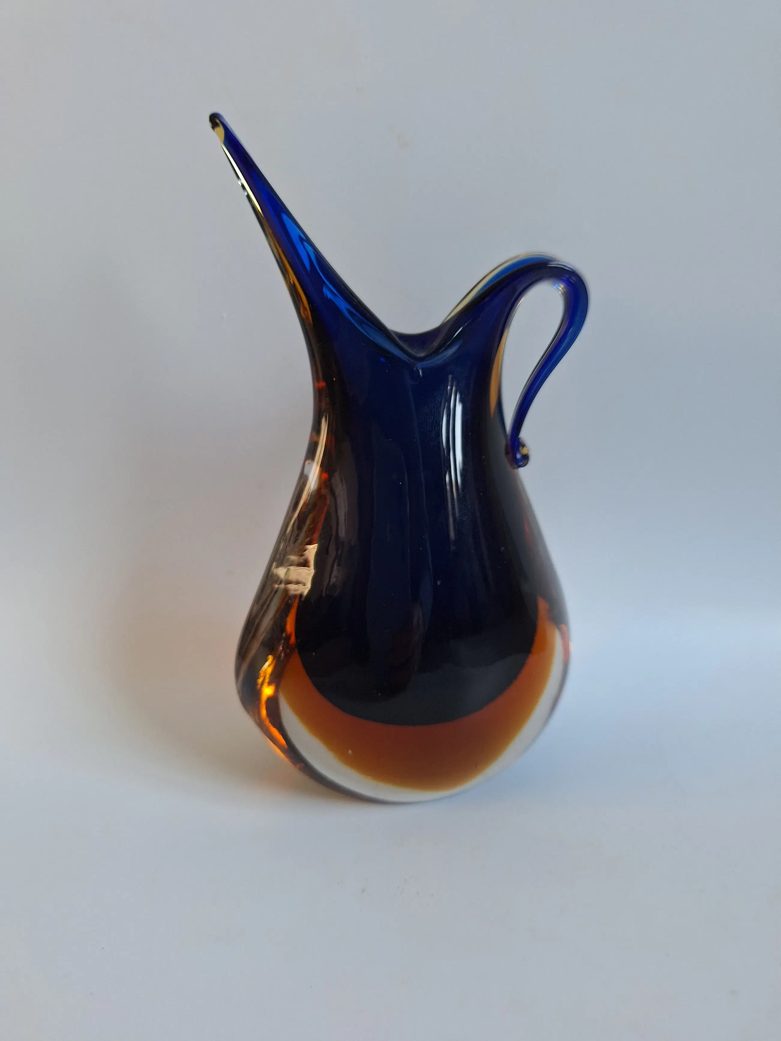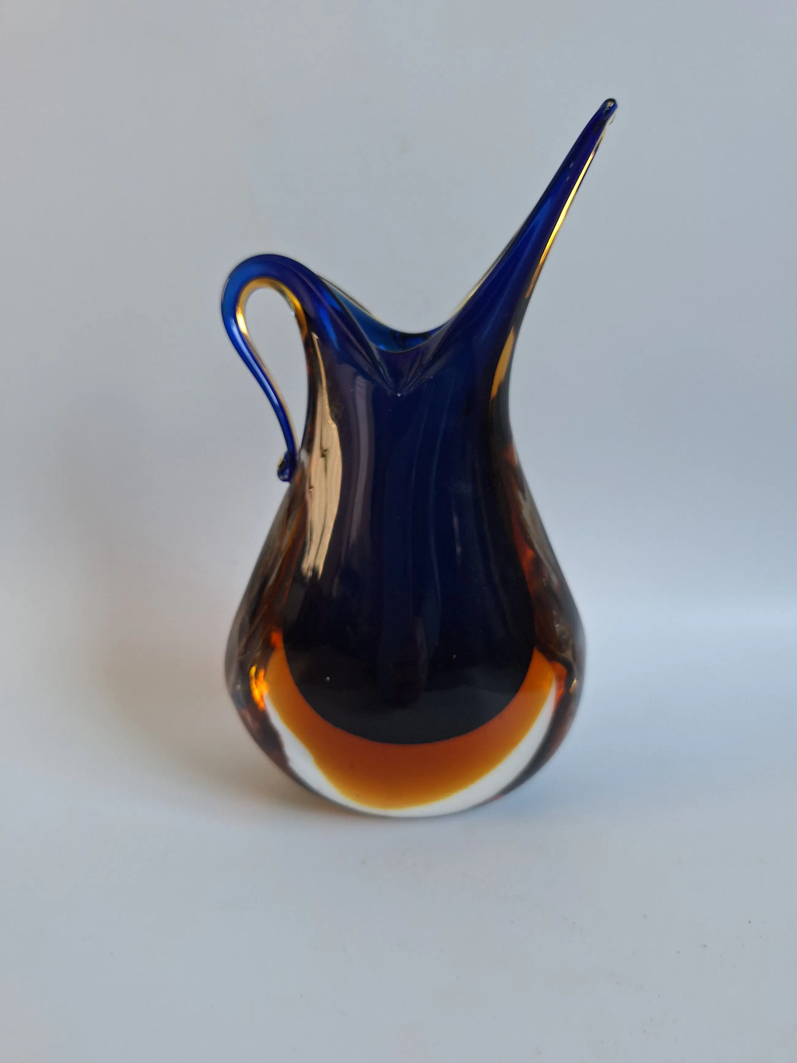 Mooi glazen murano vaasje. 17 x 10 x 6,5 cm 700 gram Blauw met oranje glas