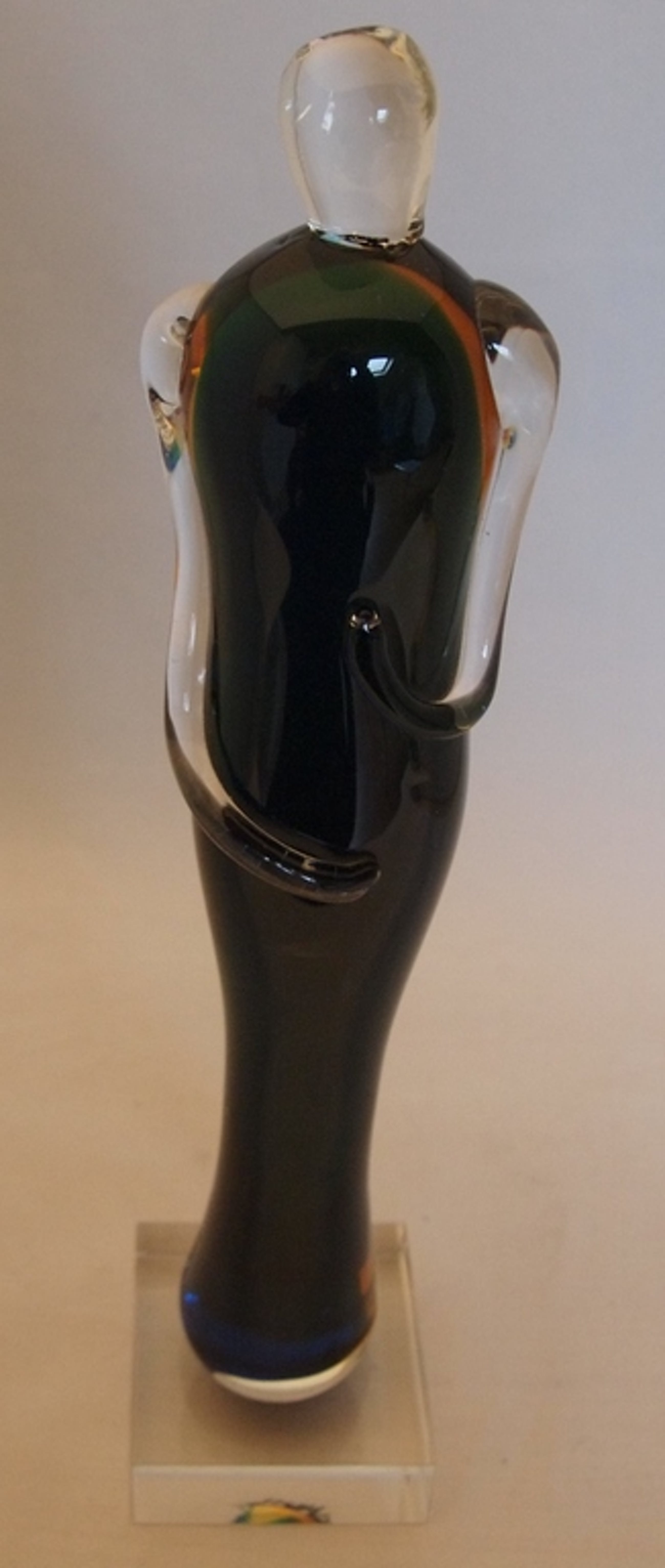 Murano chalcedoon glazen sculptuur van een mens. Blankglas met aan de binnenzijde blauw, groen en amber gekleurd glas op een vierkante blank kristallen voet. In prima conditie. Niet gemerkt.