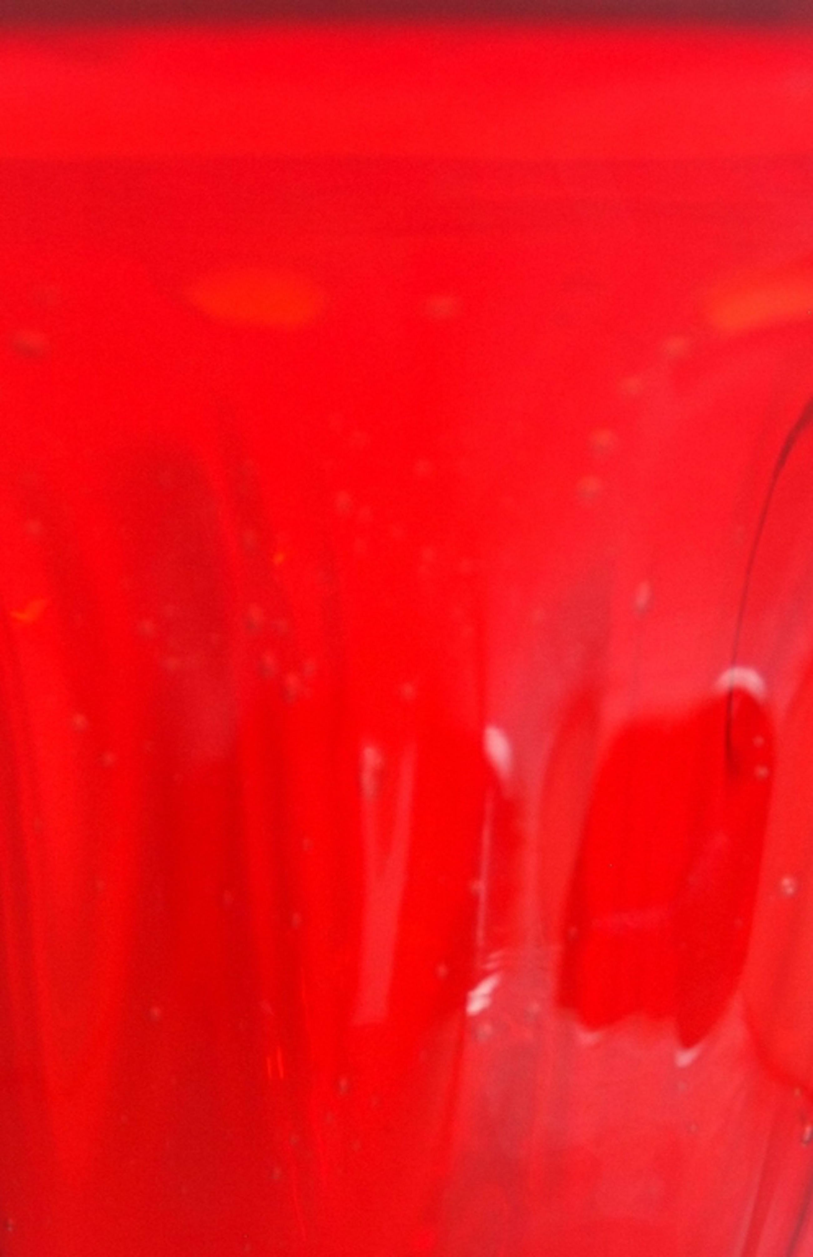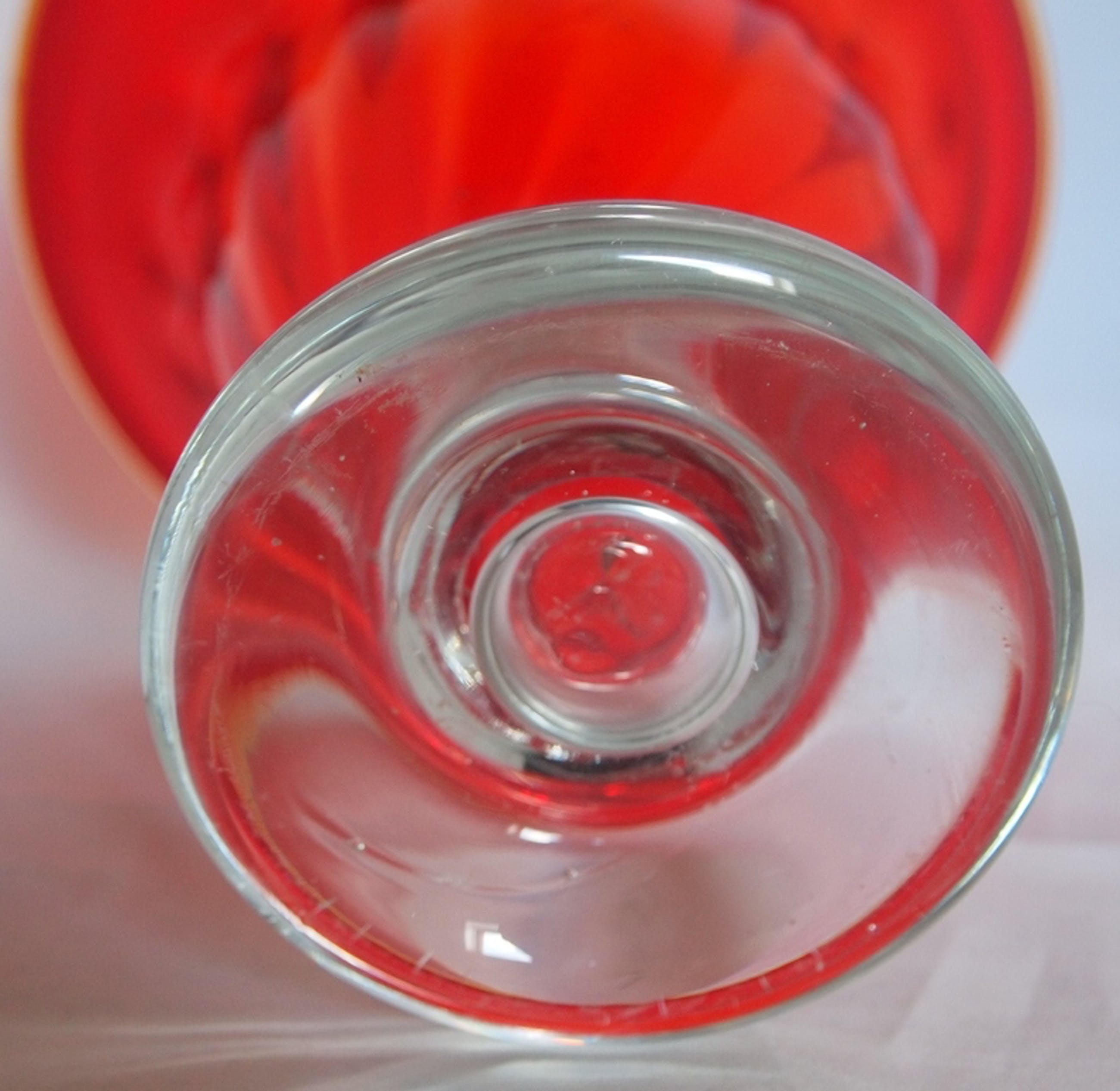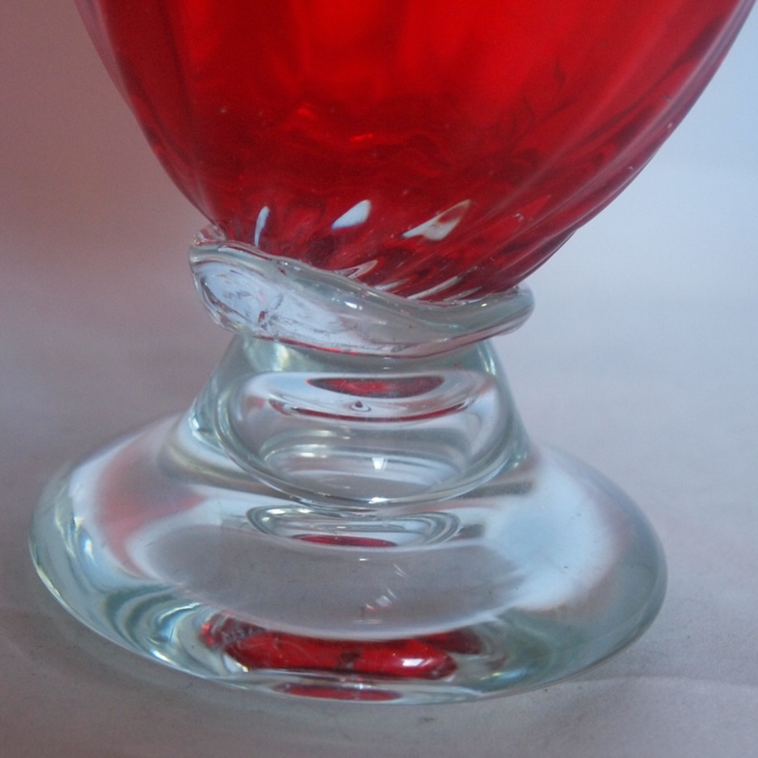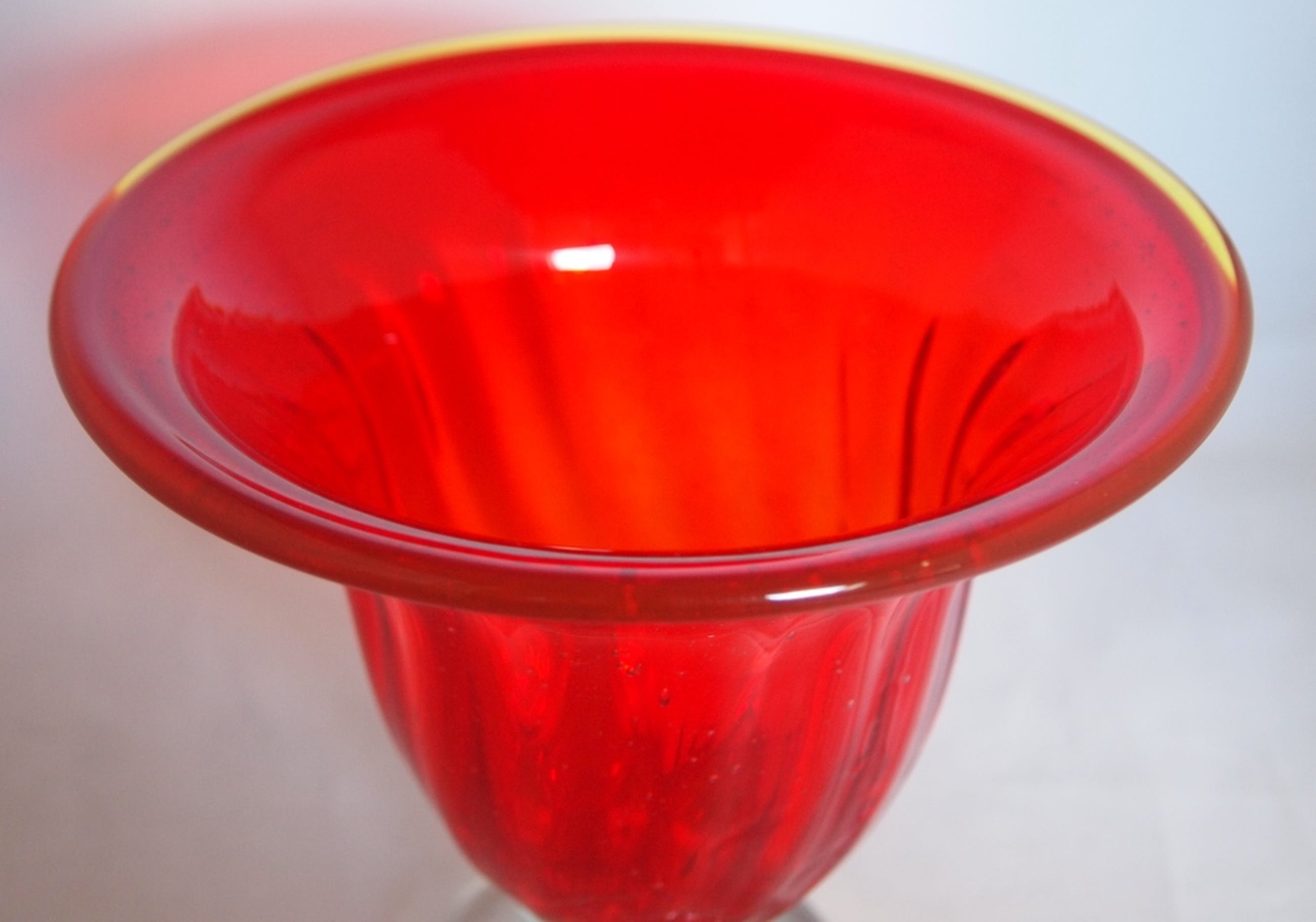 Mooie hand geblazen Murano dikwandige rode bullicante vaas op blank glazen voet. De bovenrand van de vaas heeft een gele gloed over zich heen. In prima onbeschadigde conditie. Niet gemerkt.