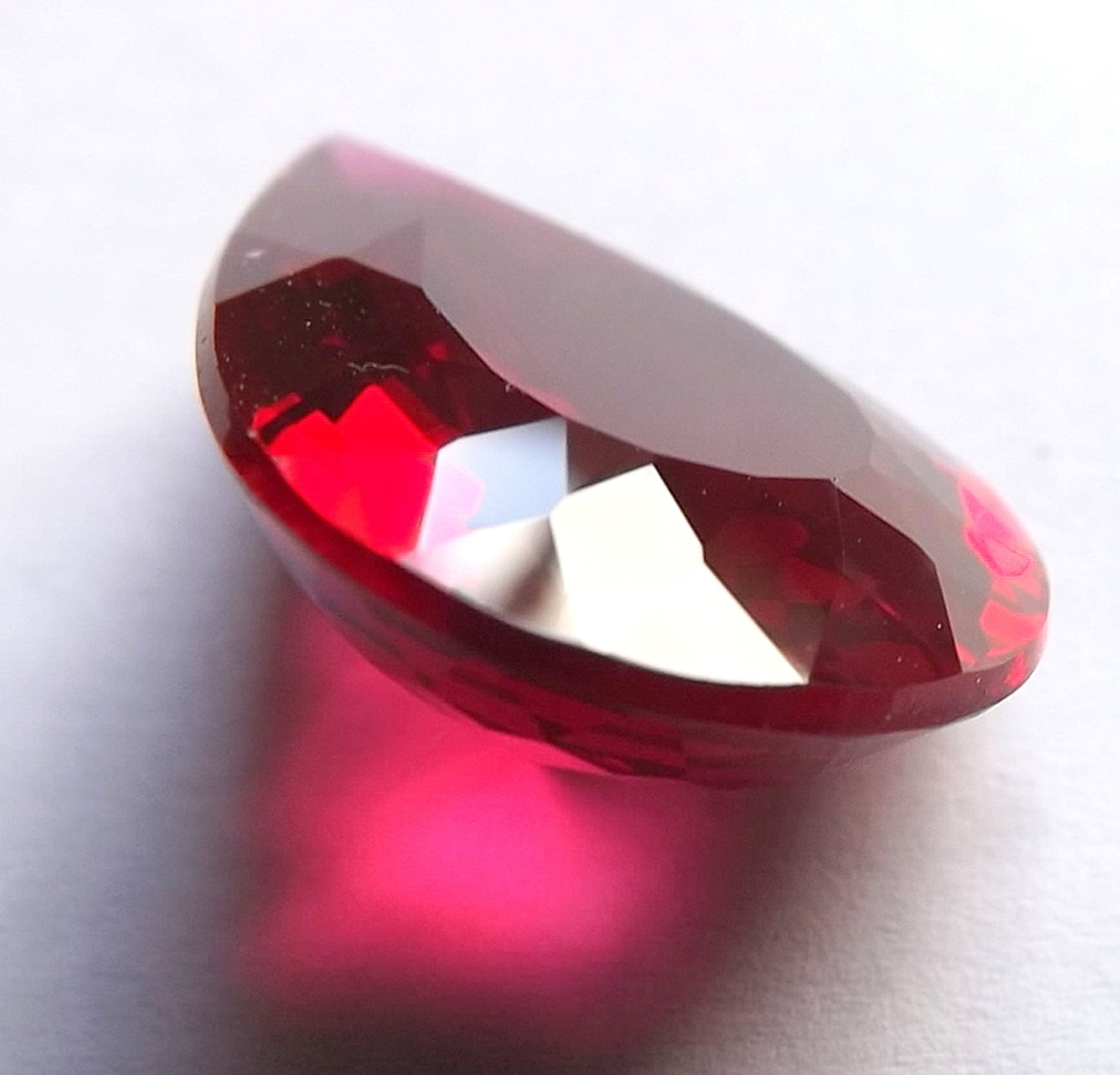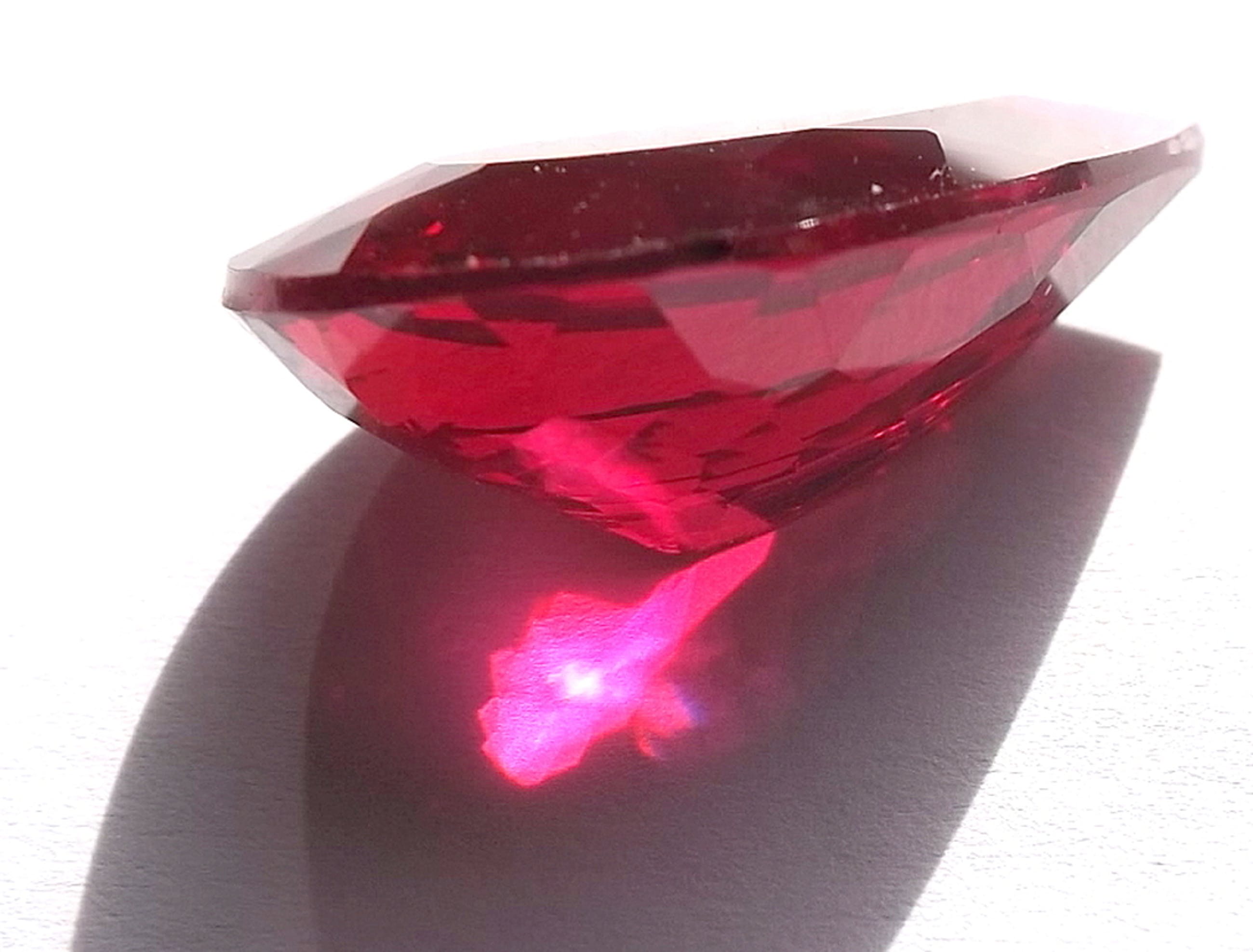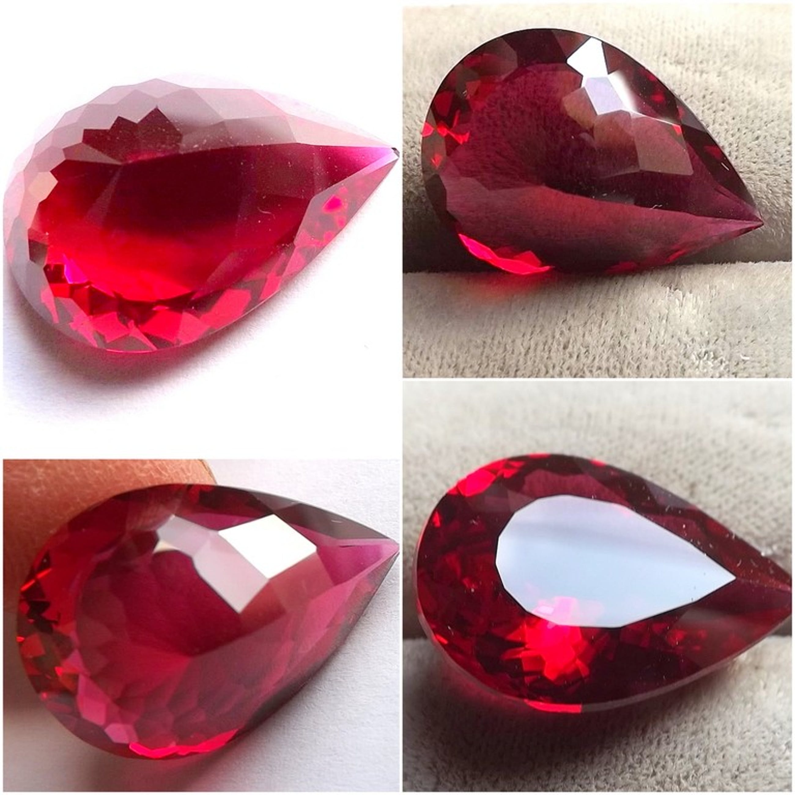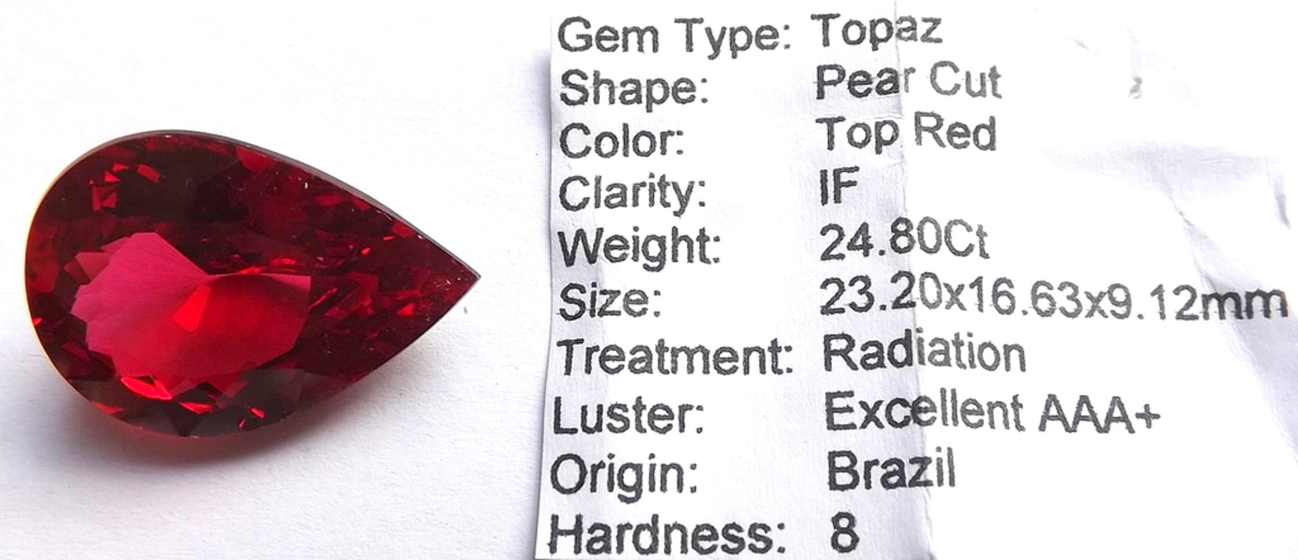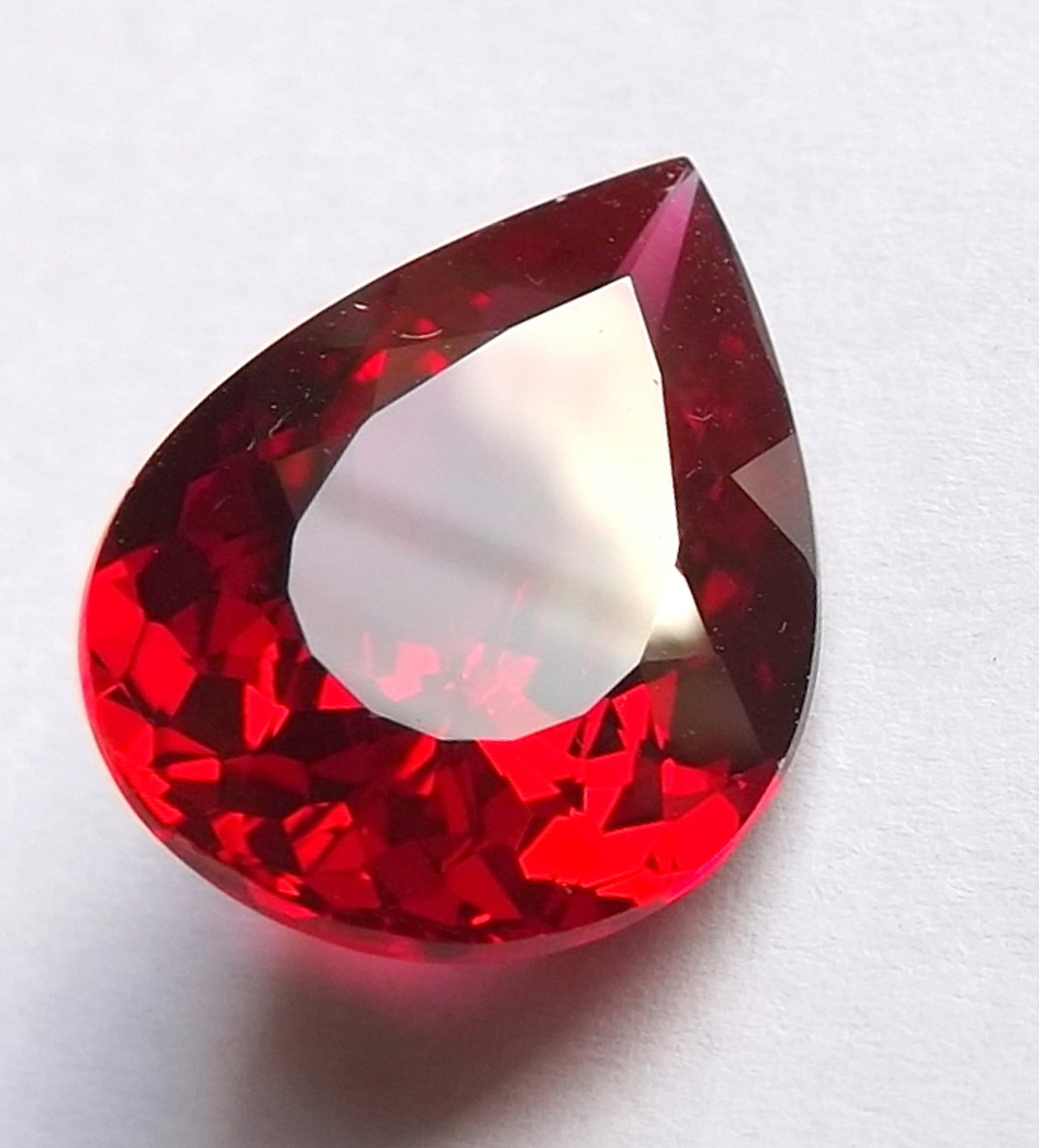 slijpsel: peer facet (onderkant volledig checker-cut) kleur: diep rood - helderheid: IF - bewerking: behandeld voor de kleur - uitstekende conditie - zie verder de foto-frame voor oorspronkelijke beschrijving edelsteen.