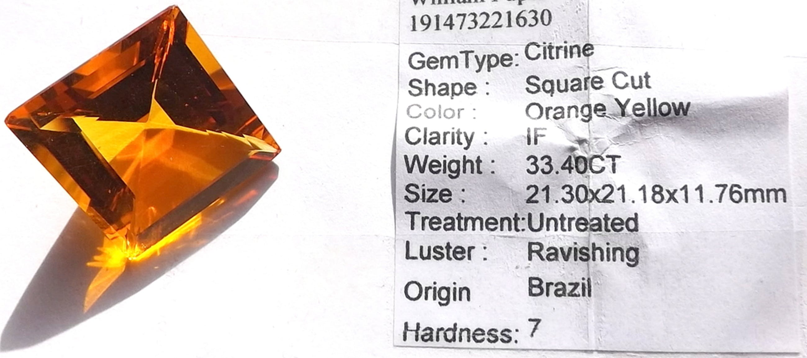 vorm / slijpsel: ovaal - checker cut - kleur: oranje / geel - helderheid: IF - goede conditie - zie verder de foto-frame voor oorspronkelijke beschrijving van de edelsteen.