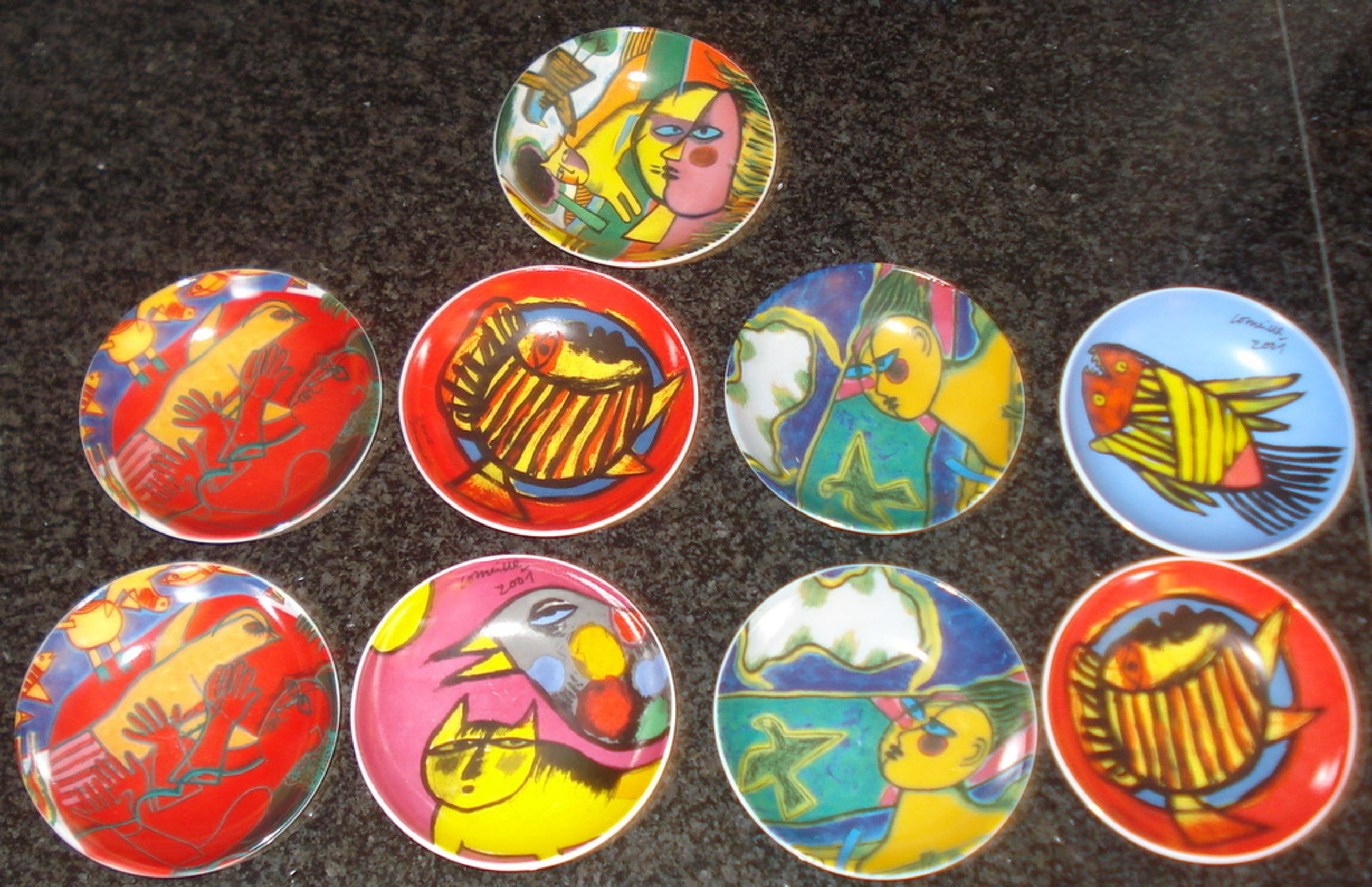 Negen Corneille schaaltjes, gesigneerd, diameter 12 cm met de zo welbekende motieven van Corneille!