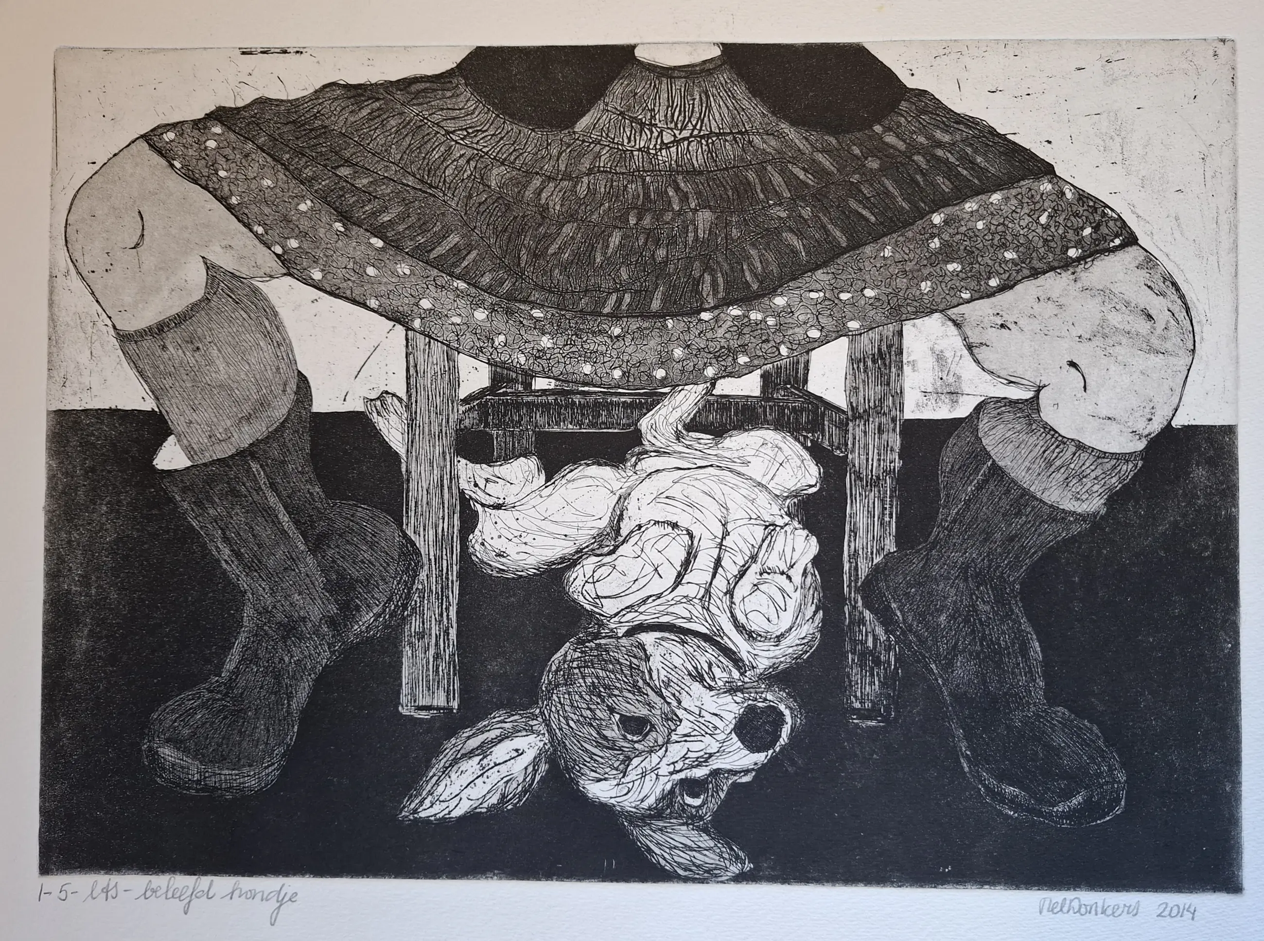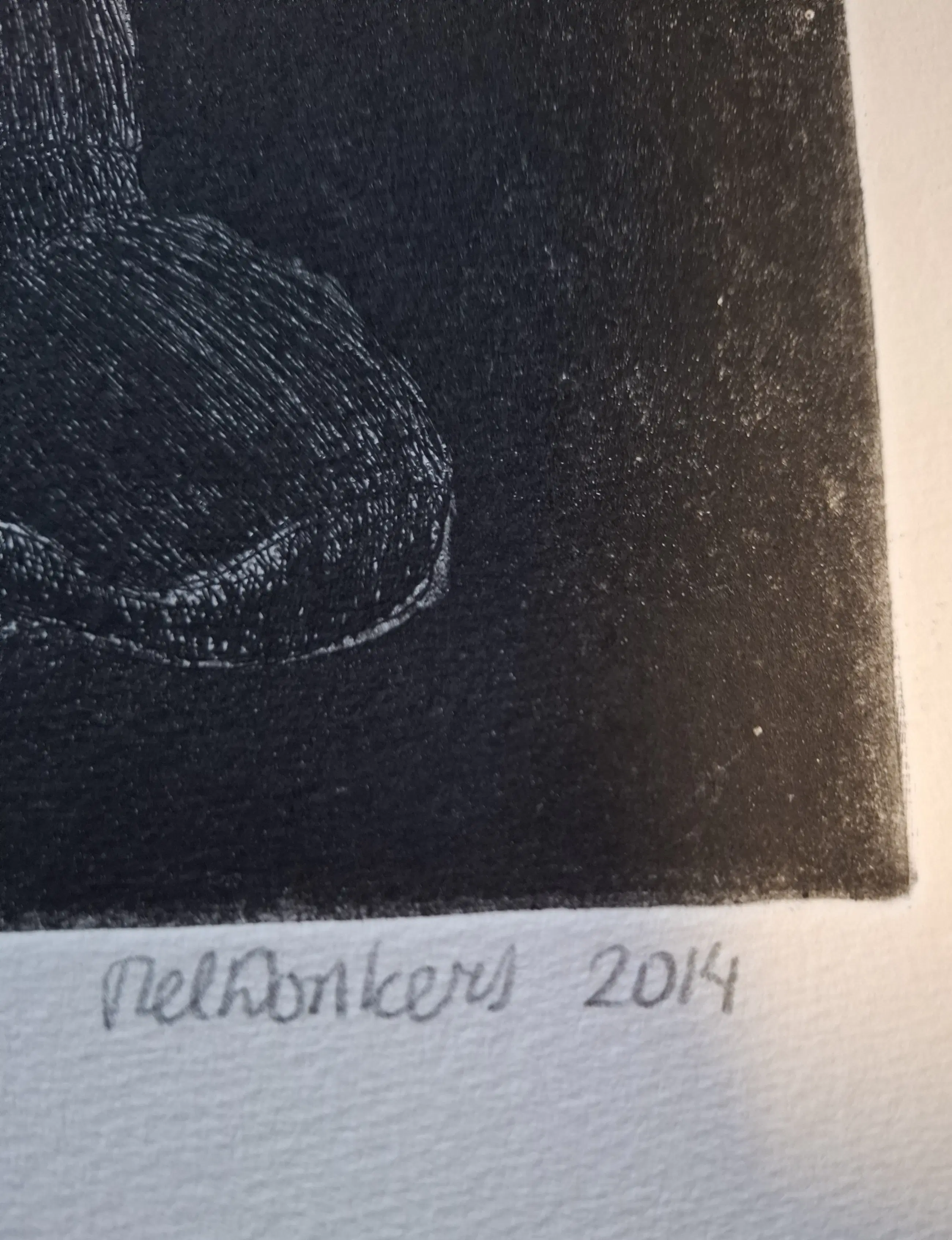 Nel Donkers geboren 1955. Deze ets zijn er maar 5 gemaakt . De eerste druk 1/5 . De voorstelling is wat pikant en het is hoe je het bekijkt . Totale groote 56 cm x 39 cm. De ets zelf 41 cm x 30 cm. Foto's maken deel uit van de omschrijving . Word verstuurd in een koker .