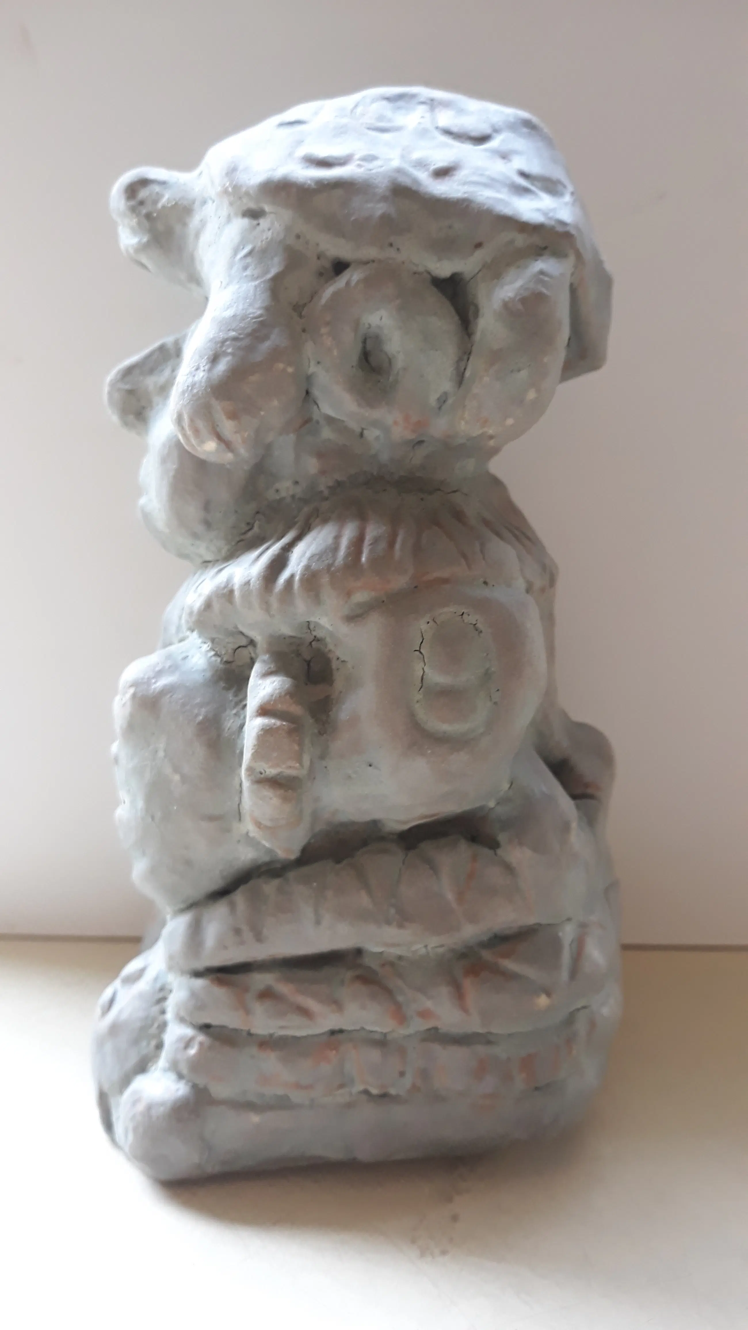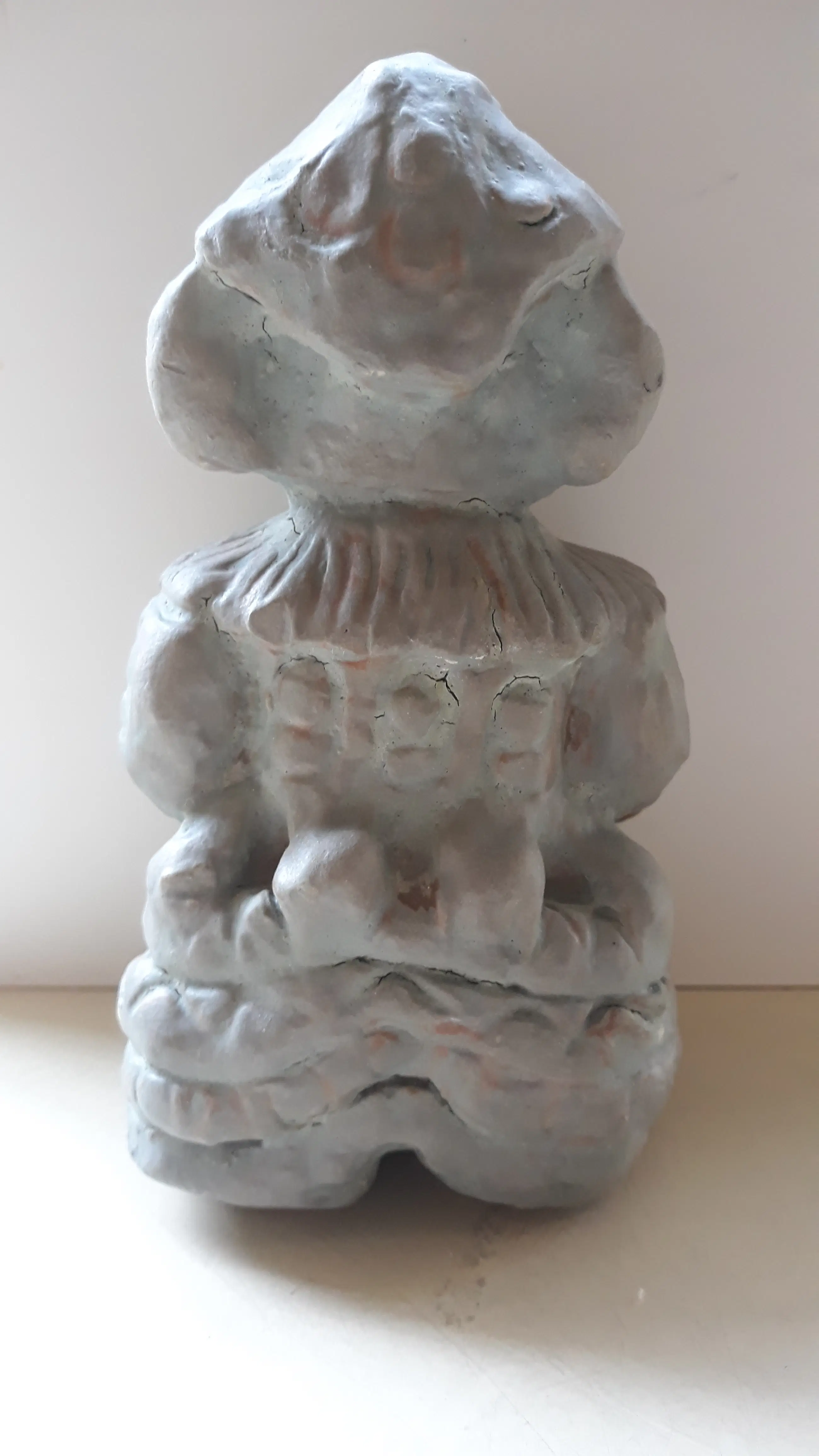 Inca figuur is een fantasie op de Inca's die zich tooien met vondsten uit de natuur, in dit geval met een schildpad op het hoofd. Aardewerk, mat geglazuurd, een unicum. Maakster Nel Donkers