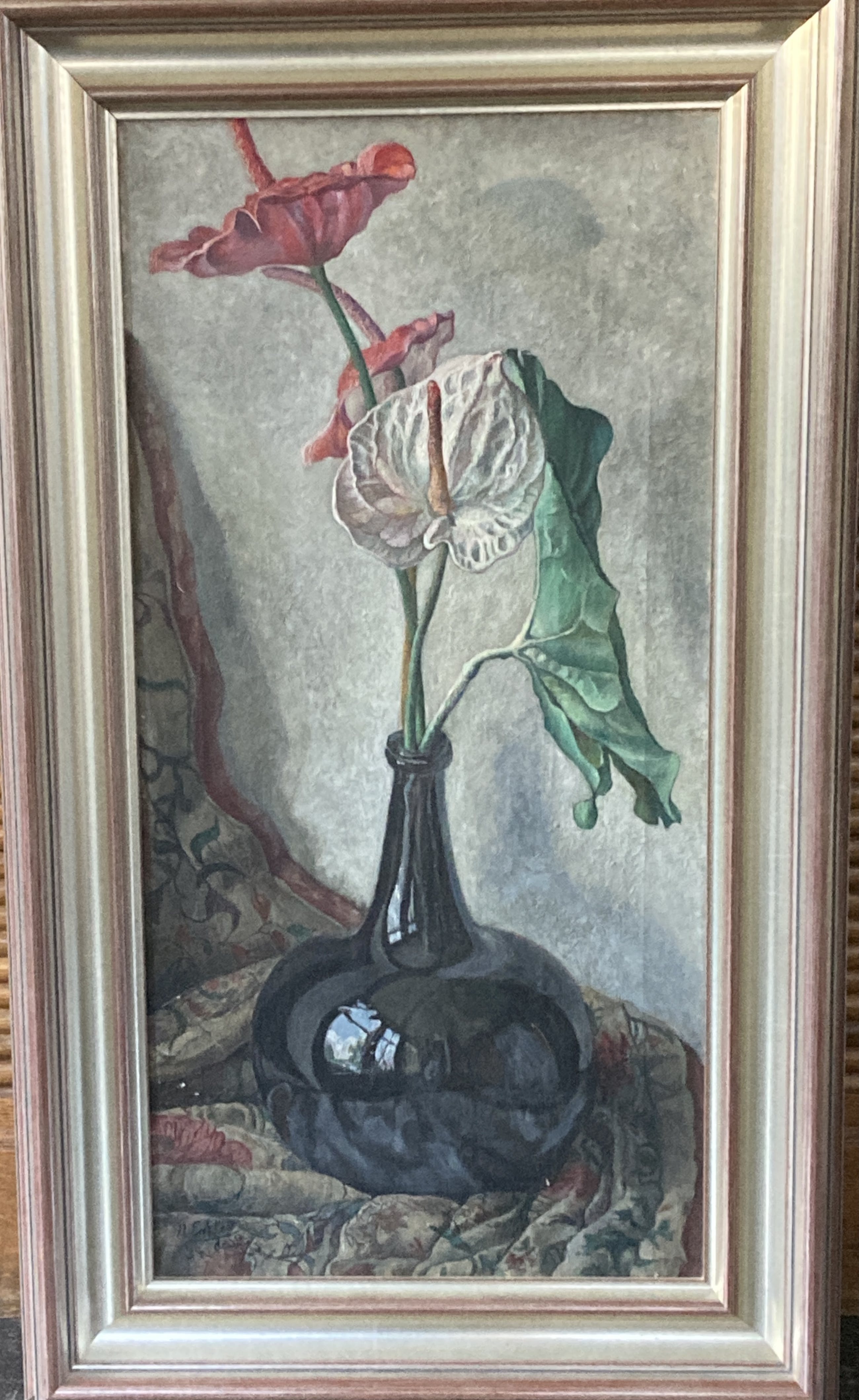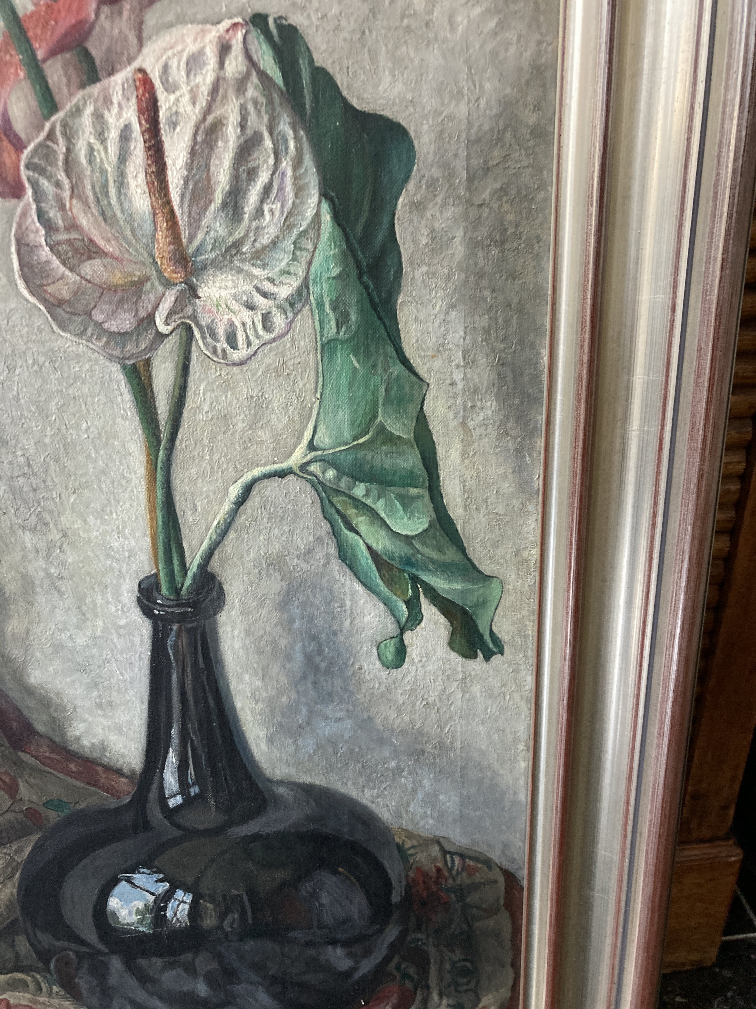 Prachtig bloemstilleven olieverf op doek, paar kleine verfschilfers beschadigd. Niet storend . Zeer realistisch geschilderd.
