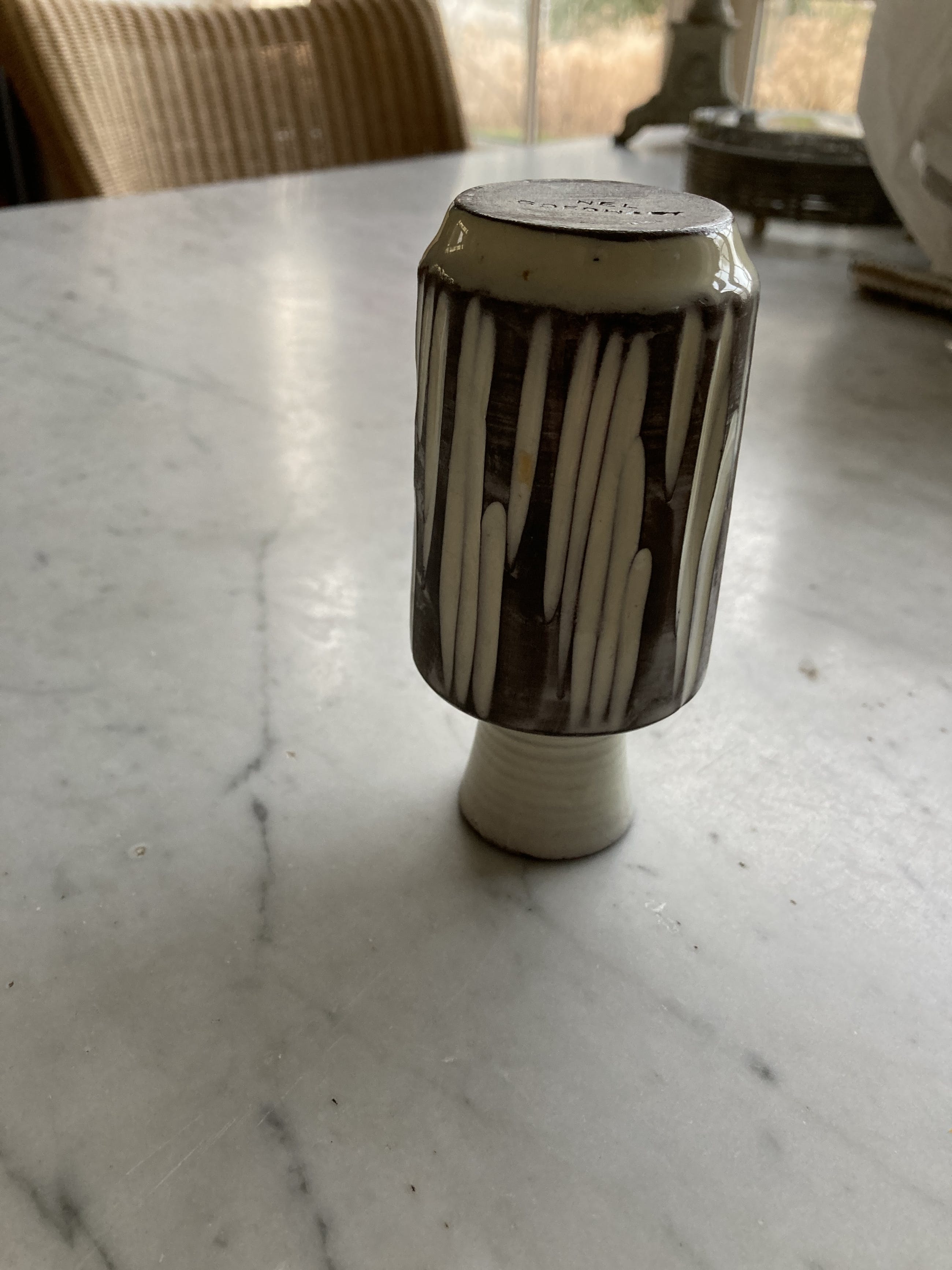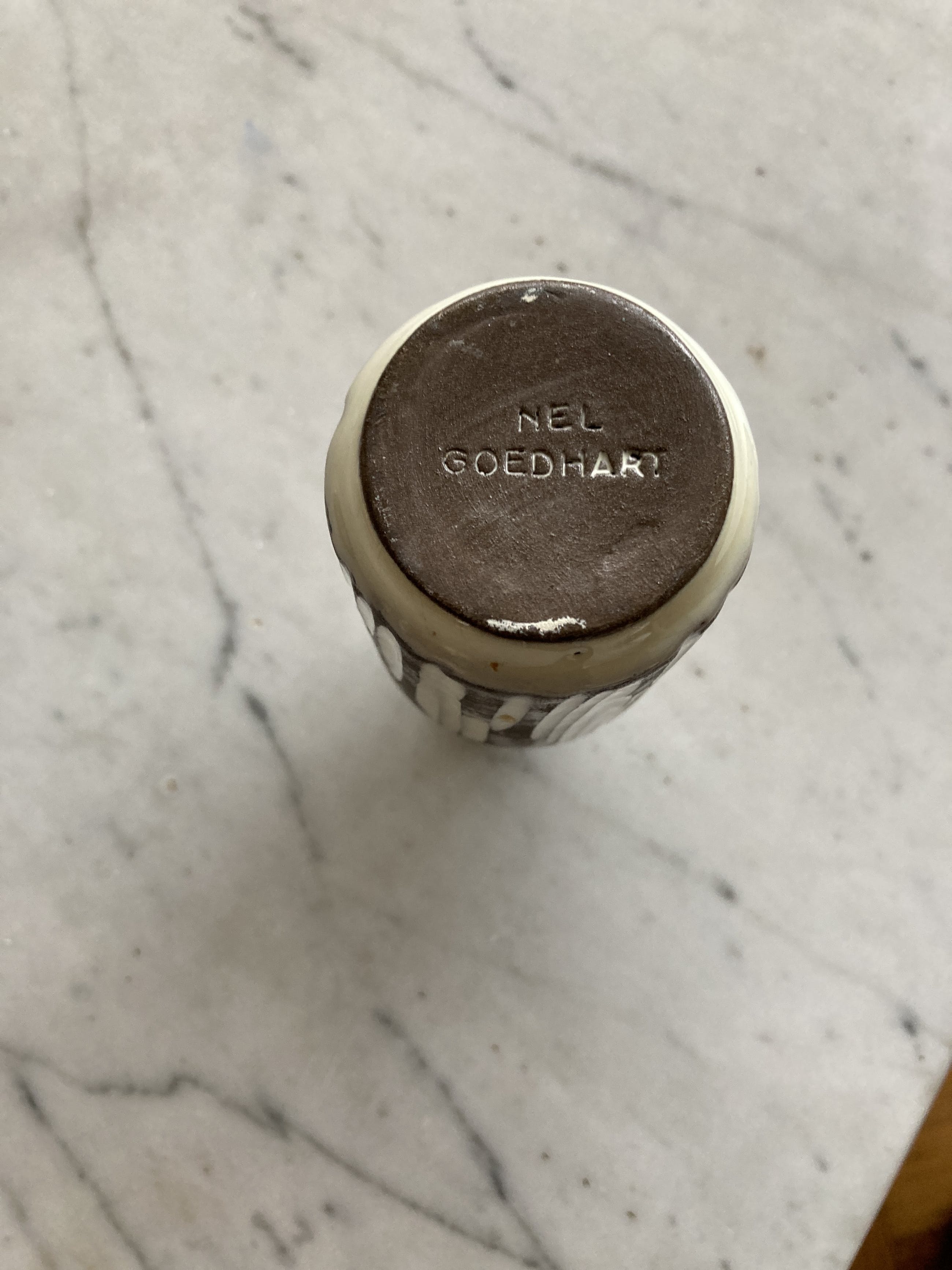 Prachtig ontworpen siervaasje van Nel Goedhart. Nel heeft slechts een tamelijk klein Oeuvre kunnen maken. Dit vaasje springt er echt uit, ook qua moderne decorkeuze. Het werk is gaaf, geen chips. Aangetekende/verzekerde verzending kosten koper. Op afspraak is contactloos ophalen in Rotterdam mogelijk.