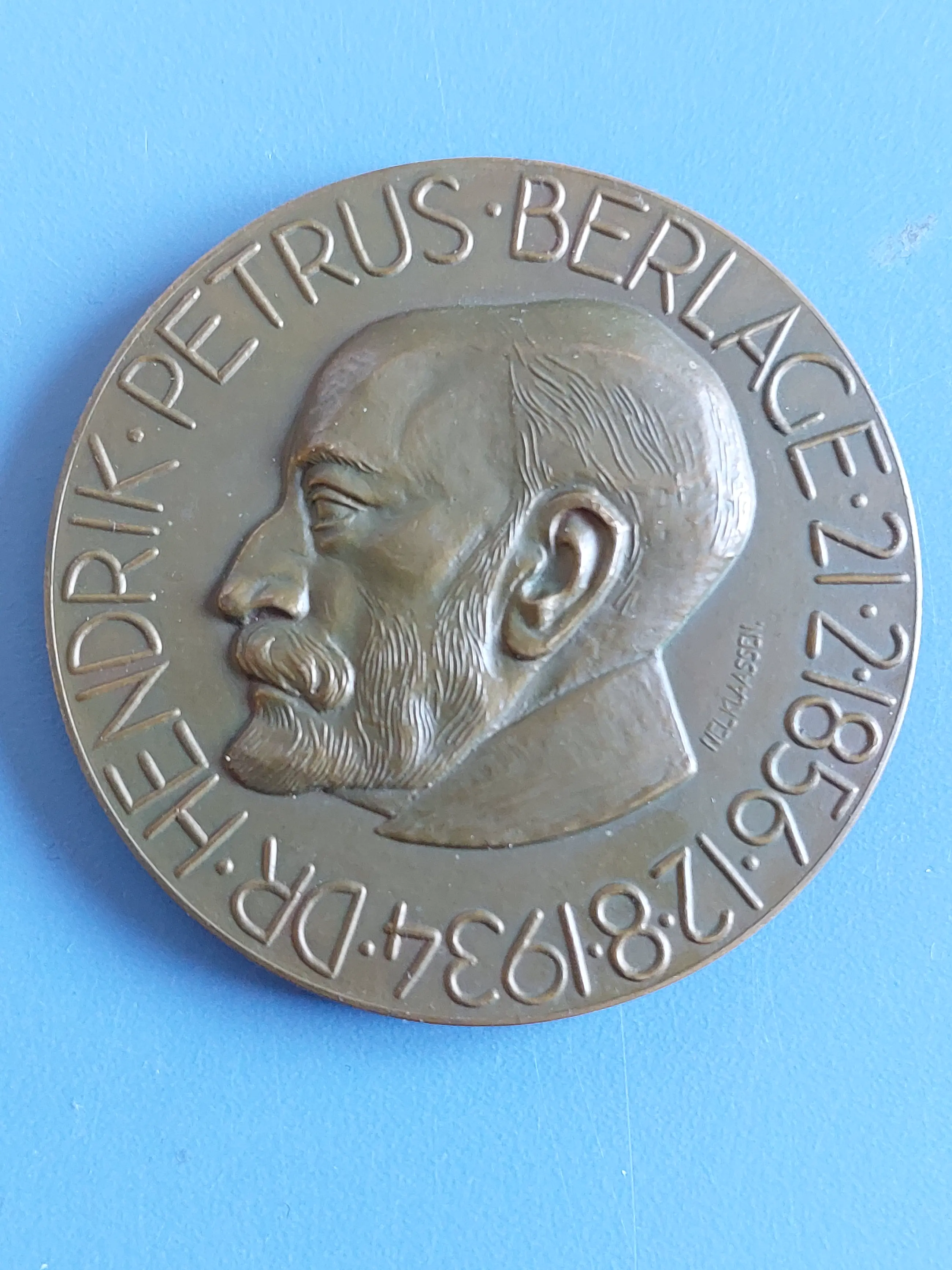 Nel Klaassen, leerling van Bronner heeft, naar de foto's te oordelen, een scherp en goed gelijkend, grafisch portret van de architect Berlage (1856-1934) geboetseerd. Een benige kop met snor en baardje gesteund door een kraag. Een eenheid op zich-zelf met in schreefloze, wat zware letters naam en levensdata. De keerzijde geeft zijn bekendste werk: het enige gebouw in Nederland waar naam, functie en ontwerper altijd in n adem genoemd worden: De Beurs van Berlage. Beurzen zijn een weinig gangbaar bouwtype en de door Klaassen uitgebeelde kant is de zuidzijde met de hoge toren, de campanile. Dit is een aanpak die Berlage ont-leende aan Italiaanse palazzi pubblici, Siena bijvoorbeeld. Daar is het palazzo pub-blico een manifestatie van stedelijke, burgerlijke macht en zelfbewustzijn als tegen-wicht voor de kerken. Berlage wilde iets vergelijkbaars voor zijn ontwerp en hij maakte er een `Gesamtkunstwerk' van door Lambertus Zijl het beeldhouwwerk te laten uitvoeren, Jan Toorop en R.N. Roland Holst de wandschilderingen en Albert Verwey de korte, stichtende dichtregels. Twee daarvan, 'Beidt uw tijd' en 'Duur uw uur' zijn in de halve cirkel neergezet. De belettering houdt de verbeelding van de Beurs mooi in evenwicht.