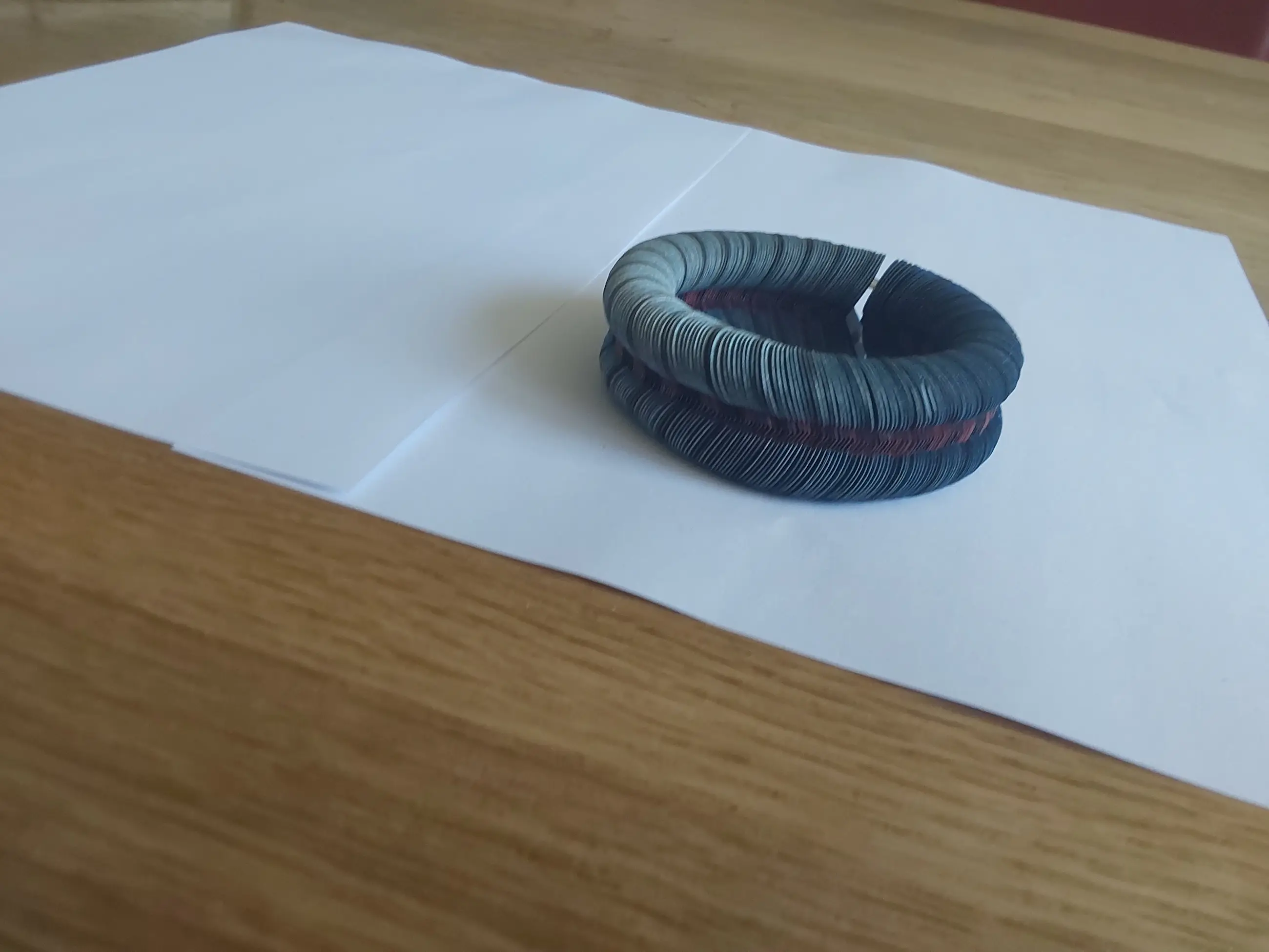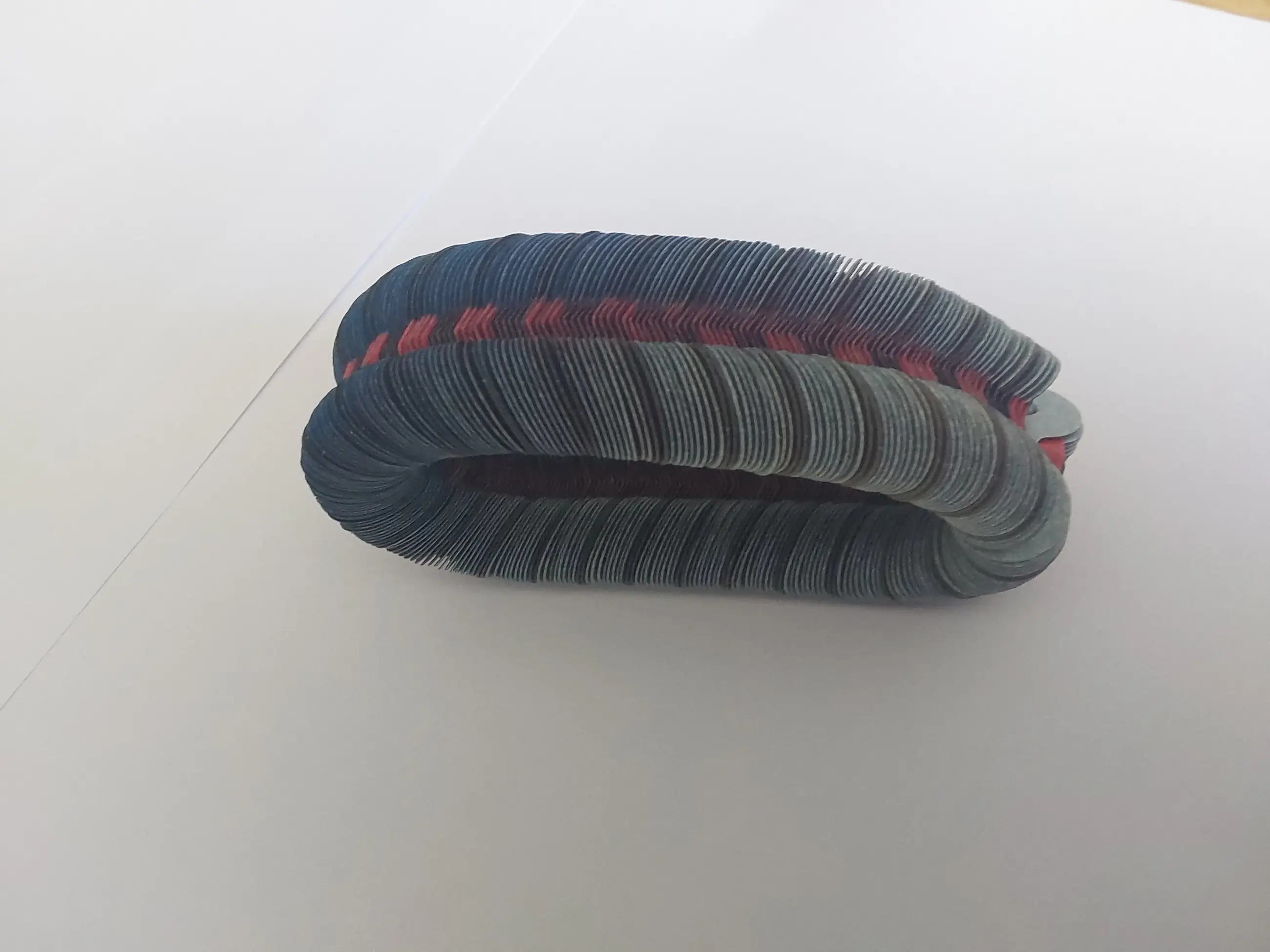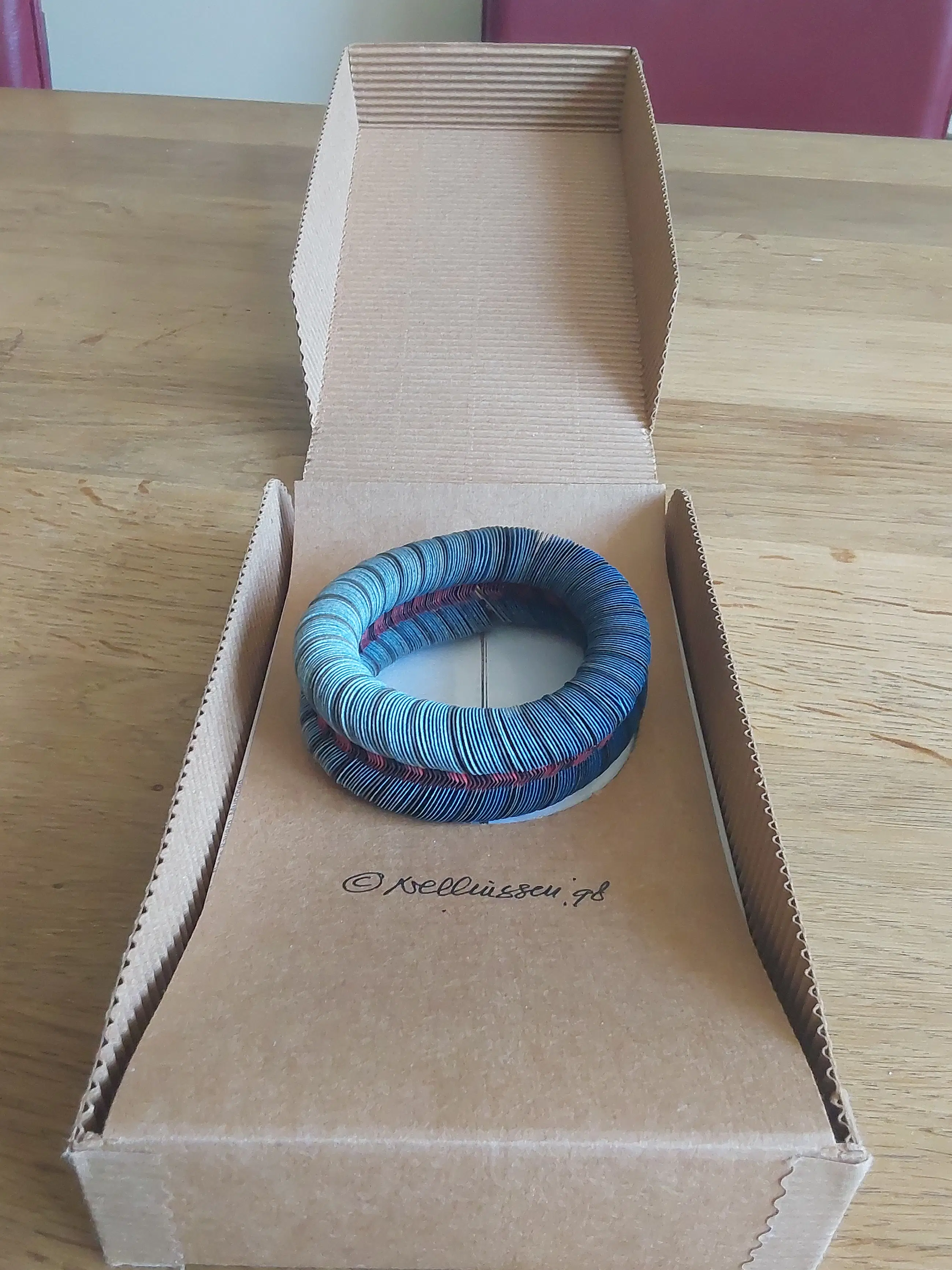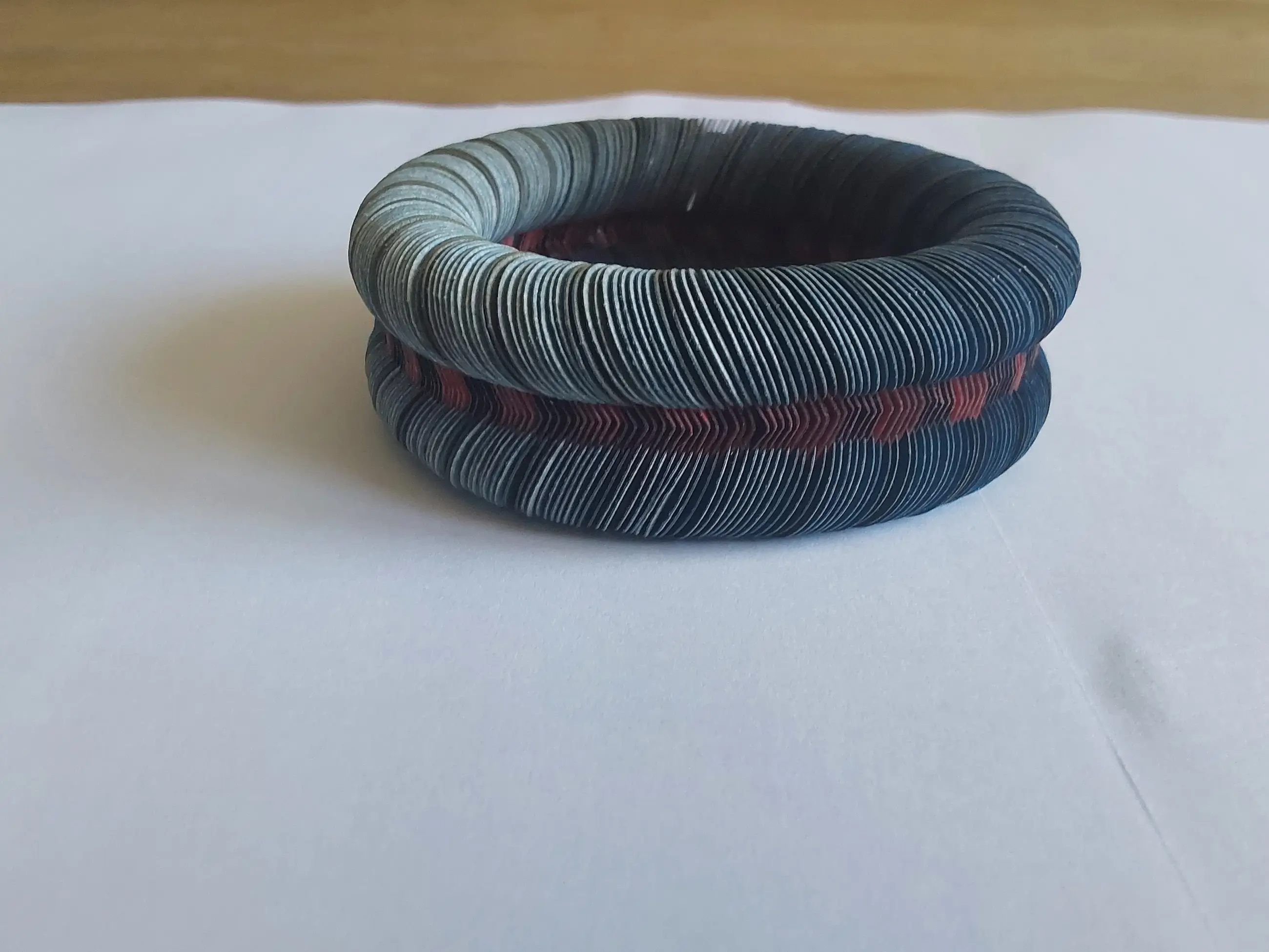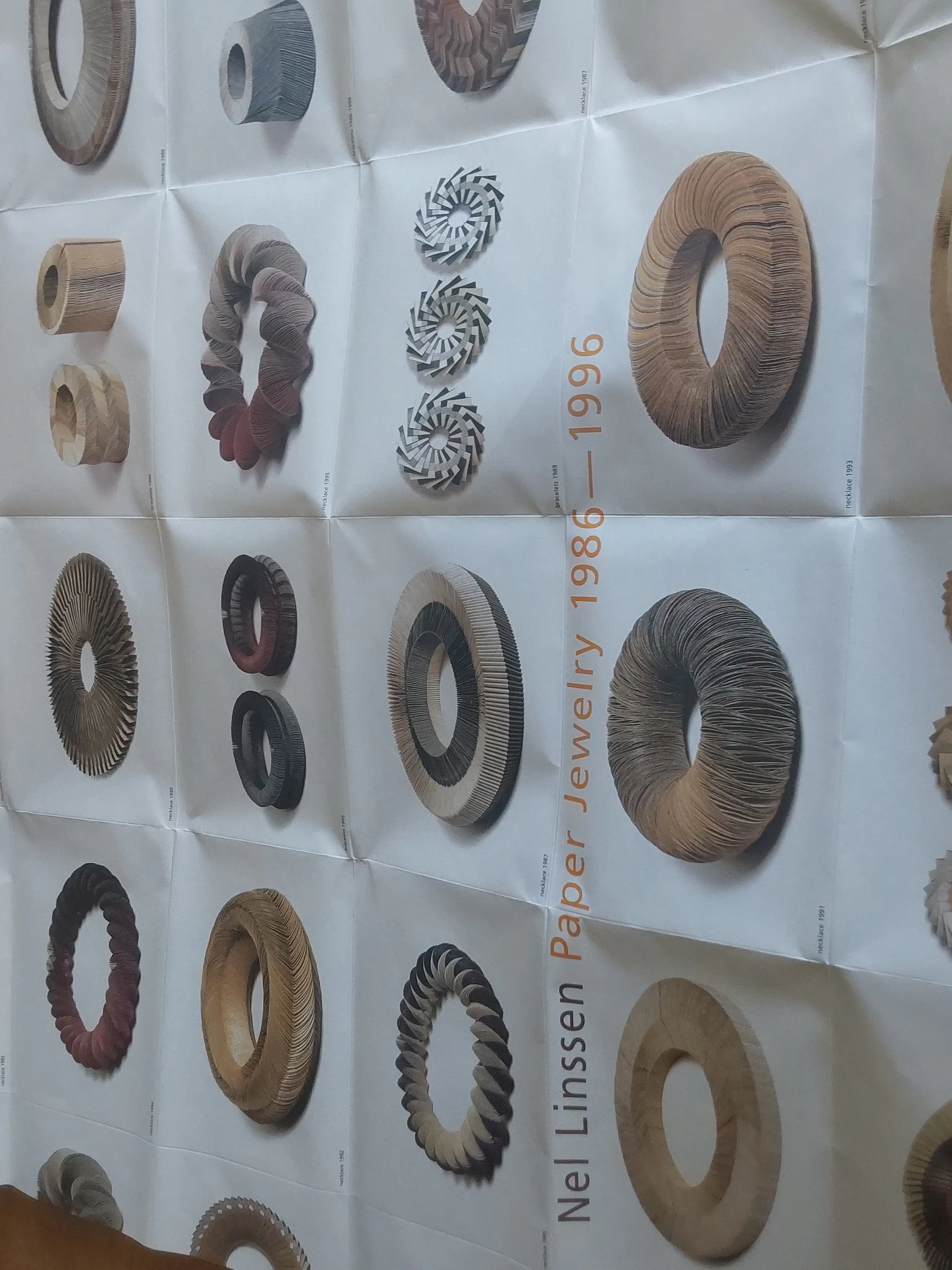 Een armband van geïmpregneerd papier in prachtige, in elkaar verlopende kleuren. Het werk van Nel Linssen is internationaal bekend en erkend. De armband zit in de originele doos en is daar ook gesigneerd. In de doos zit ik een gevouwen poster van haar werk. De armband is in nieuwstaat.