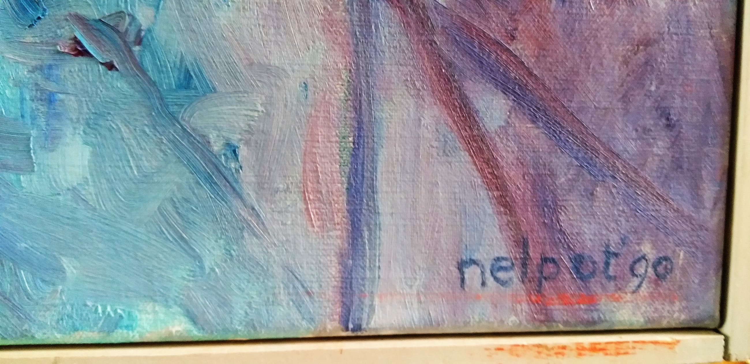 Krachtig kleurgebruik in deze versie van Nel Pot (1918-2011). Hand gesigneerd, gedateerd 1990. Olieverf op doek, afmetingen ca. 100x100cm. Aan drie kanten gevat in grijs, gebruikt en origineel raamwerk.