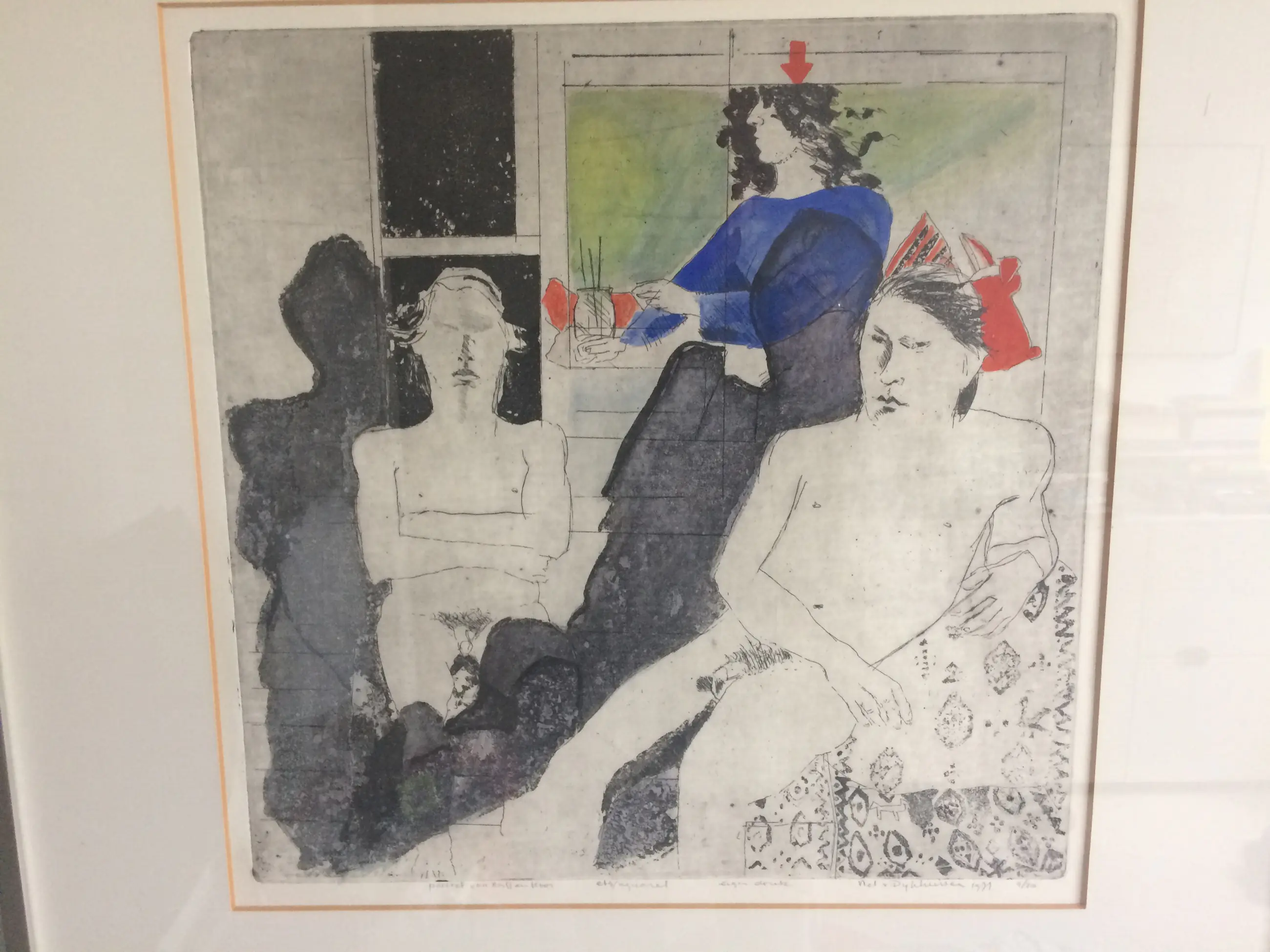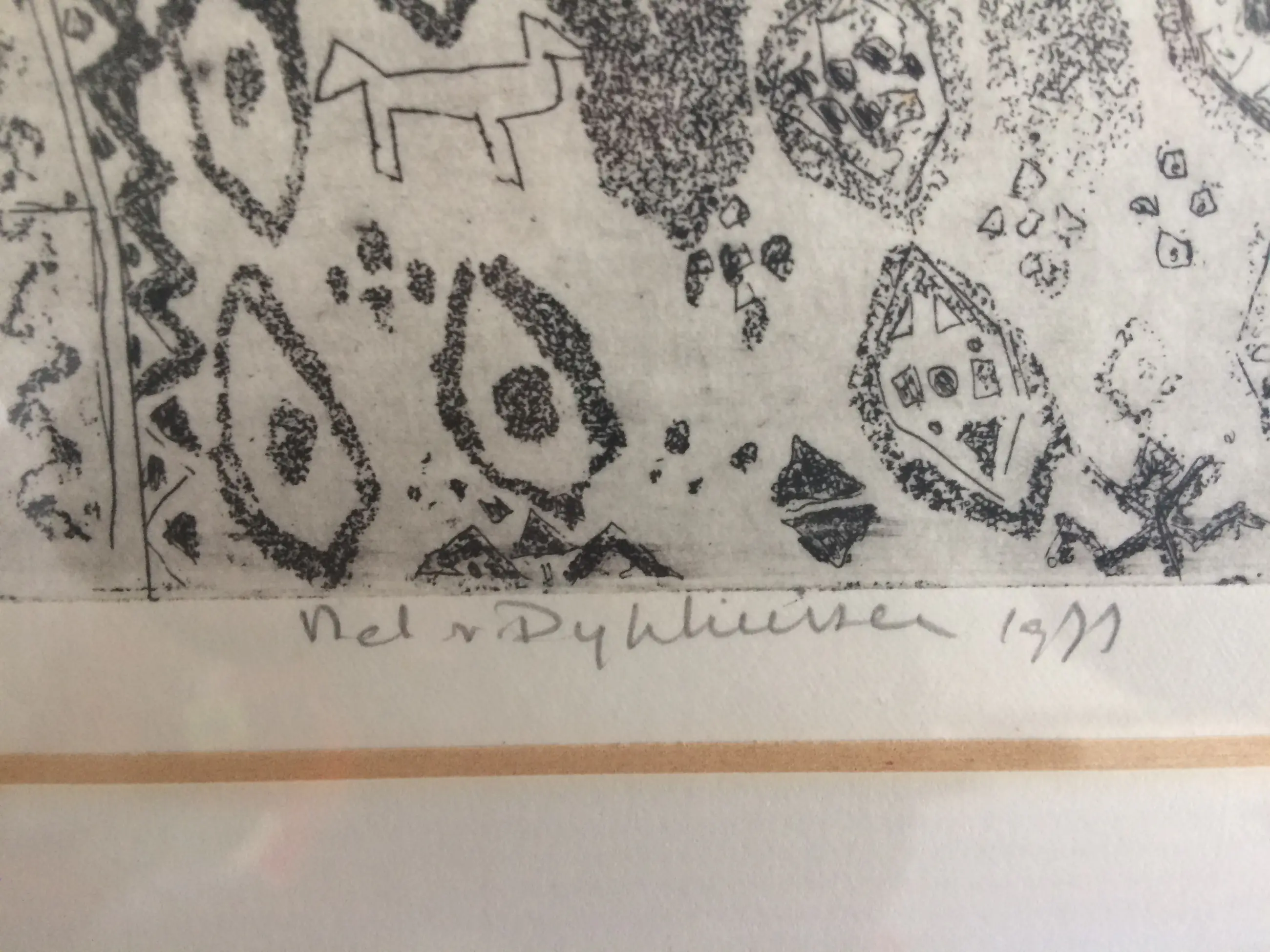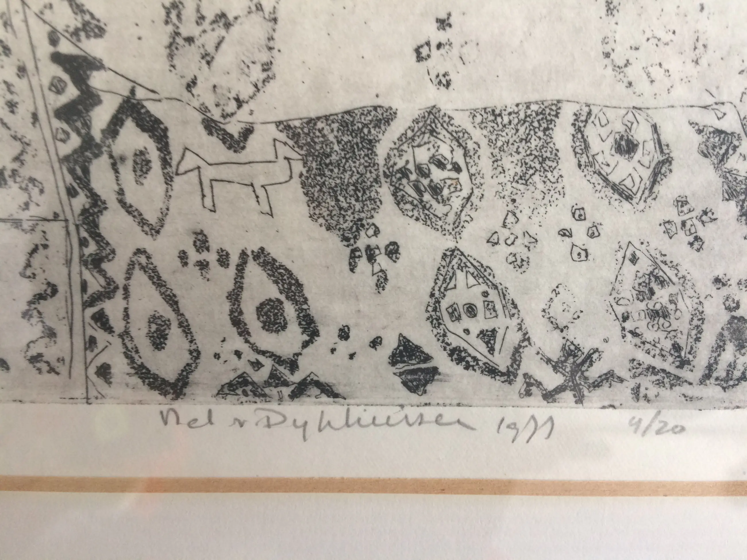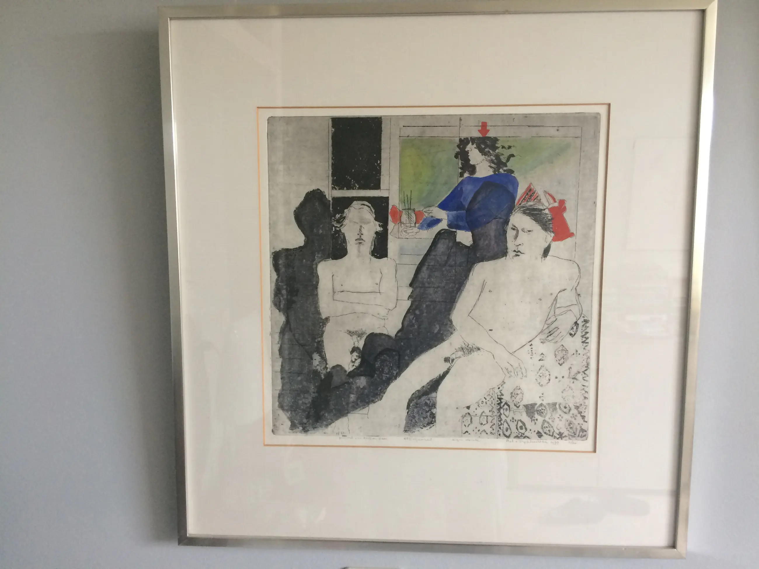 Portret van Roelf en Koos: Fraaie ets/aquarel, eigen druk van de Utrechtse kunstenares Nel van Dijkhuisen (1951). Professioneel ingelijst met passe-partout. Sfeervol en intieme frontale weergave van geportretteerden samen met beeld van de kunstenares zelf.