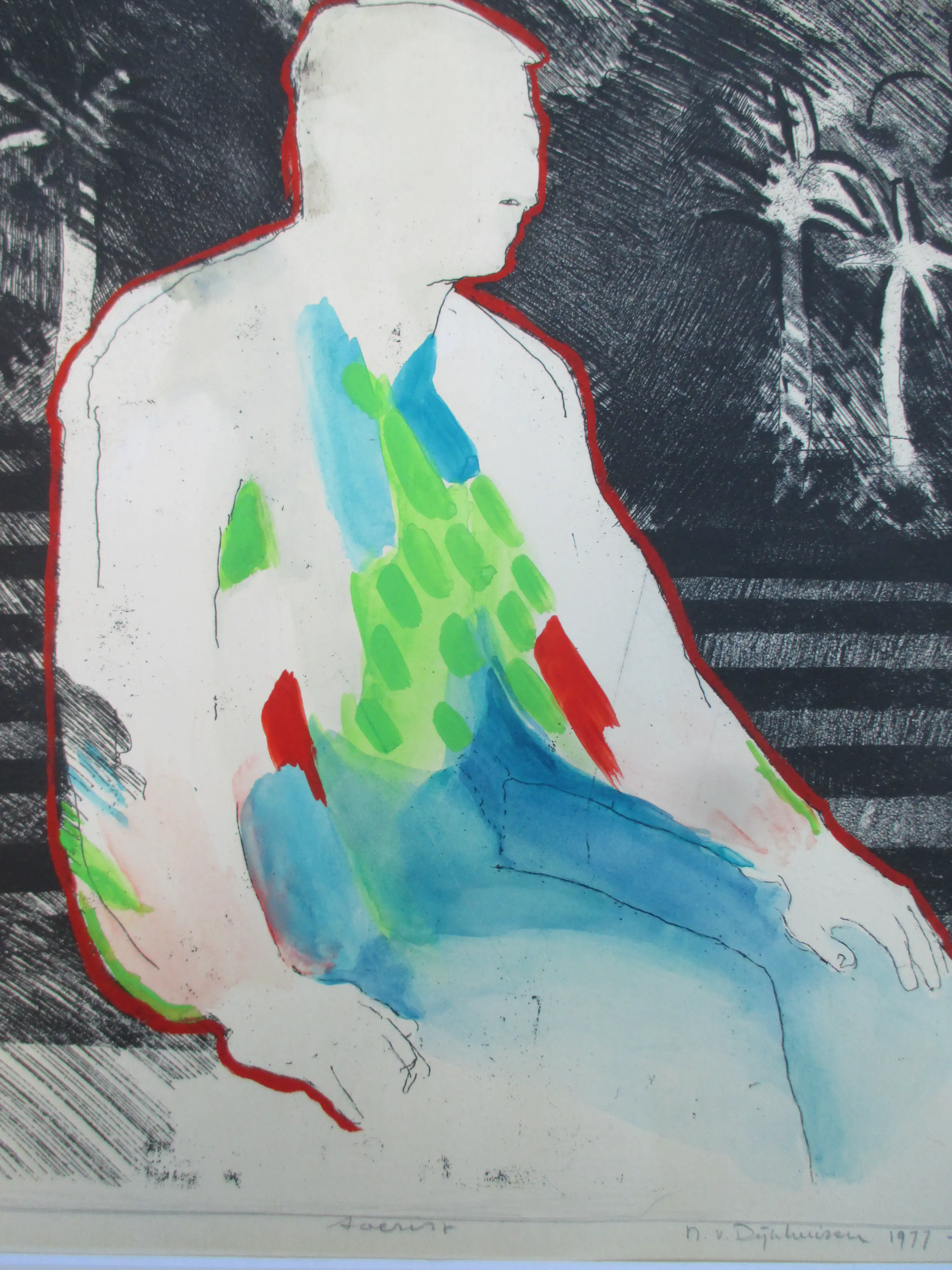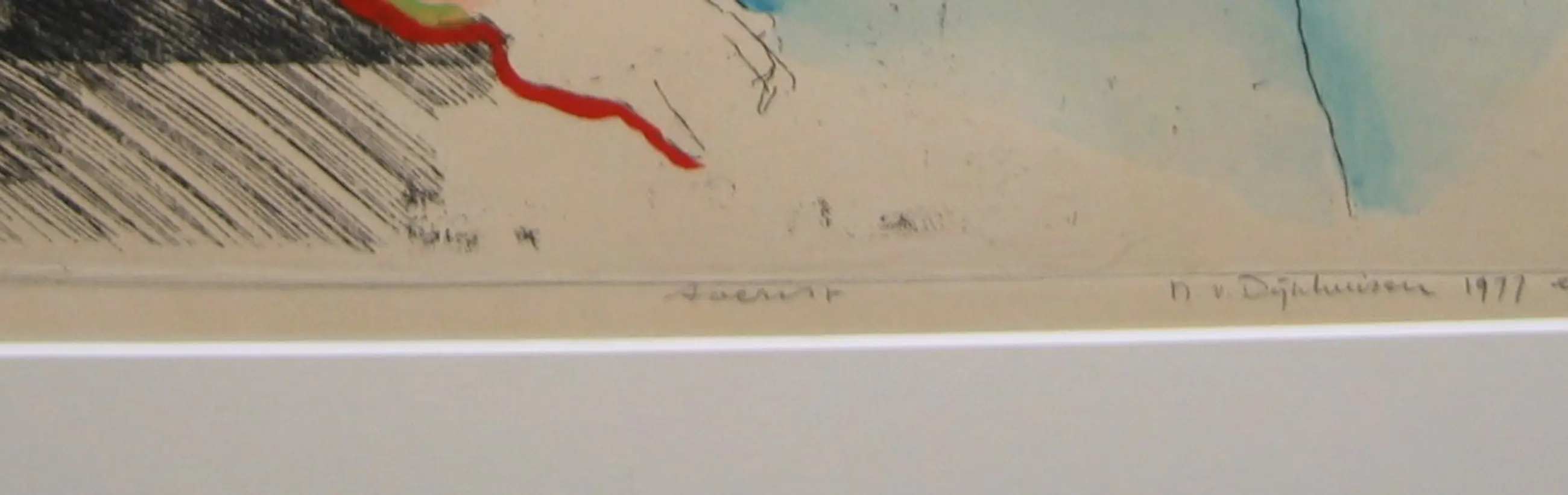 Deze deels met aquarel ingekleurde ets is rechtsonder gesigneerd. Het werk is ingelijst met passe-partout en zit achter glas.