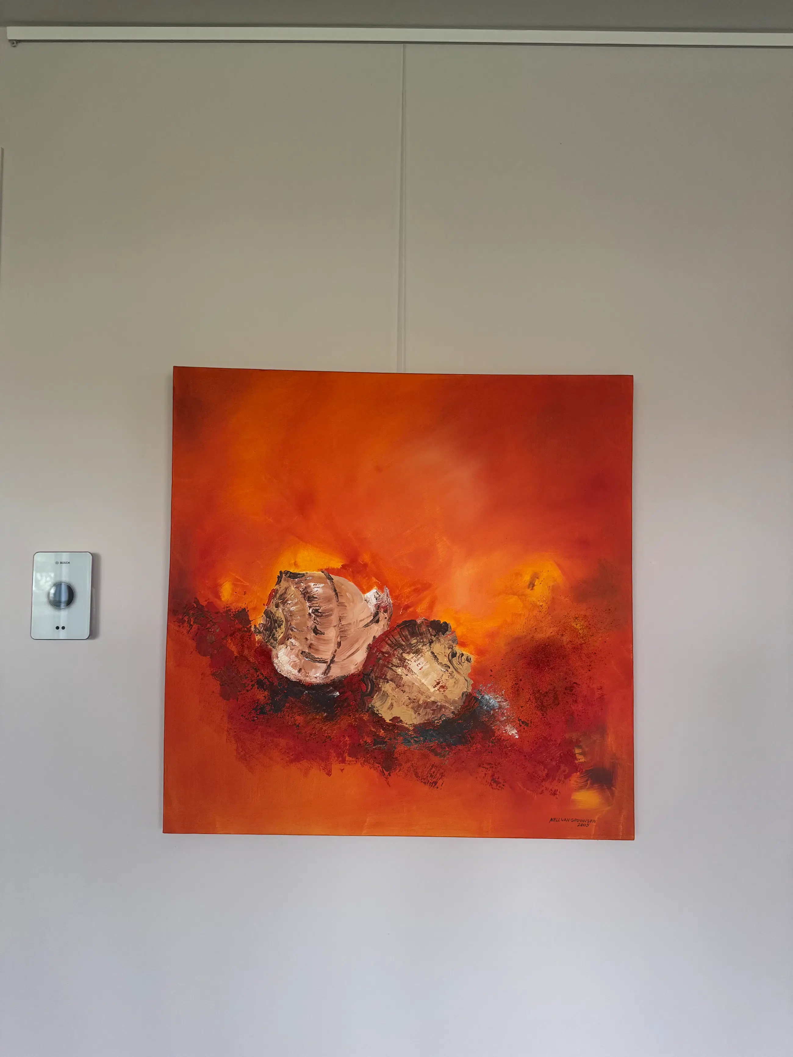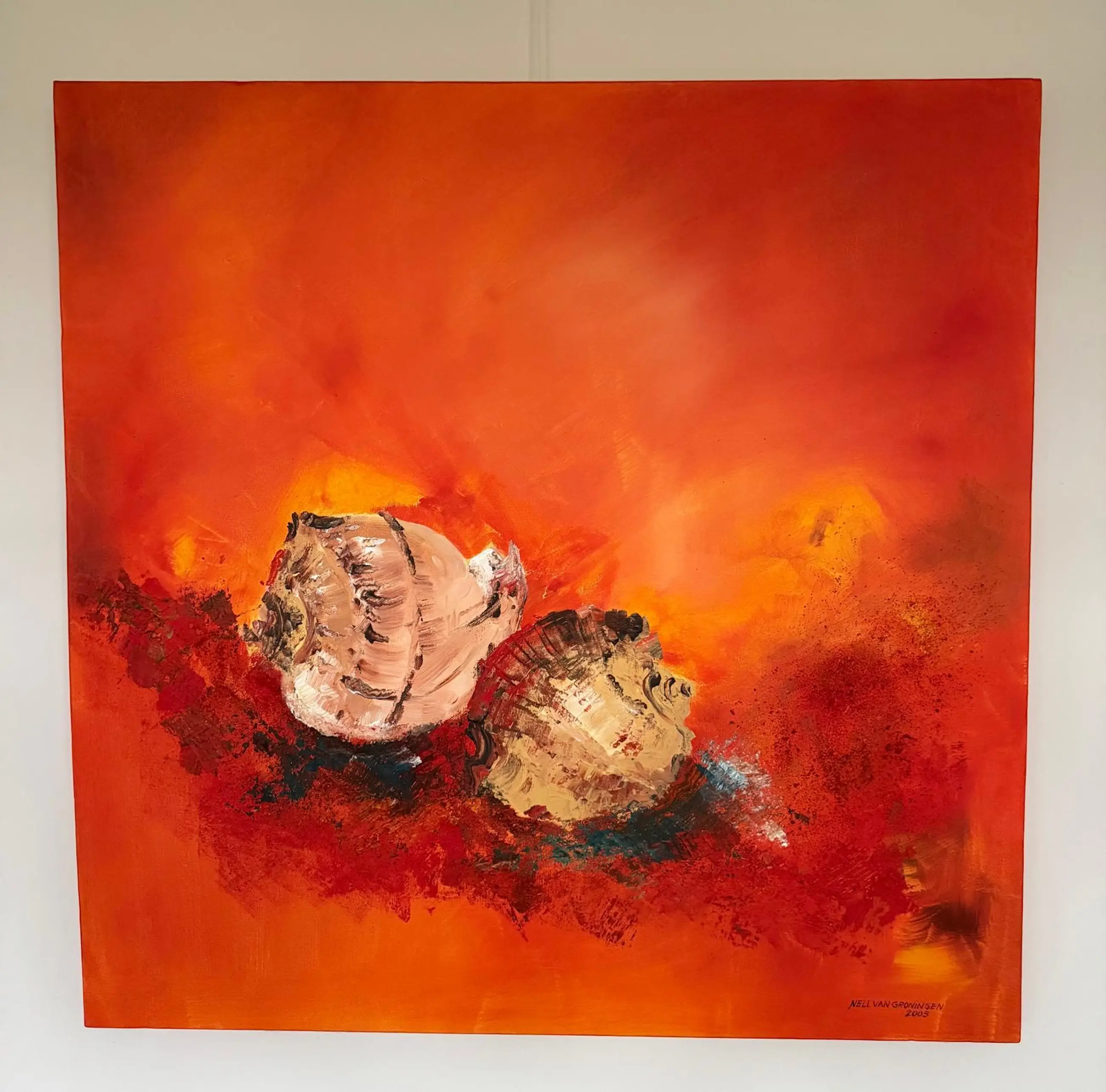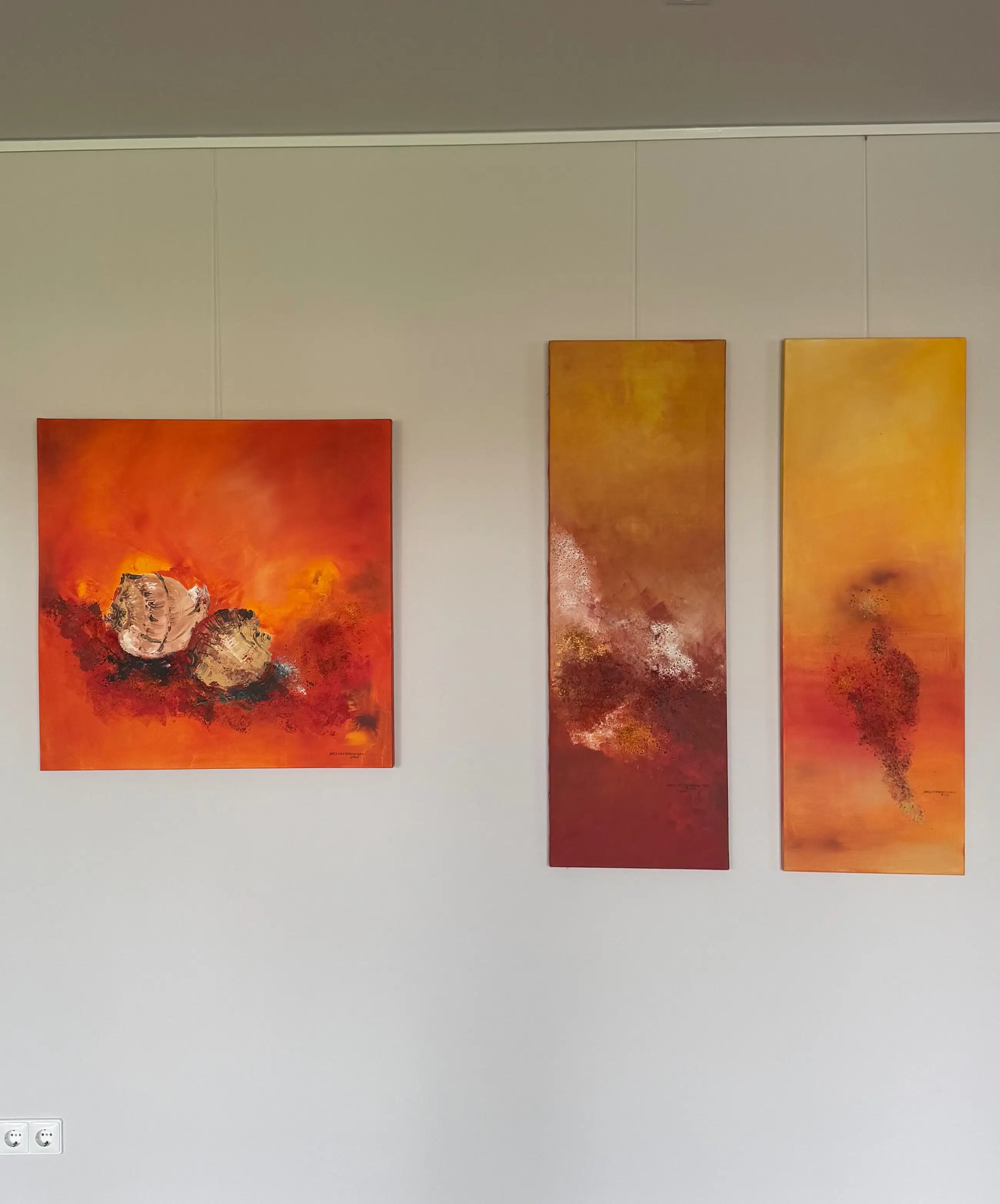 1. Acrylwerk schelpen met zand 80x80 cm 2. Acrylwerk zonder titel 120x40 cm 3. Acrylwerk zonder titel 120x40 cm