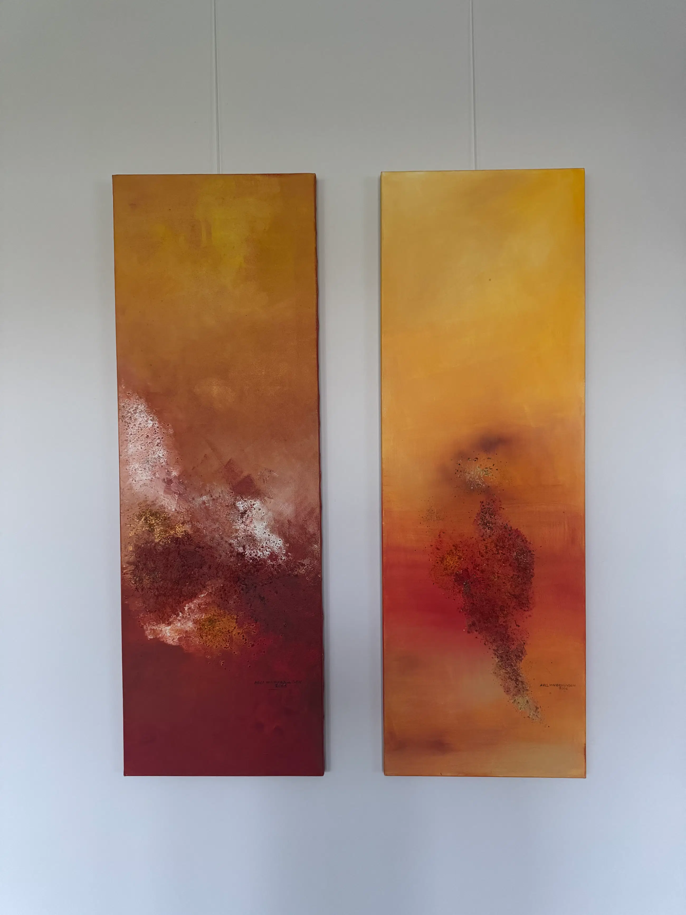 De structuur en kleurverlopen geven het werk veel diepte. Het vierkante paneel vormt een krachtig middelpunt, terwijl de twee verticale panelen de compositie verlengen en rust brengen. Samen vormen de drie werken één geheel dat zowel energiek als harmonieus aanvoelt.