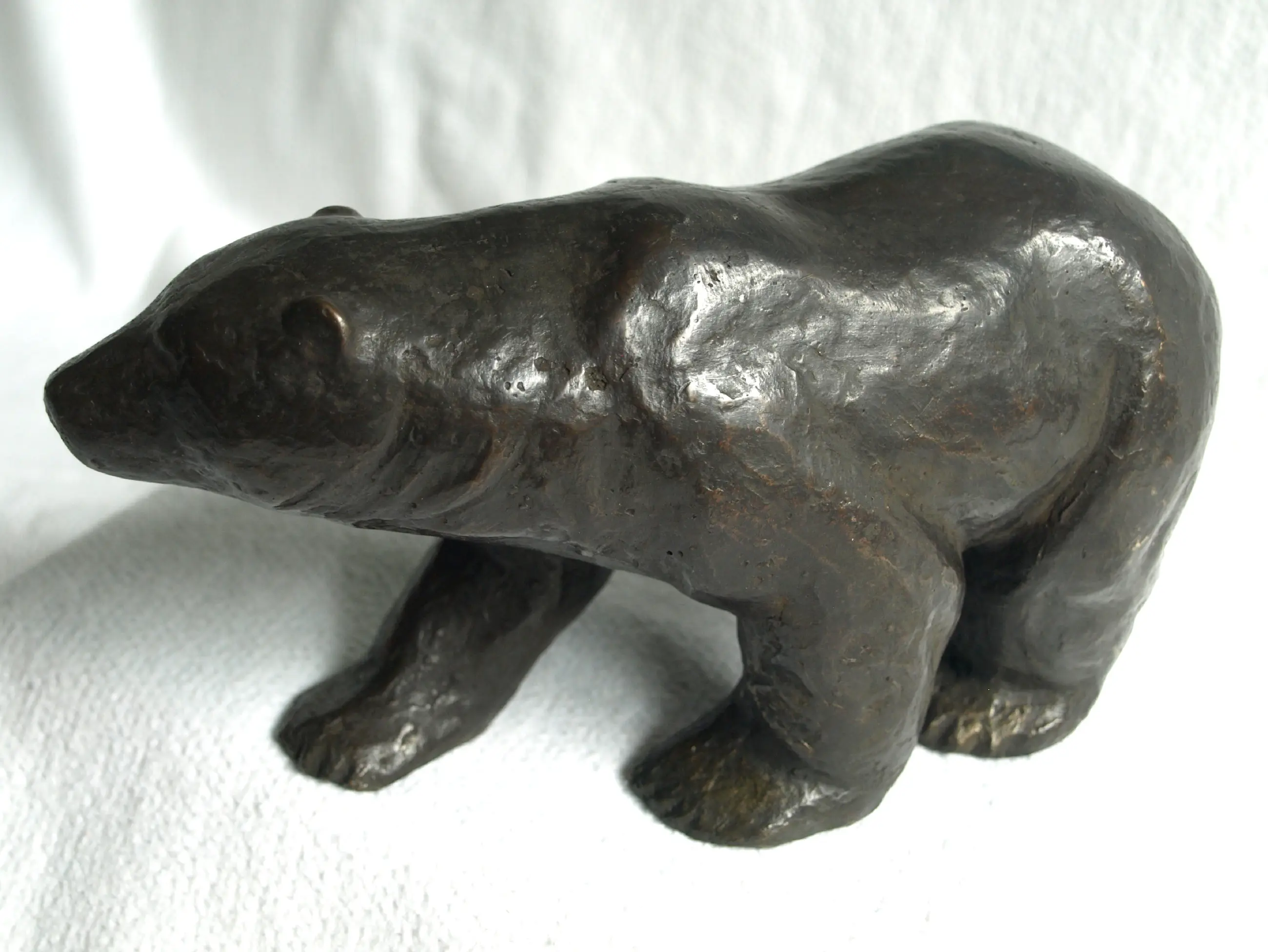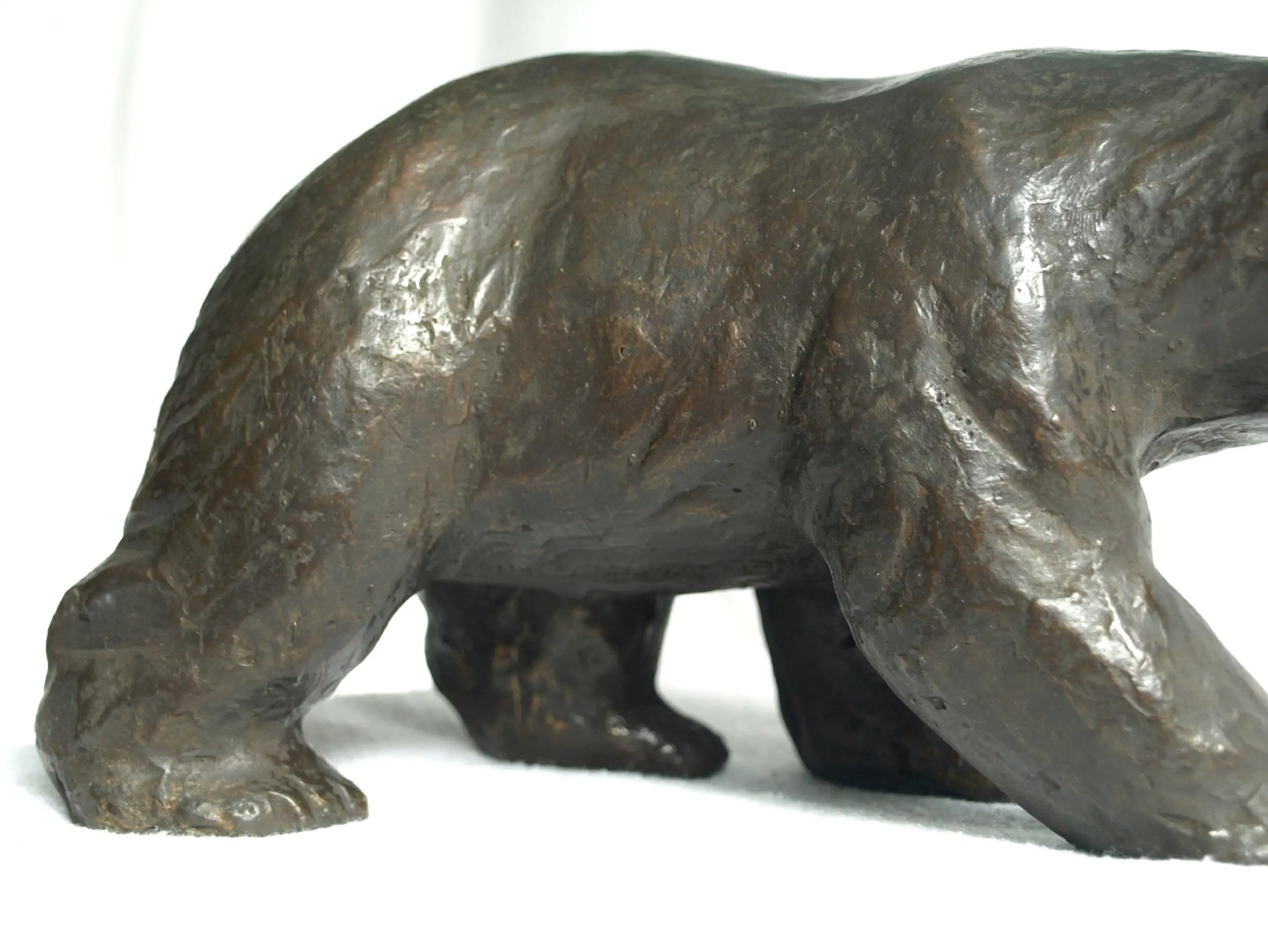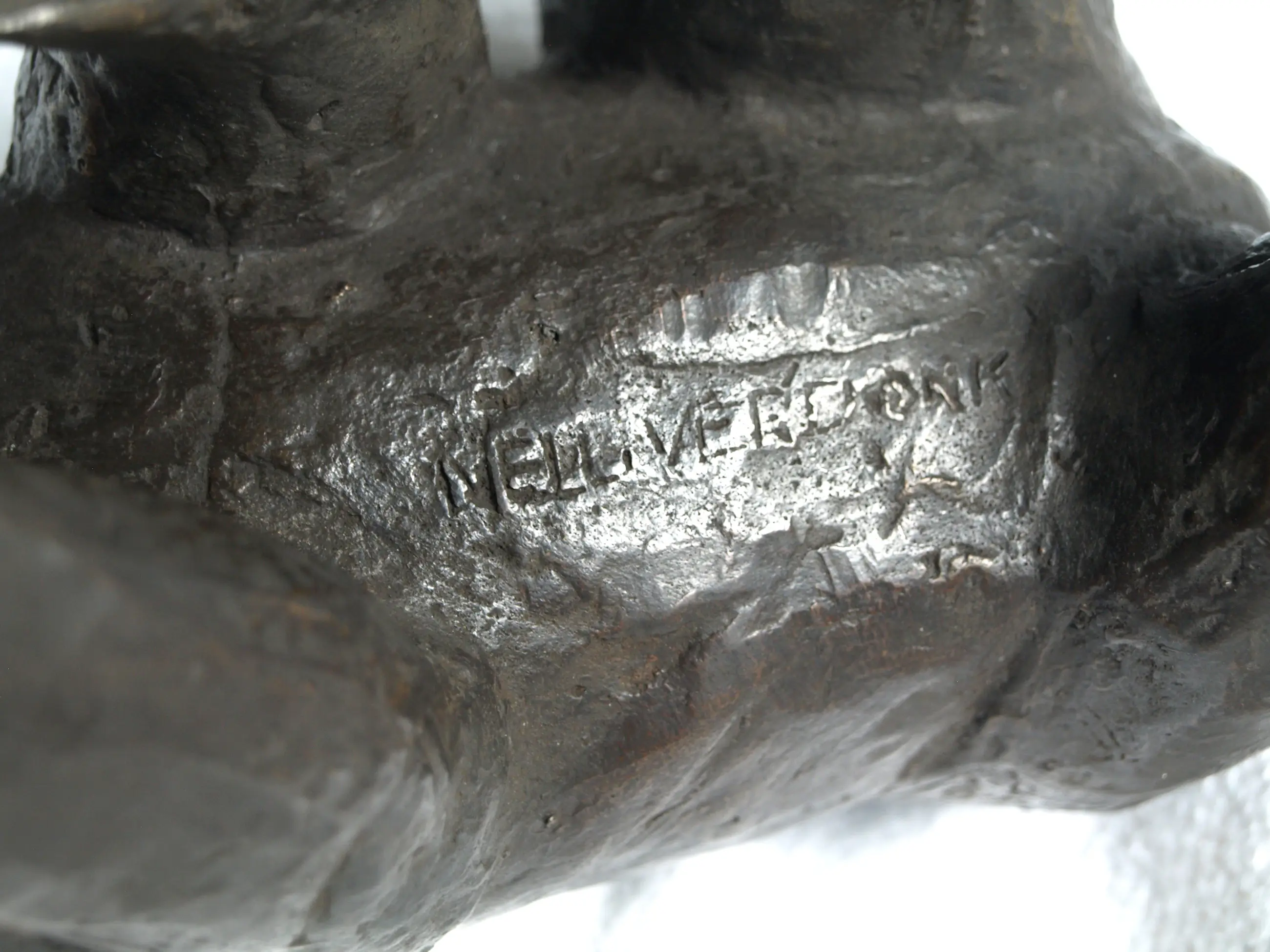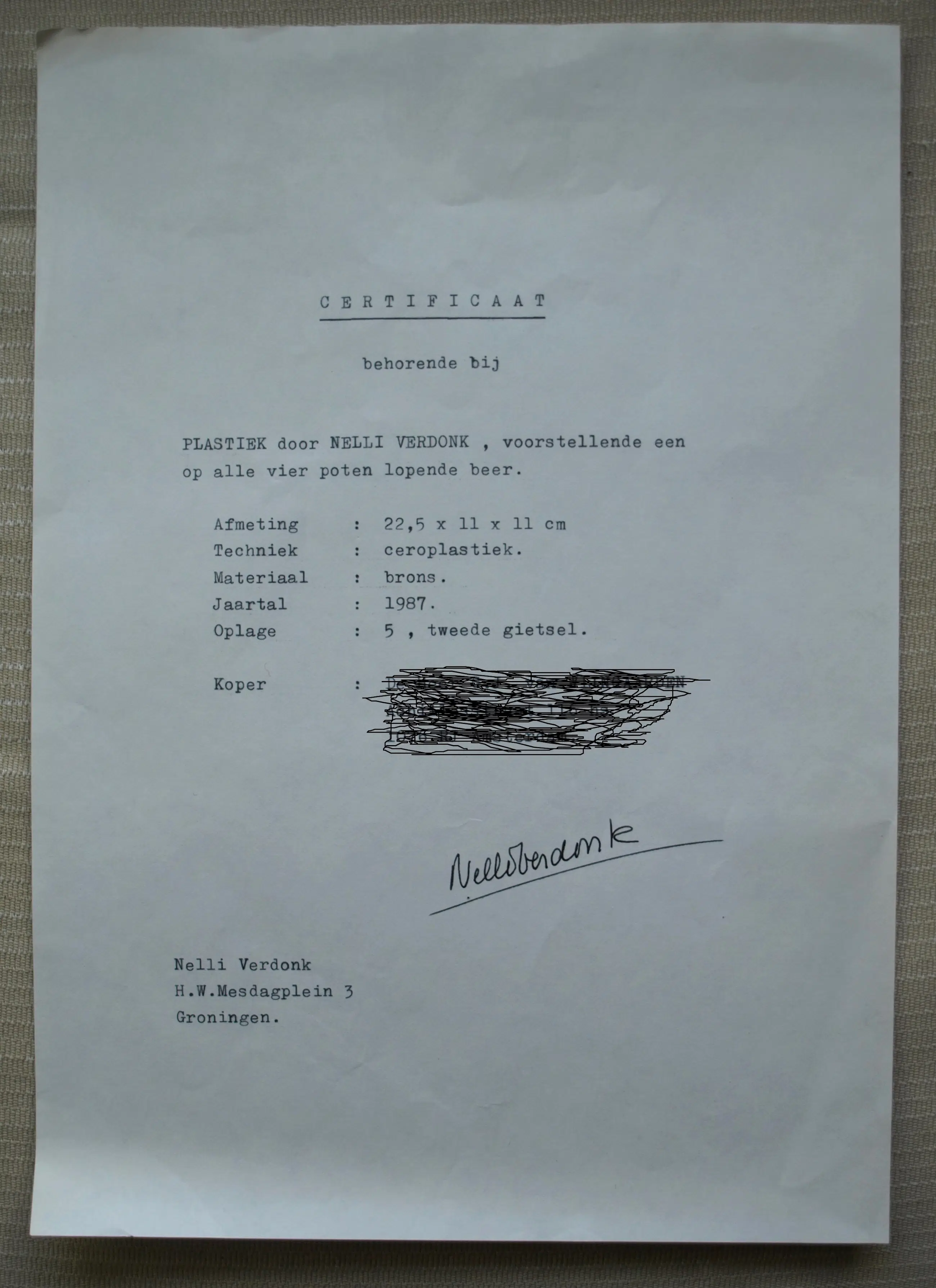 Een bronzen beeld uit 1987 van de, inmiddels 89-jarige, Nederlandse beeldhouwster Nelli Verdonk (1934-), voorstellende ‘een op alle vier poten lopende beer’. Met certificaat (zie de 16e foto; op de foto is de naam van de koper onleesbaar gemaakt i.v.m. de privacy). -Techniek: Ceroplastiek (wasboetseerkunst, geboetseerd in was). -Materiaal: Brons. -Gesigneerd aan de onderkant van het beeld. Ook gesigneerd op het certificaat. -Gemaakt in een oplage van 5, tweede gietsel. -Afmetingen: 11 x 23 x 10 cm (hoogte x breedte x diepte). -Gewicht: 2529 gram. -Herkomst: Uit een inboedel. -Conditie: In zeer goede staat. Met een certificaat dat is gemaakt en gesigneerd door Nelli Verdonk. Zie ook de foto’s voor een eigen indruk.