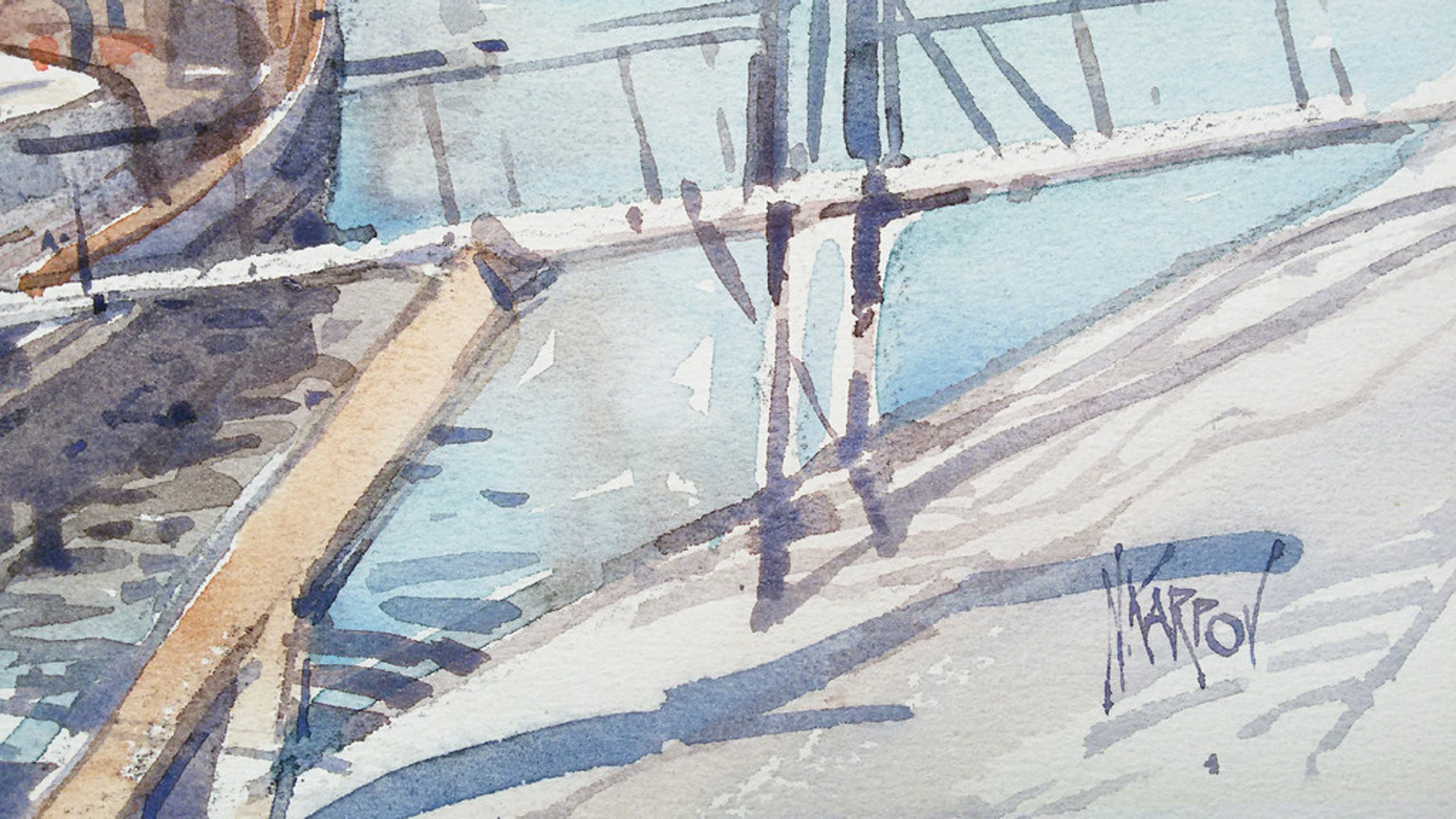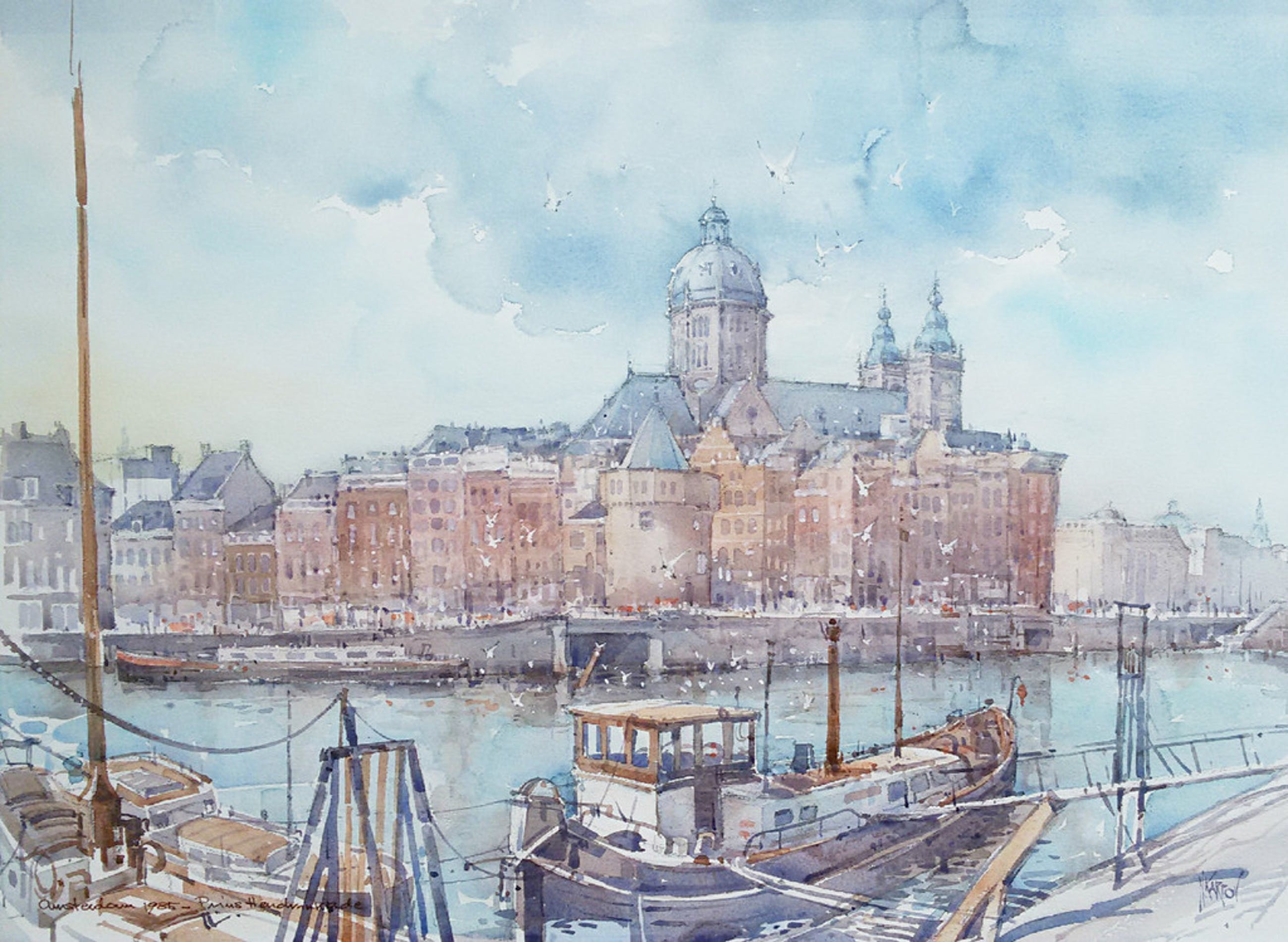 Mooi, groot stadsgezicht van Nenad Karpov uit 1985. Aquarel op papier, handgesigneerd, getiteld en gedateerd. Afkomstig uit de kunstcollectie van ABNAMRO, in goede conditie. Werk heeft ingelijst gezeten want er zitten taperesten bovenaan het blad en er is een verkleuring binnen een voormalig passe-partout (bovenaan en rechts). Ingelijst met nieuw passe-partout is het werk uitstekend.
