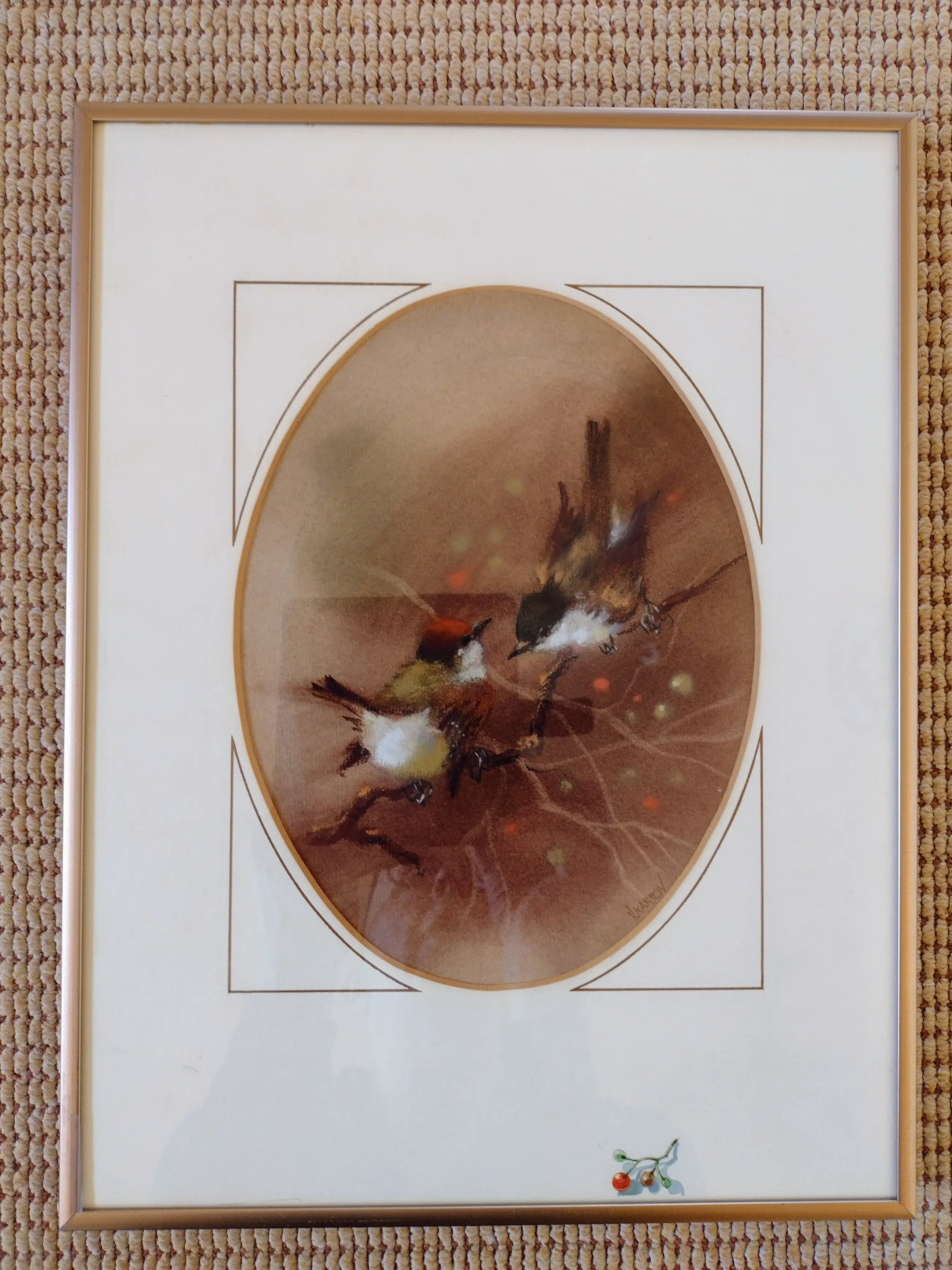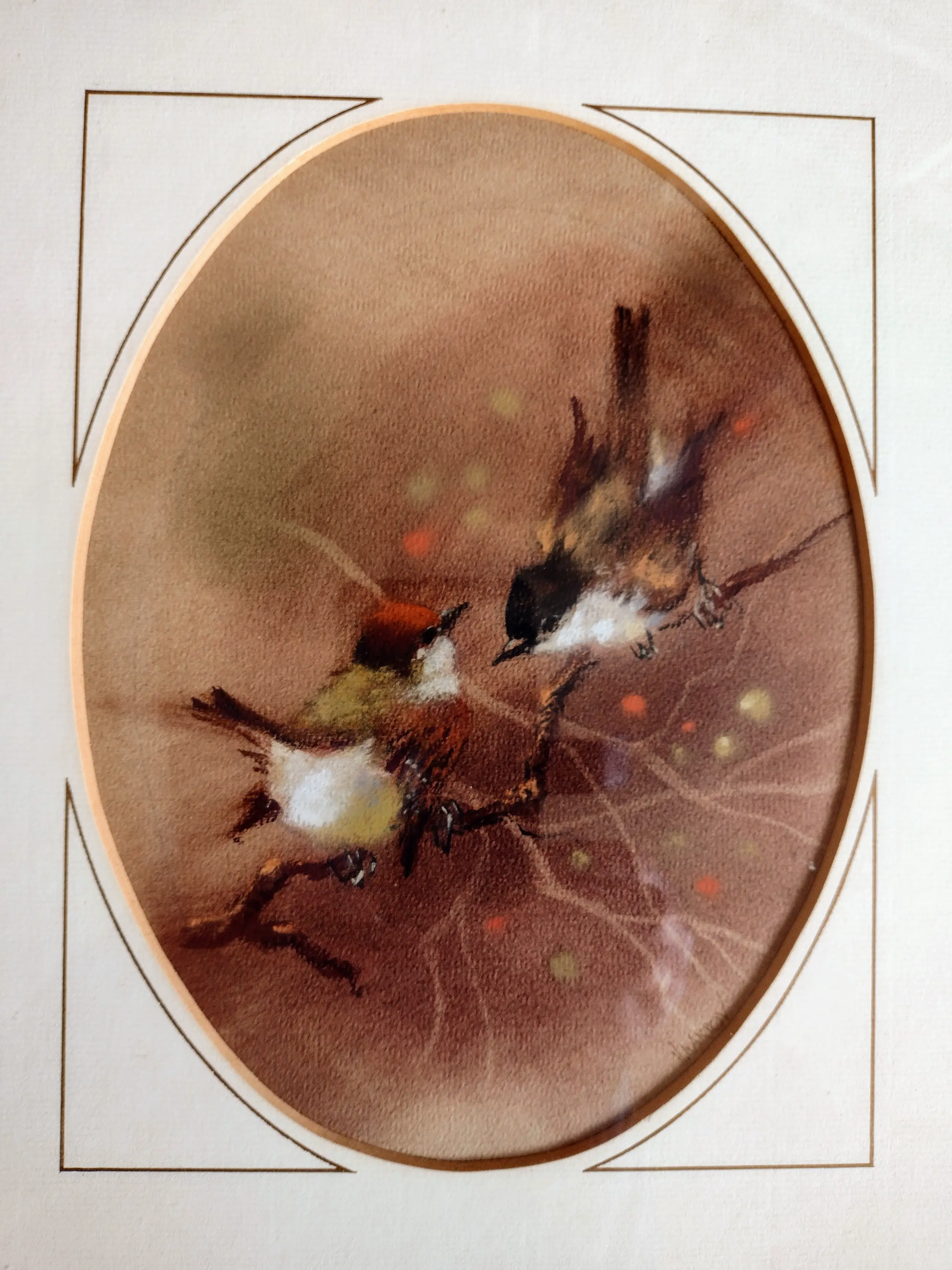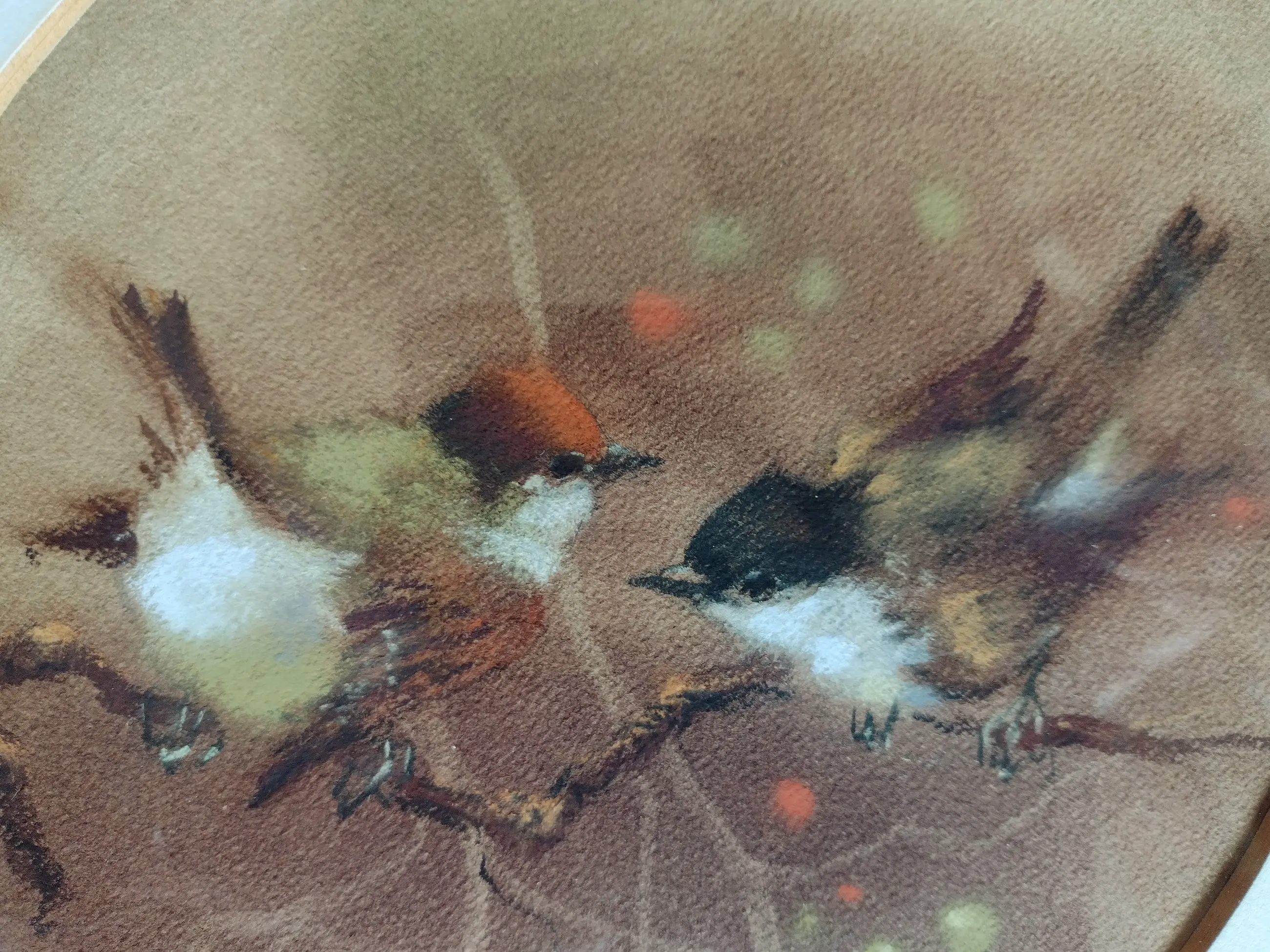 Mooie pastel van deze (van geboorte) Joegoslavische kunstenaar. Gelijst in mooi passe-partout en bijpassende koperkleurige lijst. Voorstelling is een paartje zwartkop mezen ("SYLVIA ATRICAPILLA").