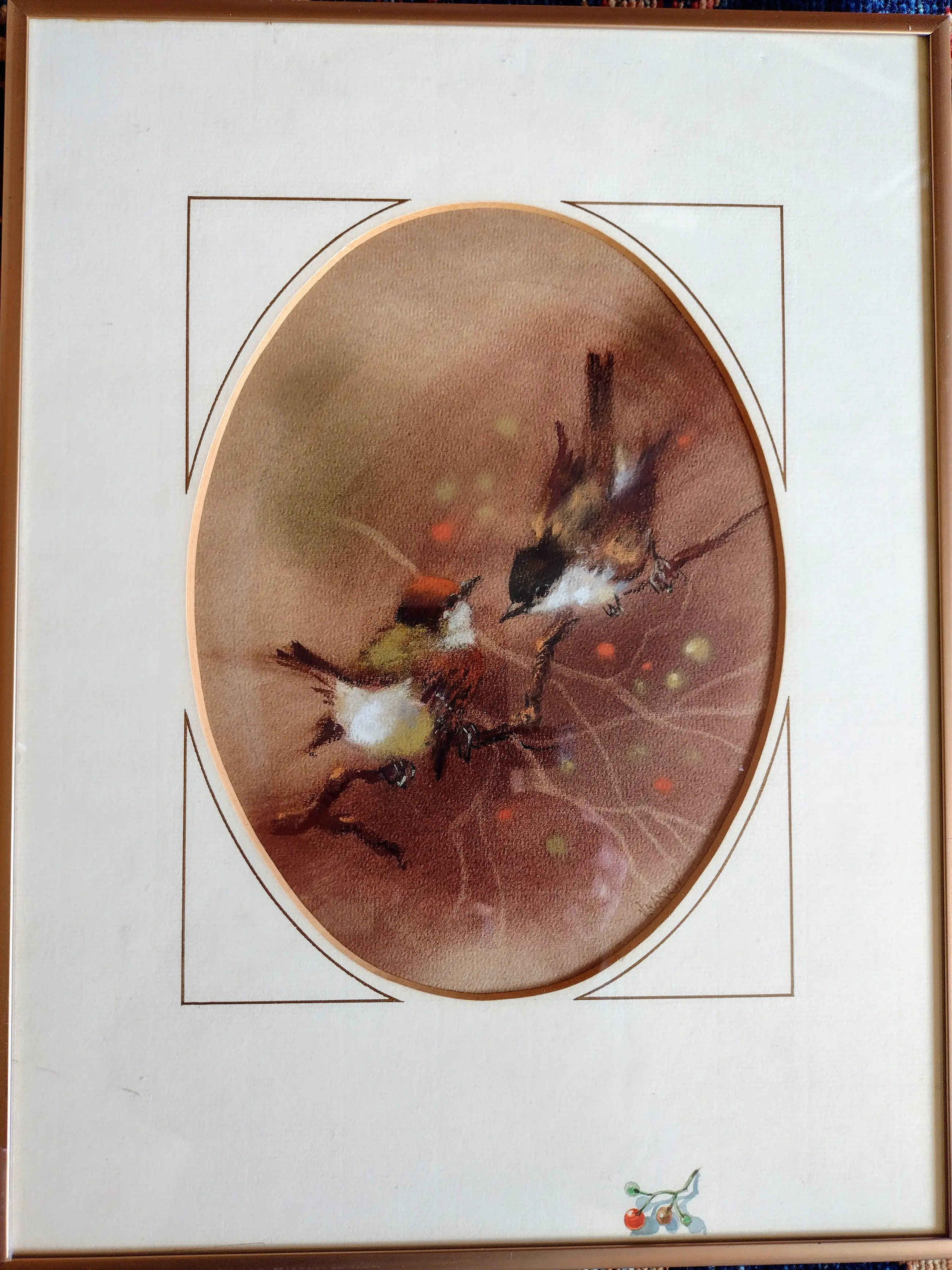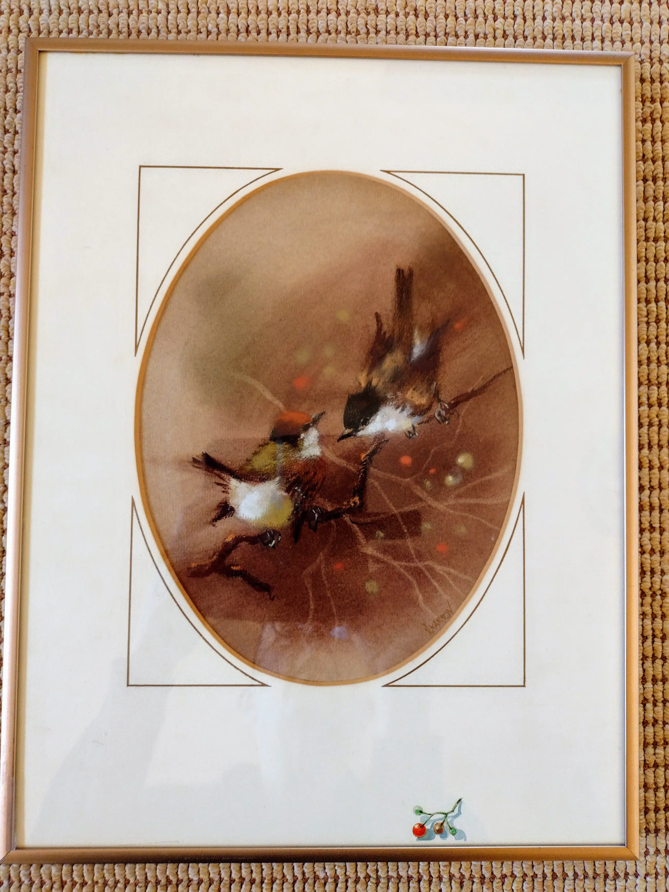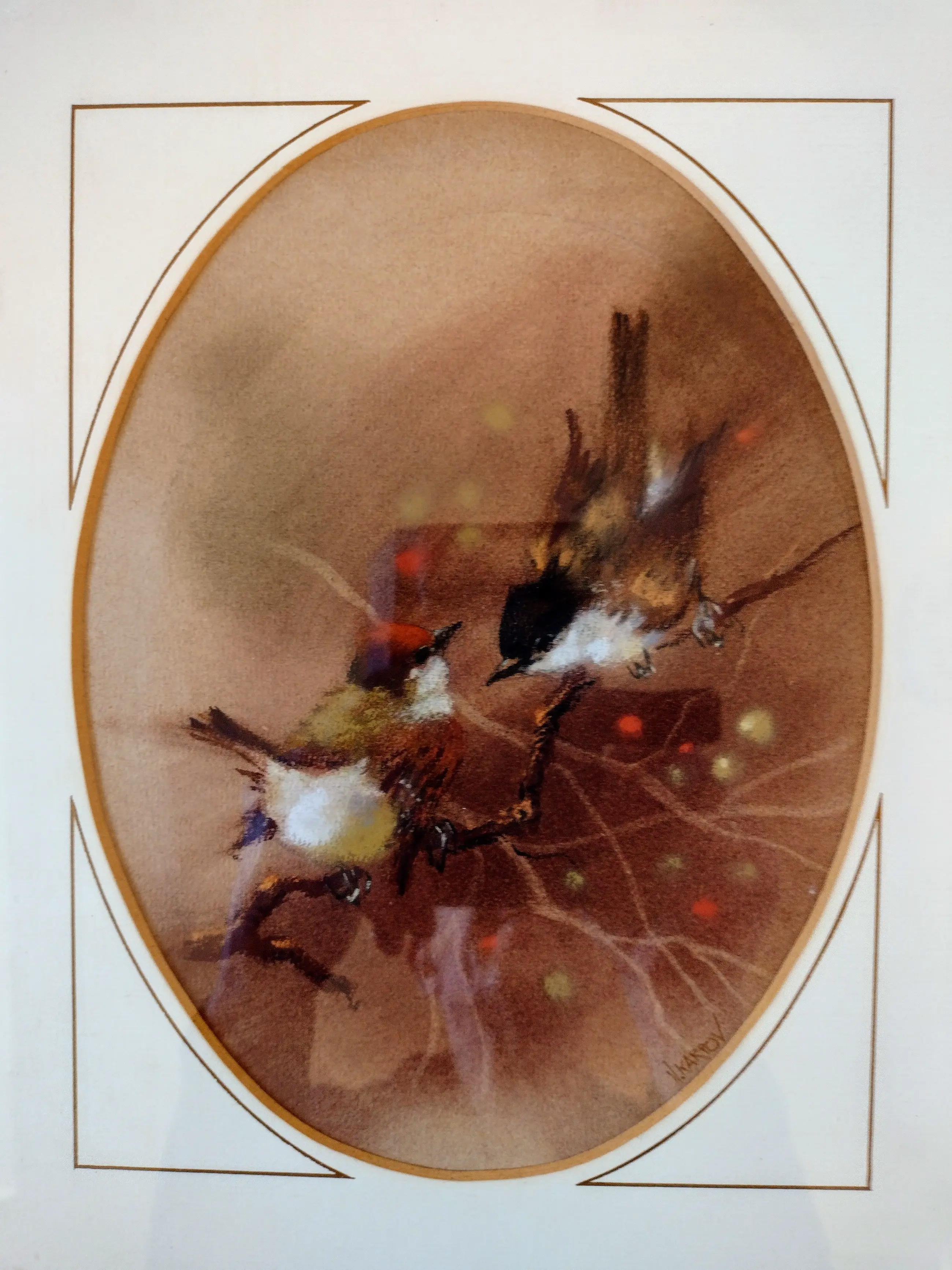 Mooie pastel van deze (van geboorte) Joegoslavische kunstenaar. Gelijst in mooi passe-partout en bijpassende koperkleurige lijst. Voorstelling is een paartje zwartkop mezen ("SYLVIA ATRICAPILLA").