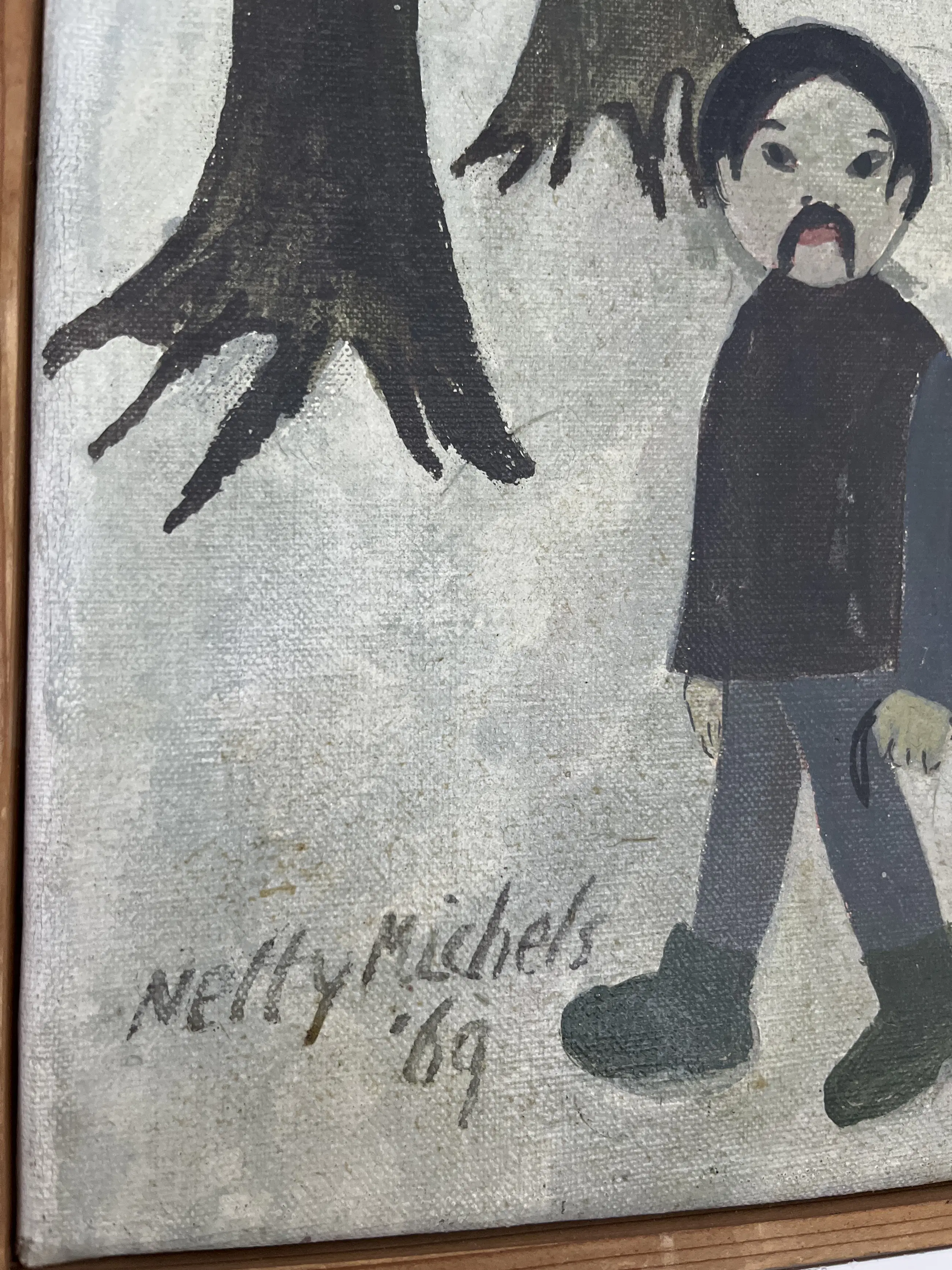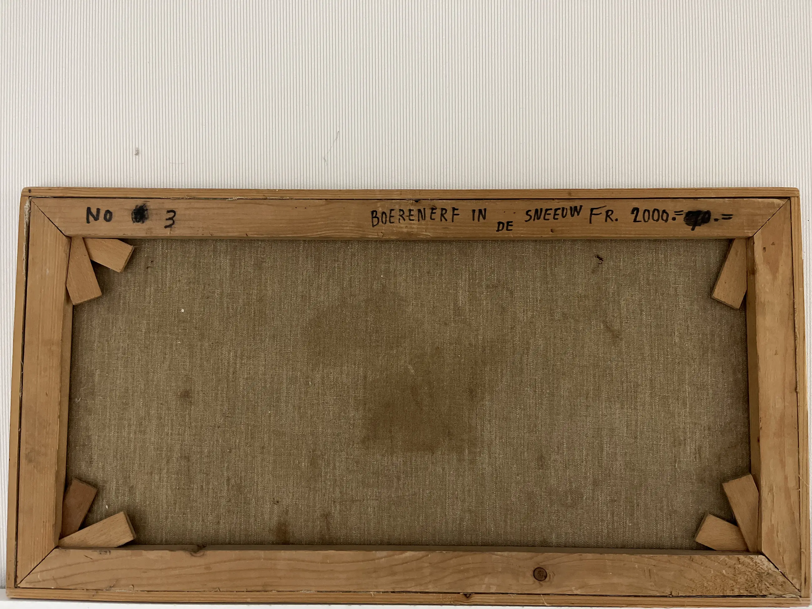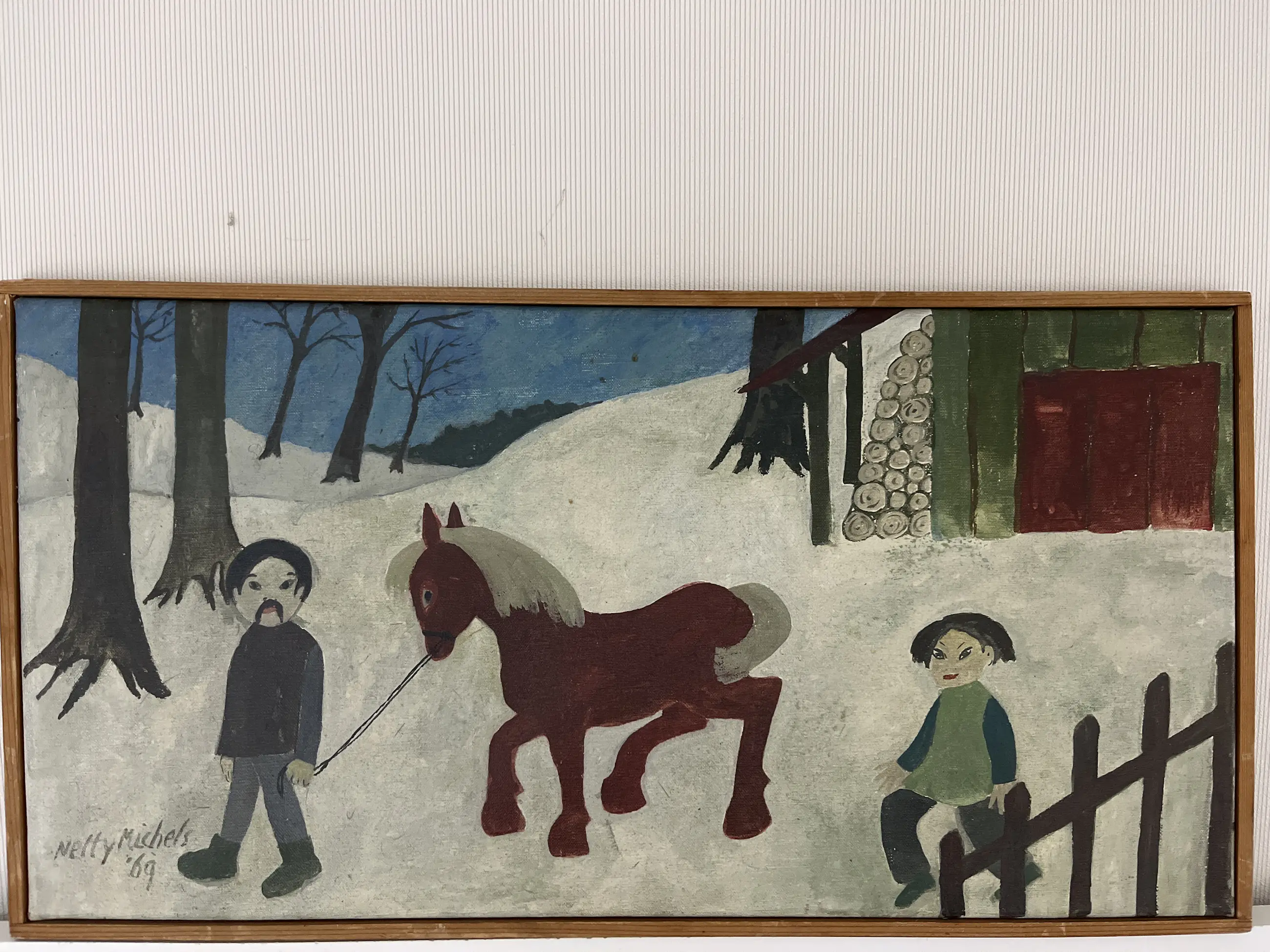 Het schilderij toont een winters tafereel in een bos. Twee kinderen lopen buiten: één jongen houdt een paard vast aan een touw, terwijl een ander kind op een hek zit te kijken. Op de achtergrond staan kale bomen, een besneeuwde heuvel en een huisje. De sfeer is rustig en eenvoudig, met zachte kleuren en een naïeve schilderstijl.