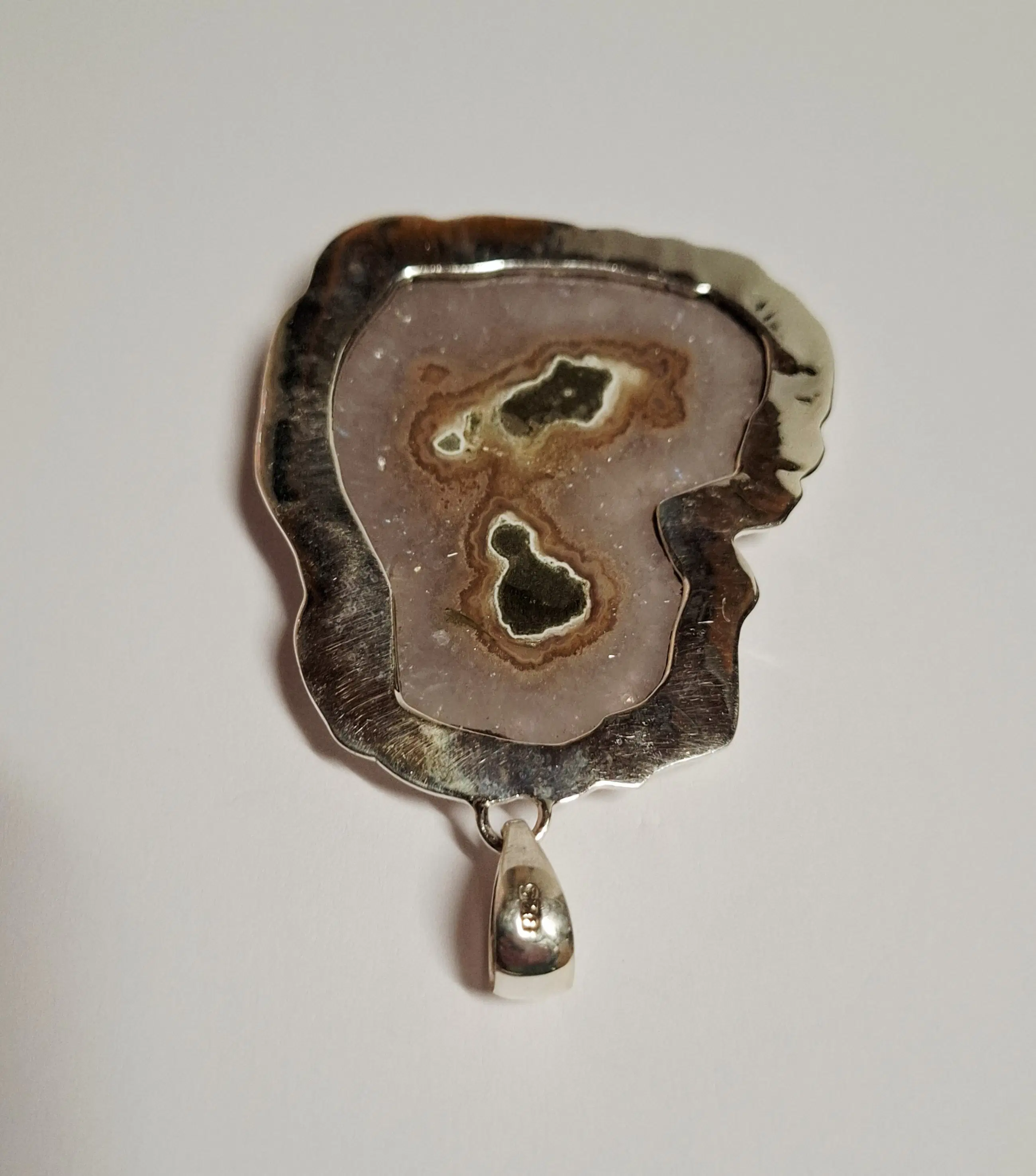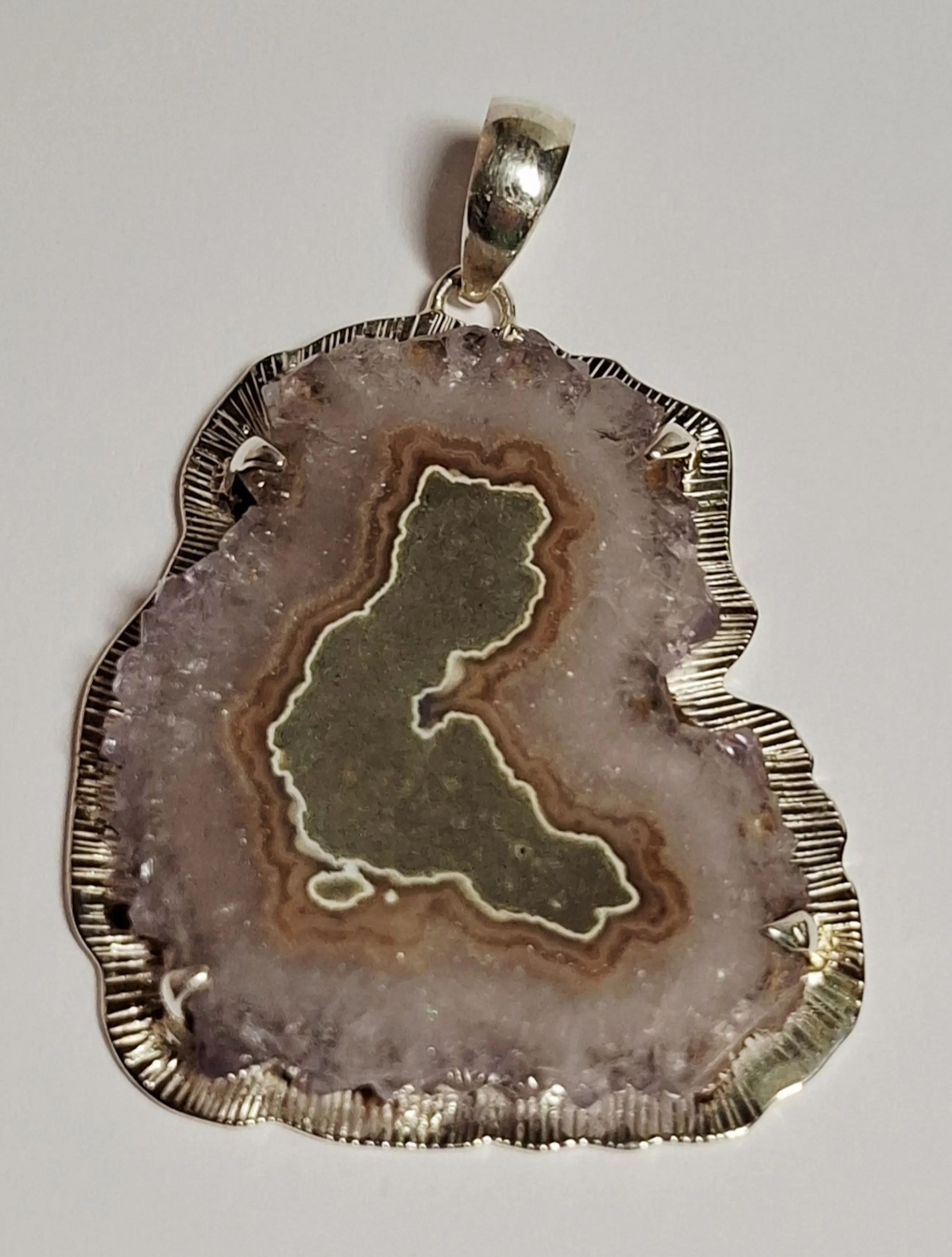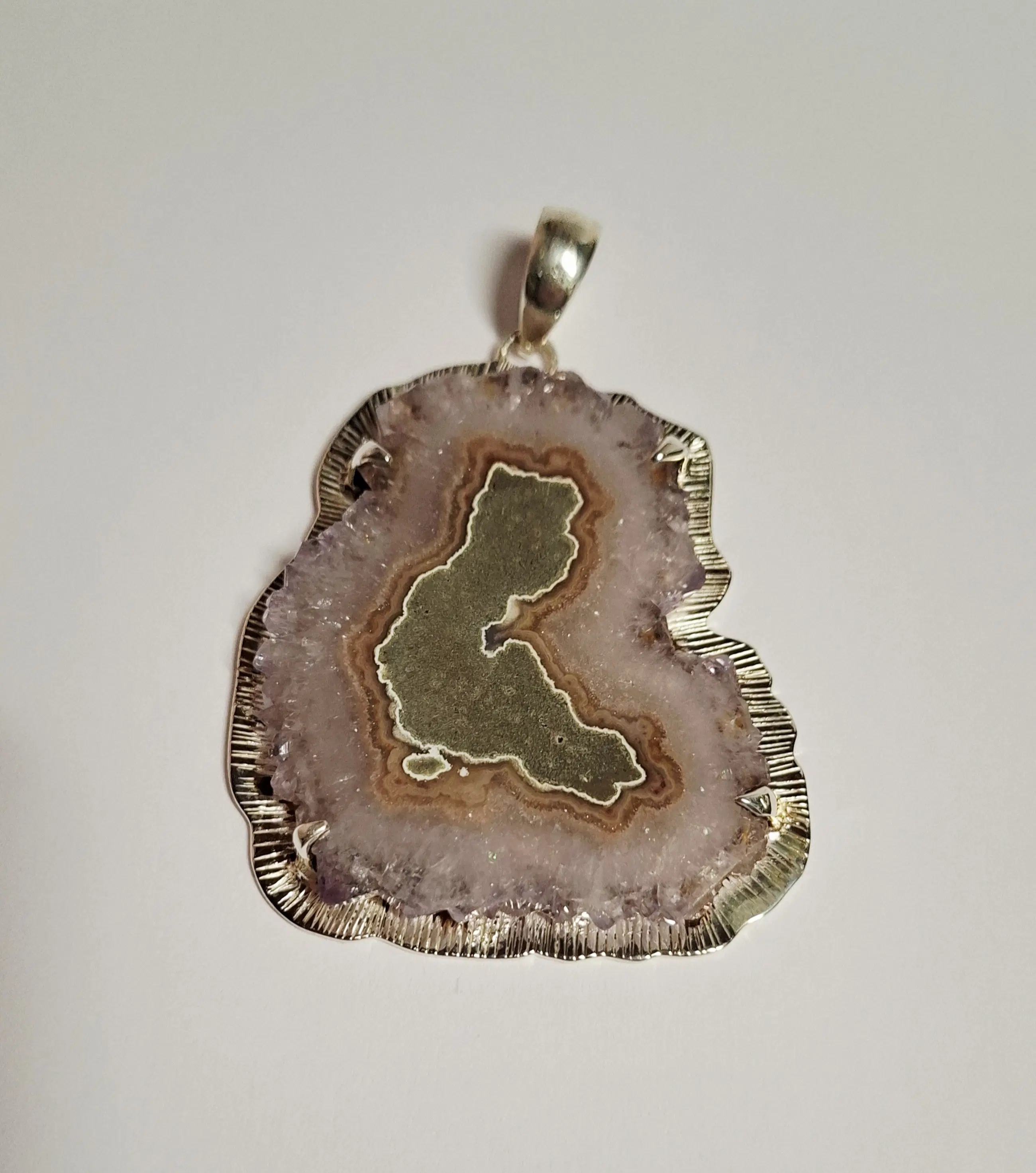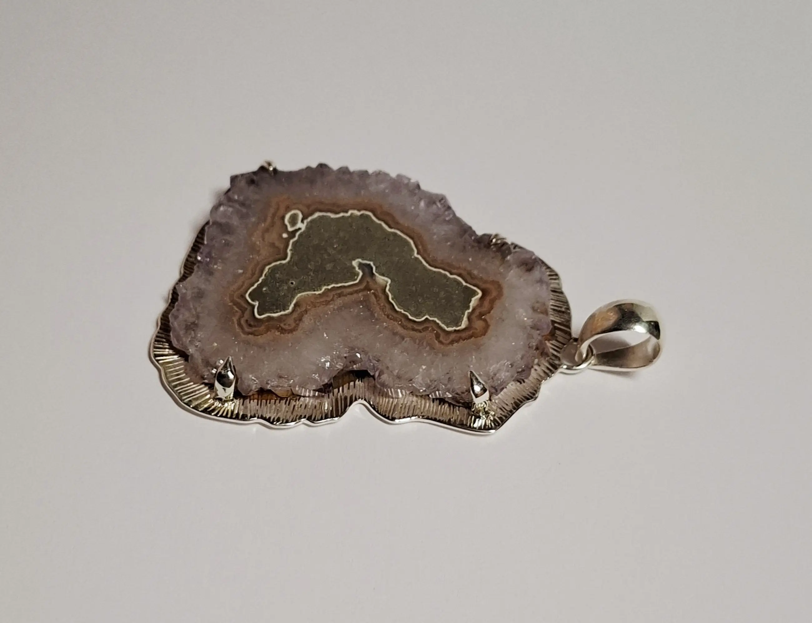 Nieuwe extra grote hanger met Amethist edelsteen aan twee zijden gepolijst met ruwe buitenrand in zilver gevat, Heel zeldzaam en exclusief en bijzonder