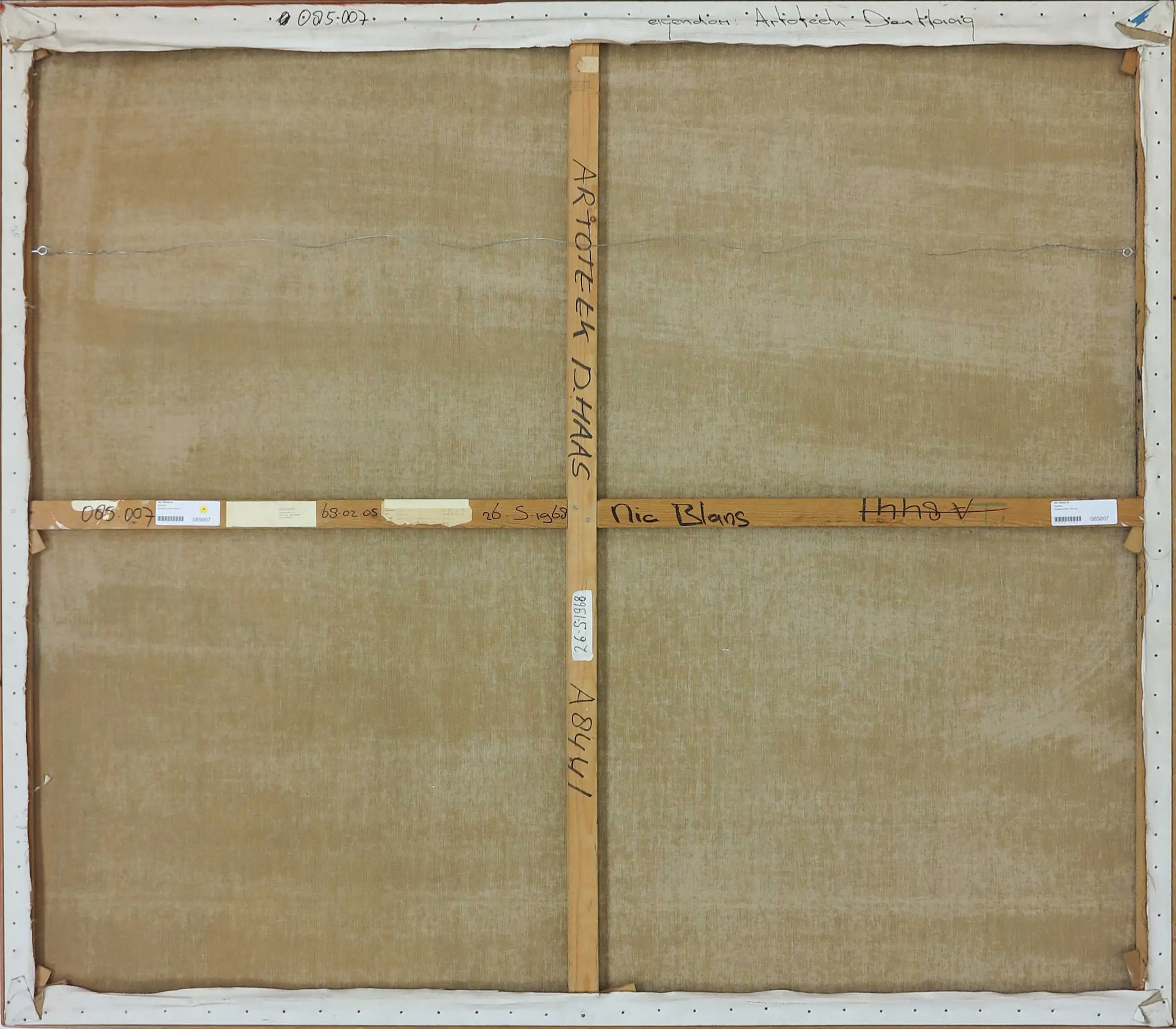 | Doek heeft een groot aantal butsen in het doek zitten en daarnaast op enige plekken wat craquelé. De witte partijen zijn wat vuil. De detailfoto's proberen een zo'n goed mogelijk beeld te geven van de huidige staat van het werk. | |