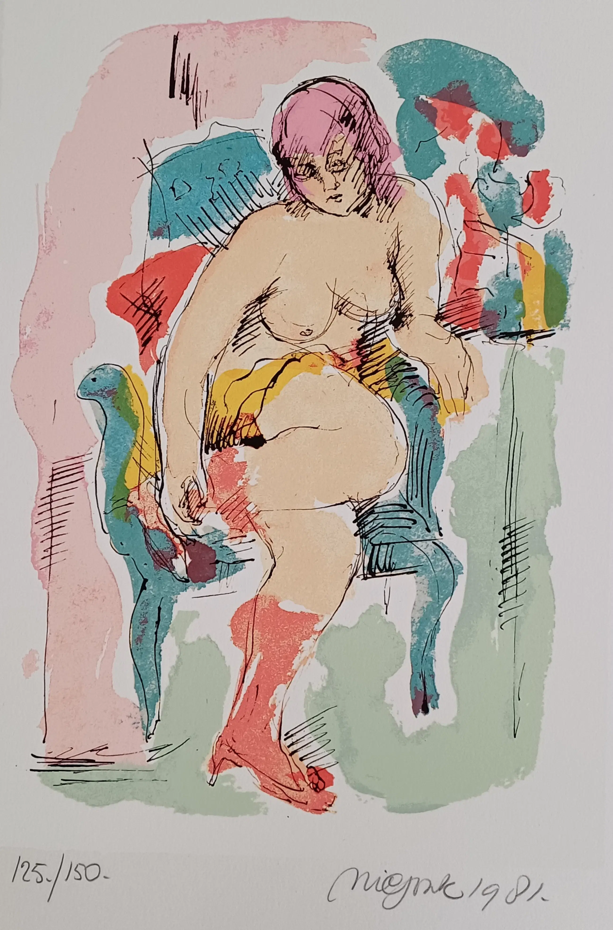 Gesigneerde zeefdruk van de kunstenaar Nic Jonk (1928-1994) uit 1981 met een oplage van 150 stuks. Rechtsonder is het werk gesigneerd in potlood. Linksonder 125/150. Papiermaat 55 x 45 cm. (hxb) In de witmarge zitten een paar kleine lichte vlekjes. (onder en rechterzijde) Verder is de zeefdruk in prima staat en is nooit ingelijst geweest.