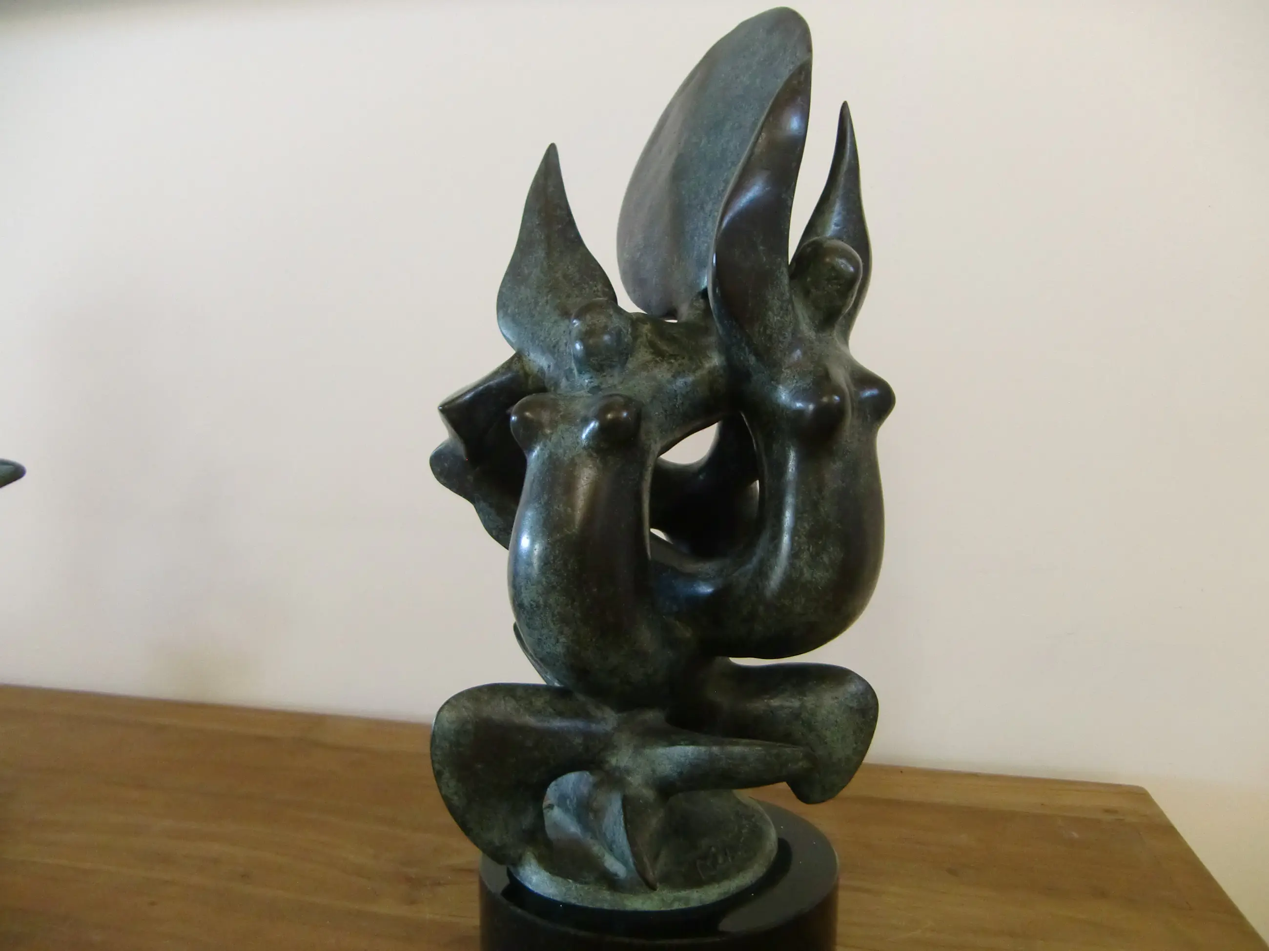 twee meerminnen die de zon boven hun hoofd dragen. de thema`s sirenen en meerminnen kwam regelmatig terug in het werk van Nic Jonk. Zoals ook de elementen water, zon , aarde en zijn gladde gepolijste vormen en het prachtige patine