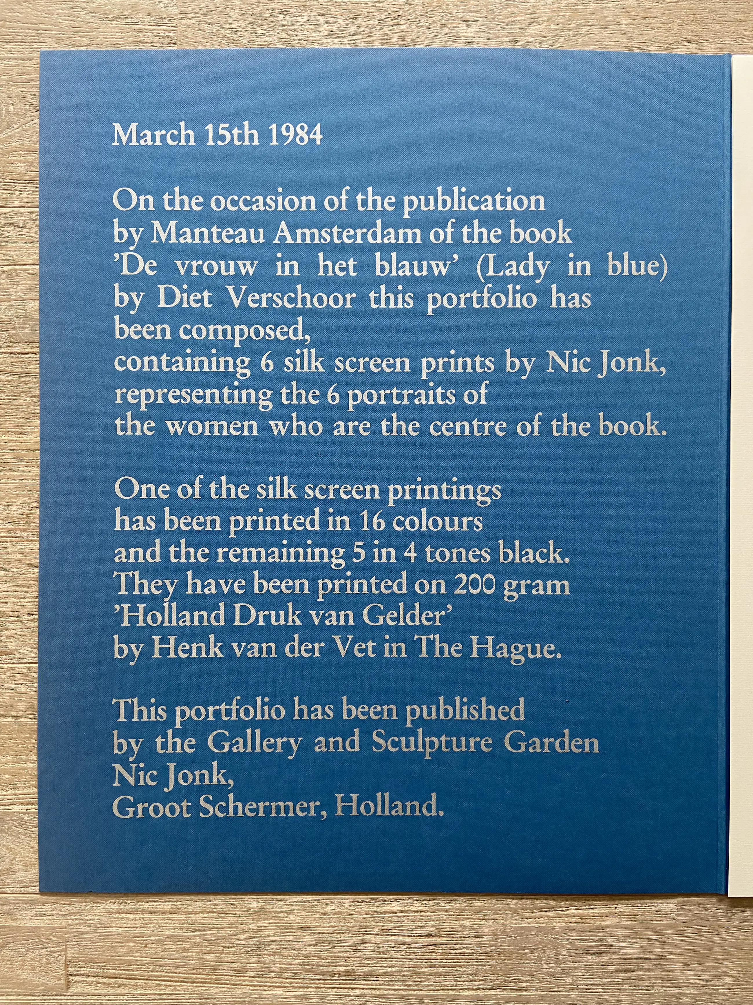 Jonk heeft de zes handgesigneerde portretten gemaakt voor de verhalenbundel ‘De Vrouw in het Blauw’ van Diet Verschoor uit 1984. Elk portret stelt één van de personages uit het boek voor.